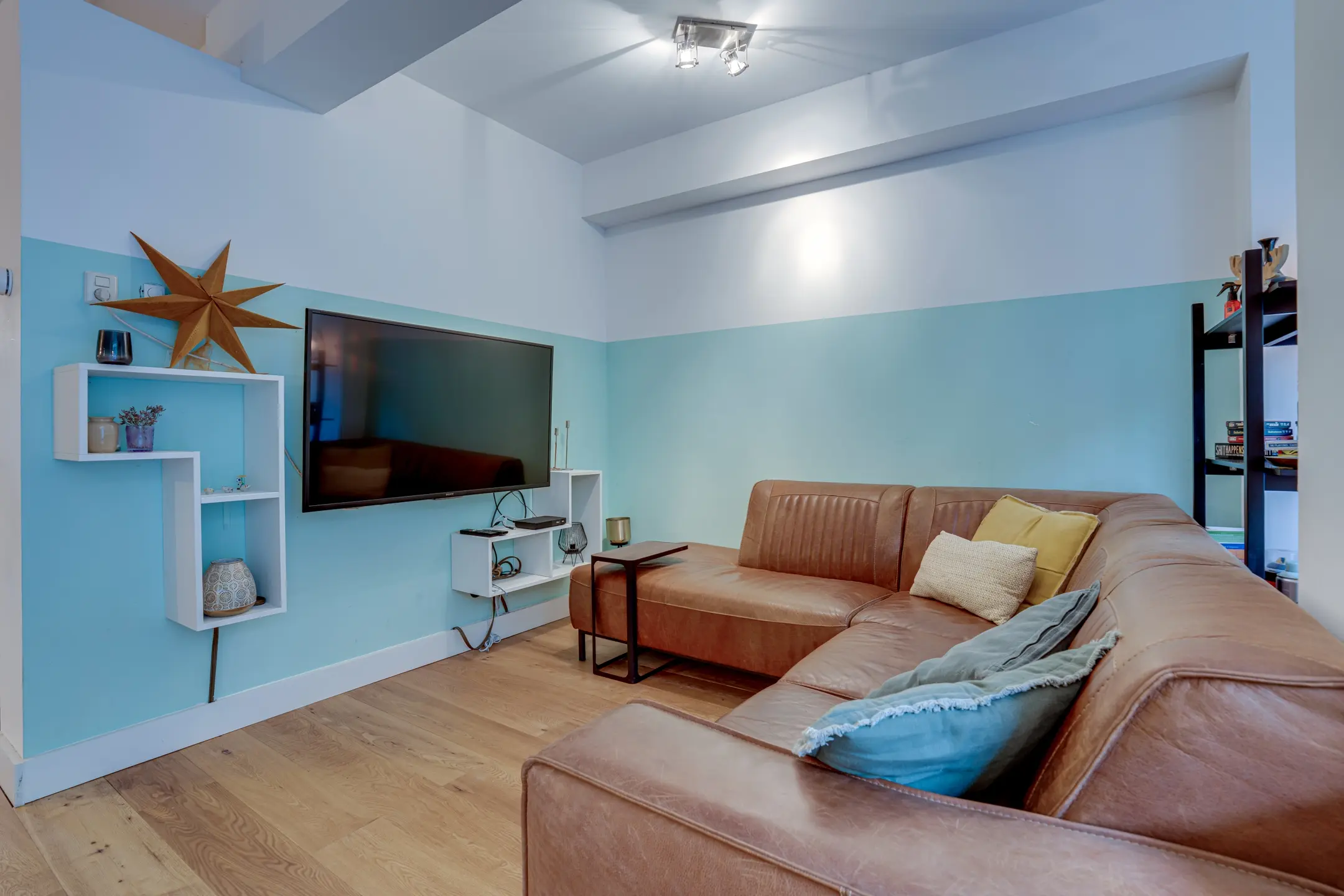 Spacious L-shaped living room with French doors leading to the east-facing backyard; Ceiling height is 2.66 meters.