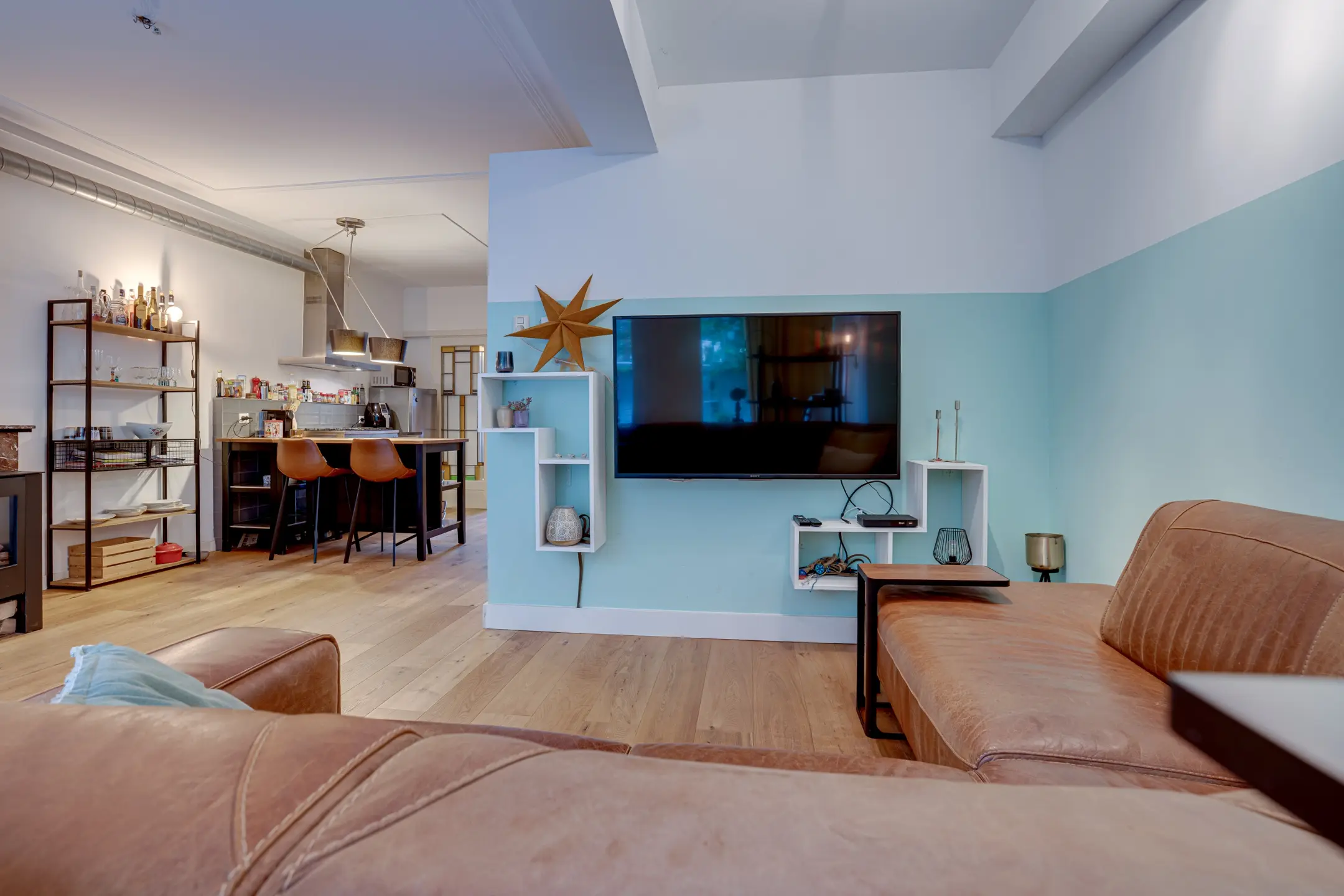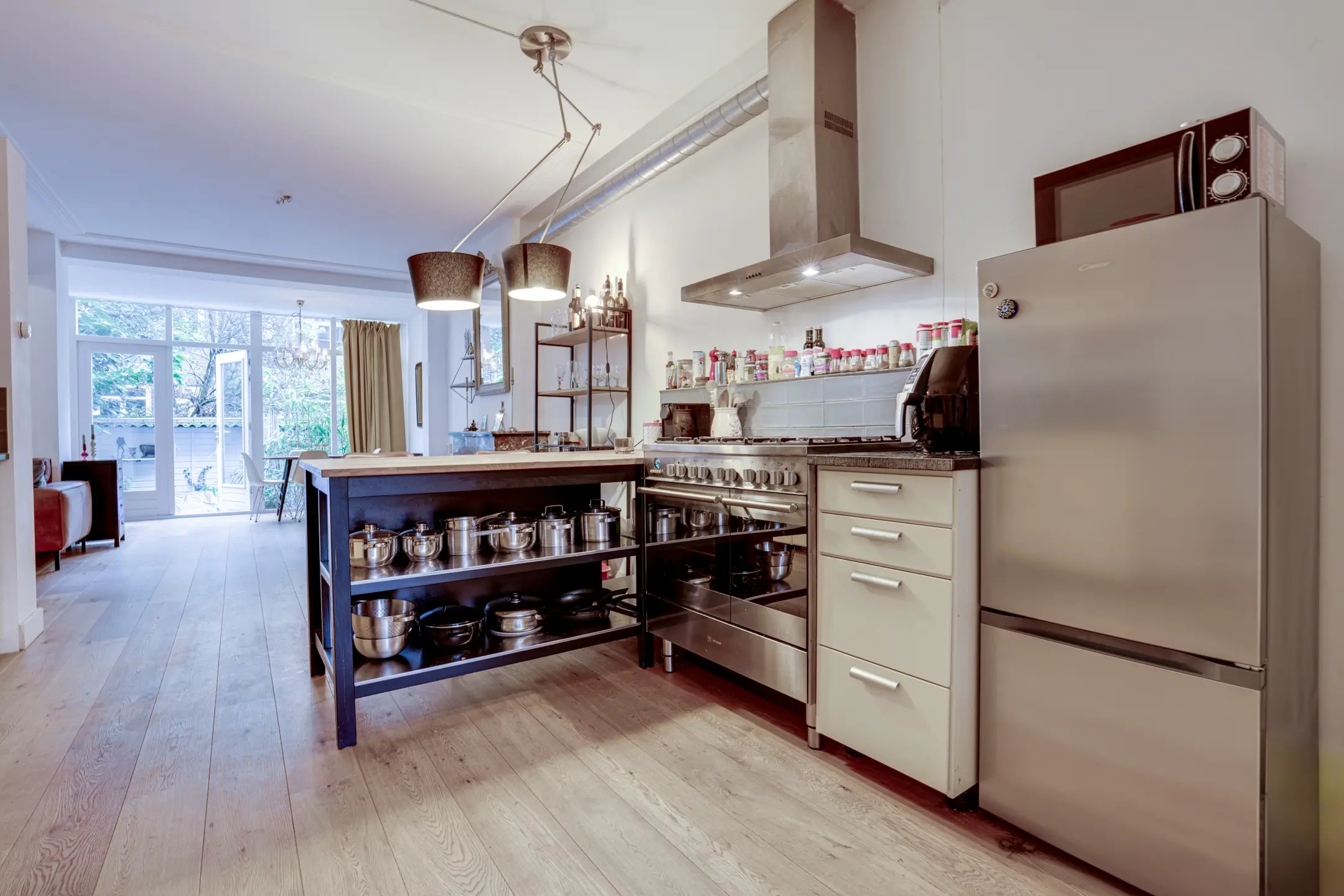 Open keuken (2017) beschikt over een 6 pitsgasfornuis met afzuigkap, vaatmachine, koelvriescombi en oven) ligt centraal in de woning,