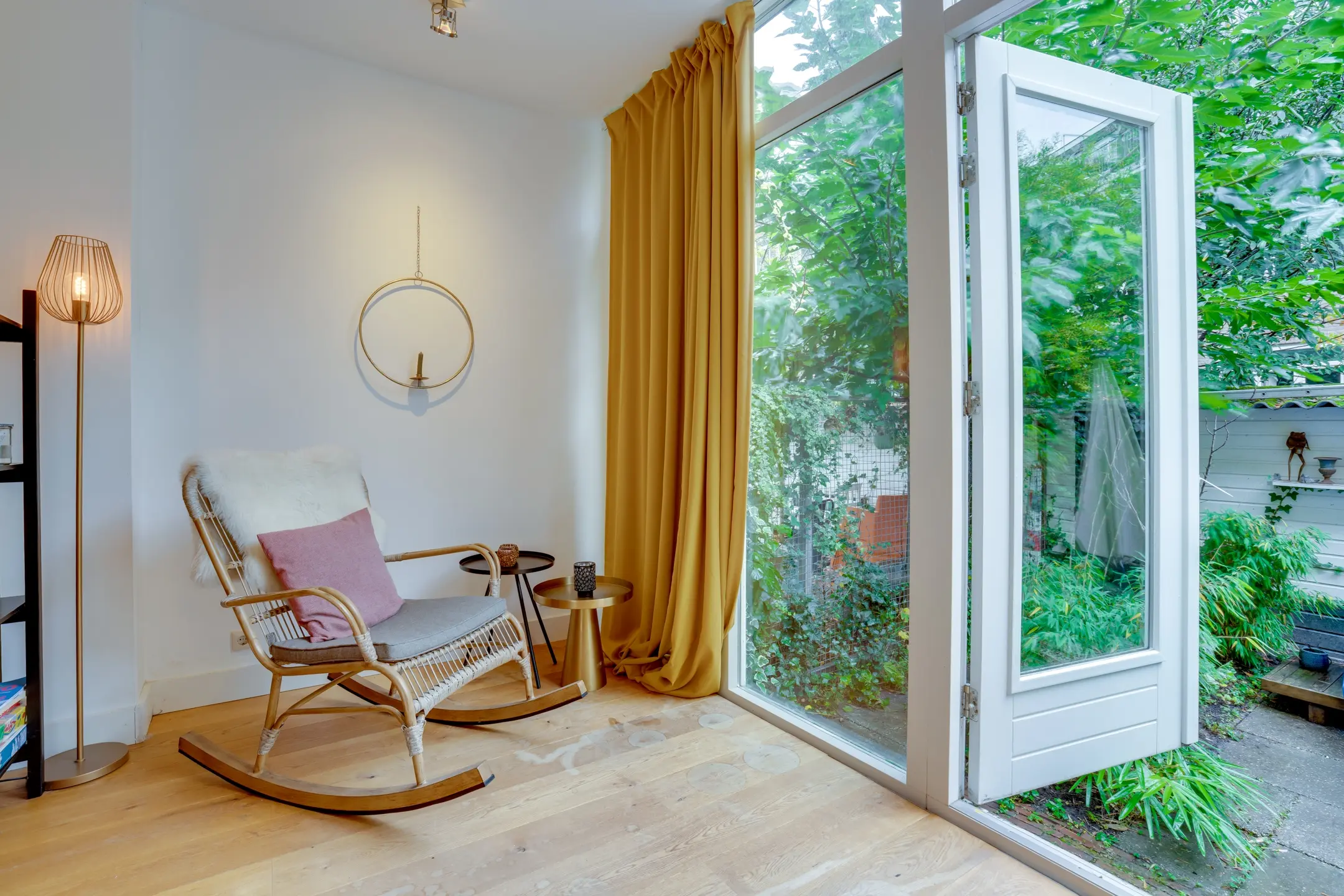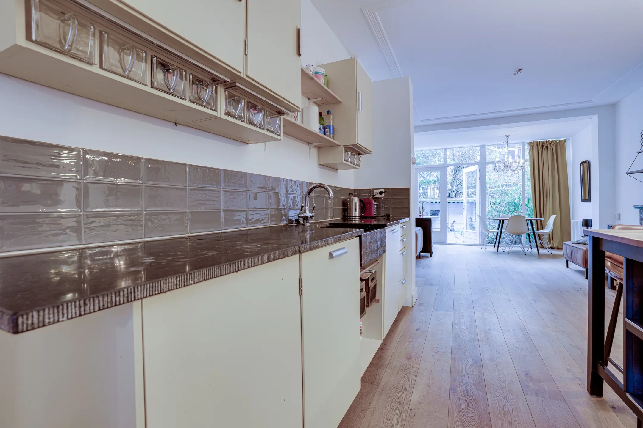 Ruime L-vormige woonkamer met openslaande deuren naar de achtertuin (oost ligging); plafondhoogte bedraagt 2.66 meter