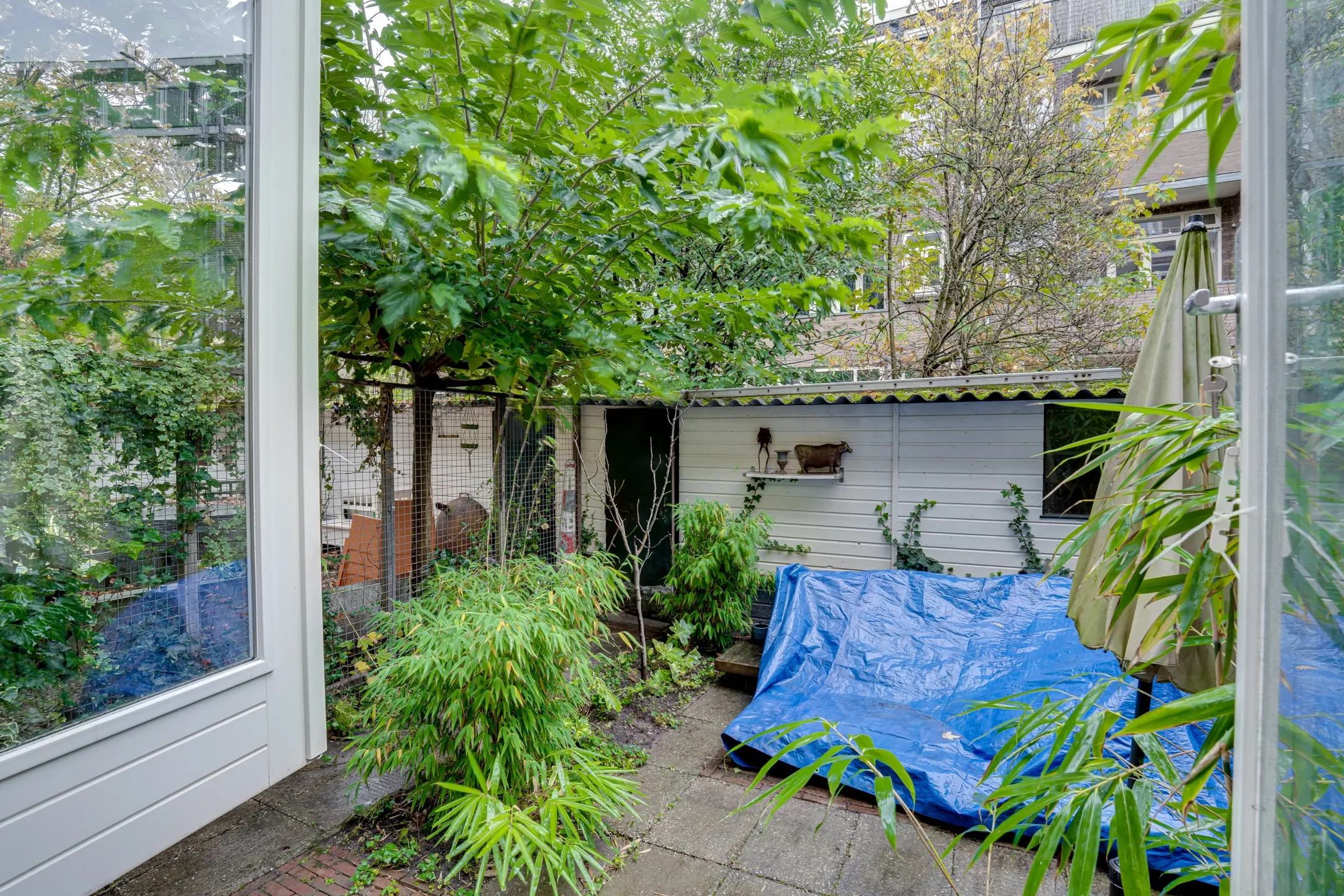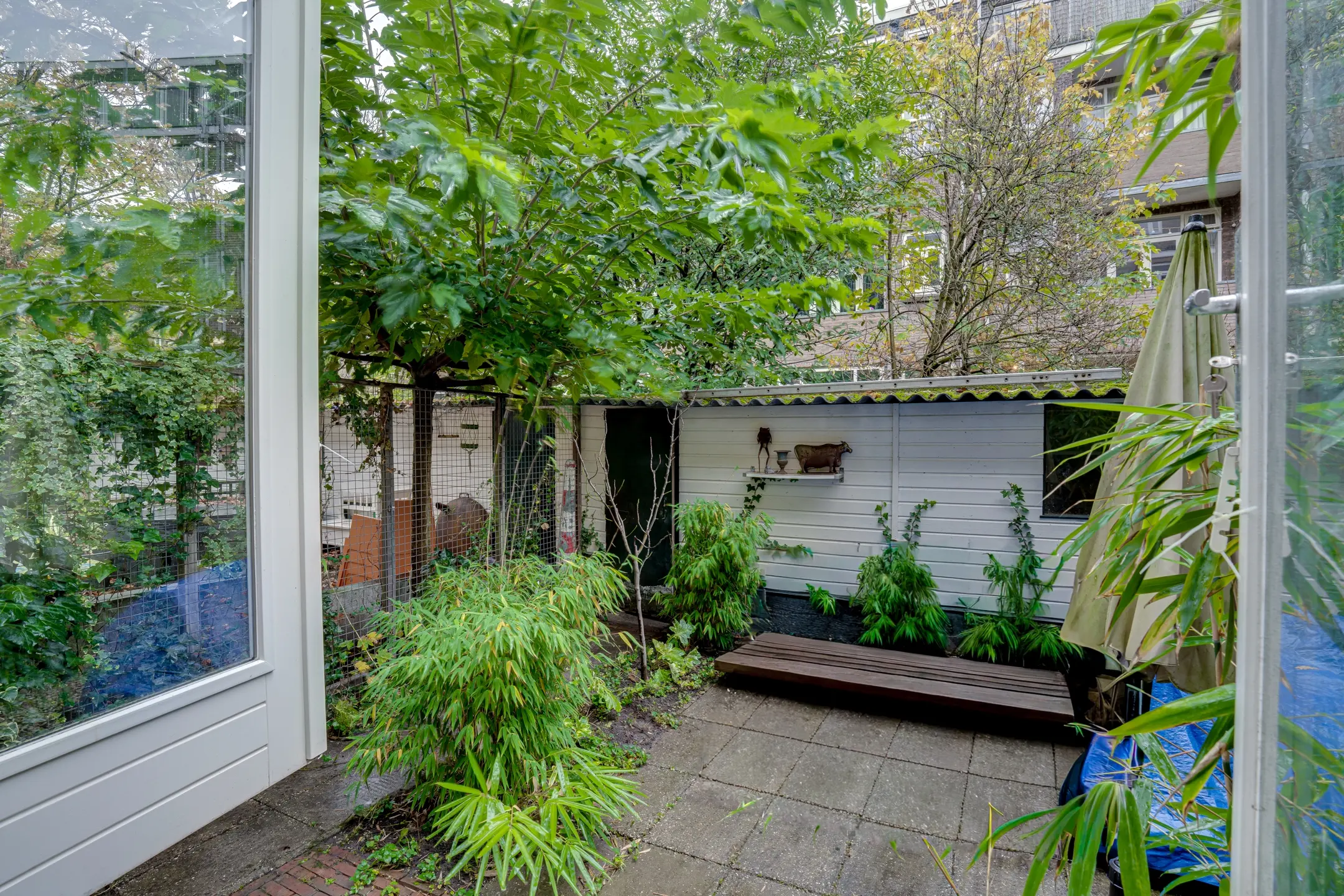 This 1933-built apartment offers 72m² of living space. The bedroom at the front overlooks the adjacent kitchen. The living room opens onto a full-width backyard (30m²), accessible through French doors. The wooden shed is approximately 8m².