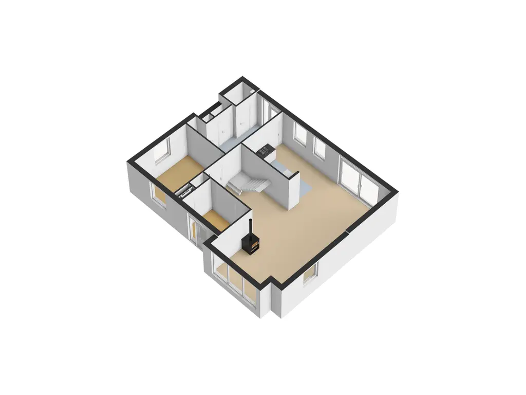 De woonkamer is royaal en licht dankzij de grote raampartijen met zicht op de tuin. De houtkachel vormt een sfeervol middelpunt — een plek waar straks nieuwe herinneringen kunnen ontstaan.