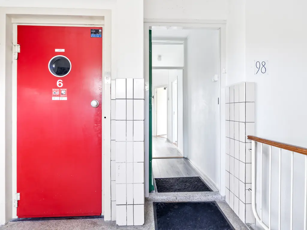 Toegang tot het complex wordt verkregen aan de achterzijde van het gebouw. De centrale hal (voorzien van brievenbussen en bellentableau) geeft toegang tot een afgesloten berging (5.5m²). Via trap en lift wordt de zesde verdieping bereikt.