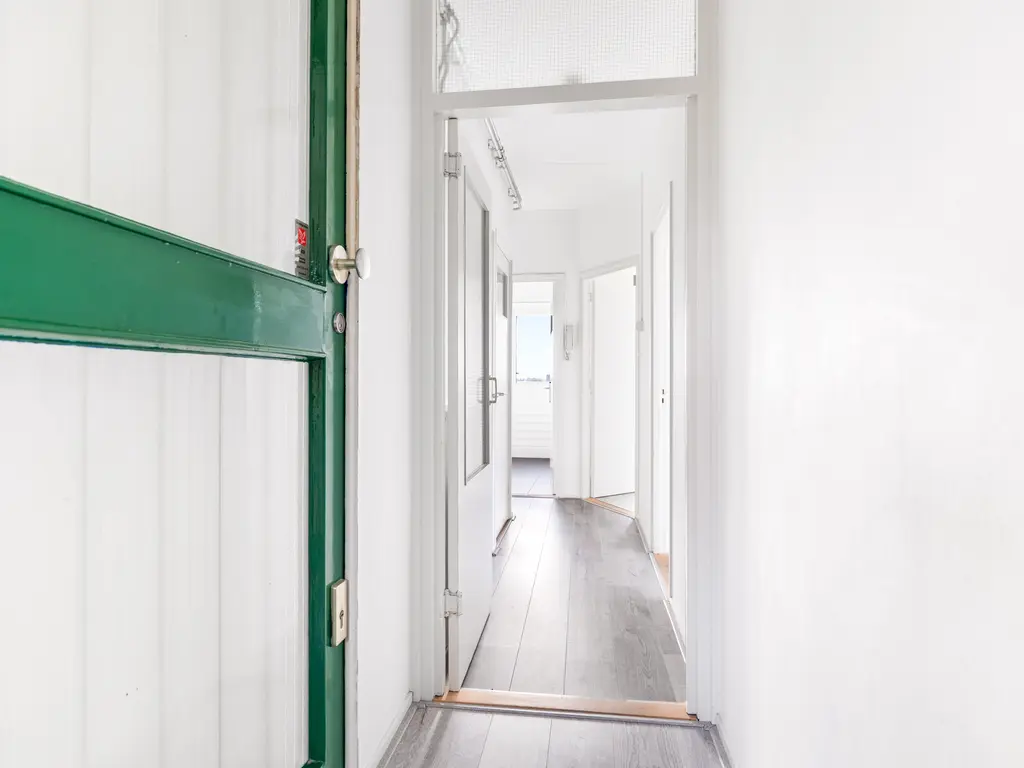 De ingang van dit appartement is inpandig en ligt aan het trappenhuis, niet aan de galerij. De hal geeft toegang tot alle vertrekken, waaronder de badkamer (voorzien van douchecabine en wastafel (meubel, meterkast en toilet. De woonkamer (17m²) en achtergelegen kamer van 14.5m² met 2 vaste kasten, beiden bereikbaar via de hal, worden gescheiden door openslaande (glazen) deuren. Deze kunnen eenvoudig door een vaste wand worden vervangen. Beide kamers beschikken over een balkon met gunstige zonligging. De aan de voorzijde gelegen keuken (4m²) is voorzien van een 4 pits gasfornuis, afzuigkap, koelkast en wasmachine aansluiting. Toegang tot het voorgelegen balkon met weids uitzicht wordt via keuken en woonkamer verkregen