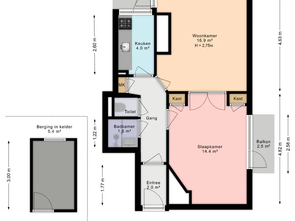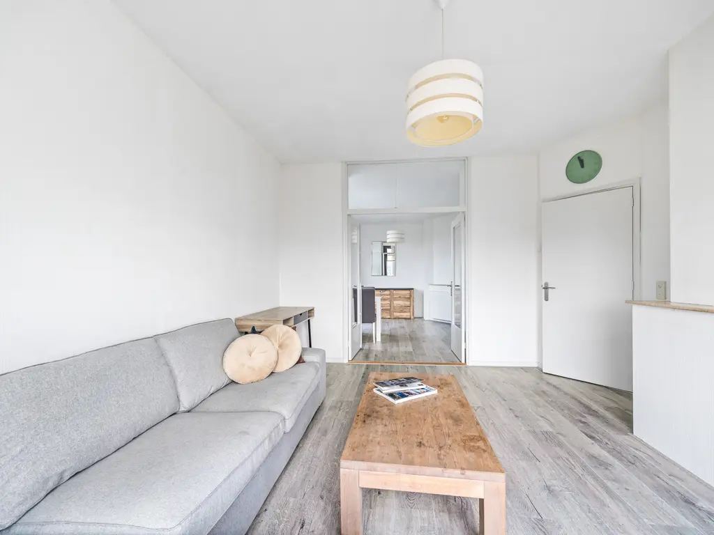 The entrance to this apartment is internal and located on the stairwell, not the gallery. The hall provides access to all rooms, including the bathroom (equipped with a shower and sink, a cabinet, meter cupboard, and toilet). The living room (17m²) and the rear room (14.5m²) with two built-in wardrobes, both accessible via the hall, are separated by French (glass) doors. These can easily be replaced by a fixed wall. Both rooms have a balcony with favorable sun exposure. The kitchen (4m²) at the front is equipped with a 4-burner gas stove, extractor hood, refrigerator, and washing machine connection. Access to the front balcony with expansive views is gained through the kitchen and living room.