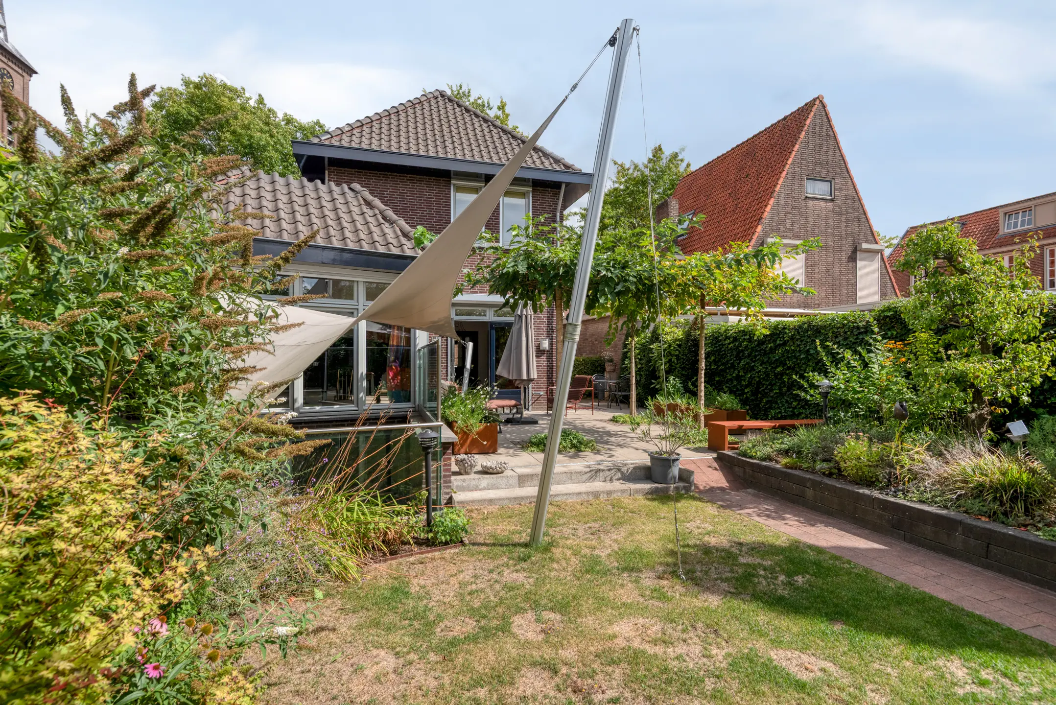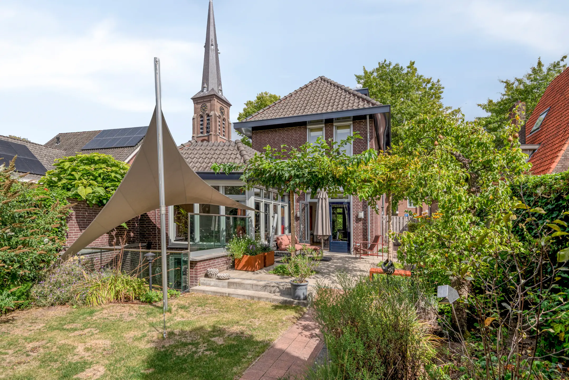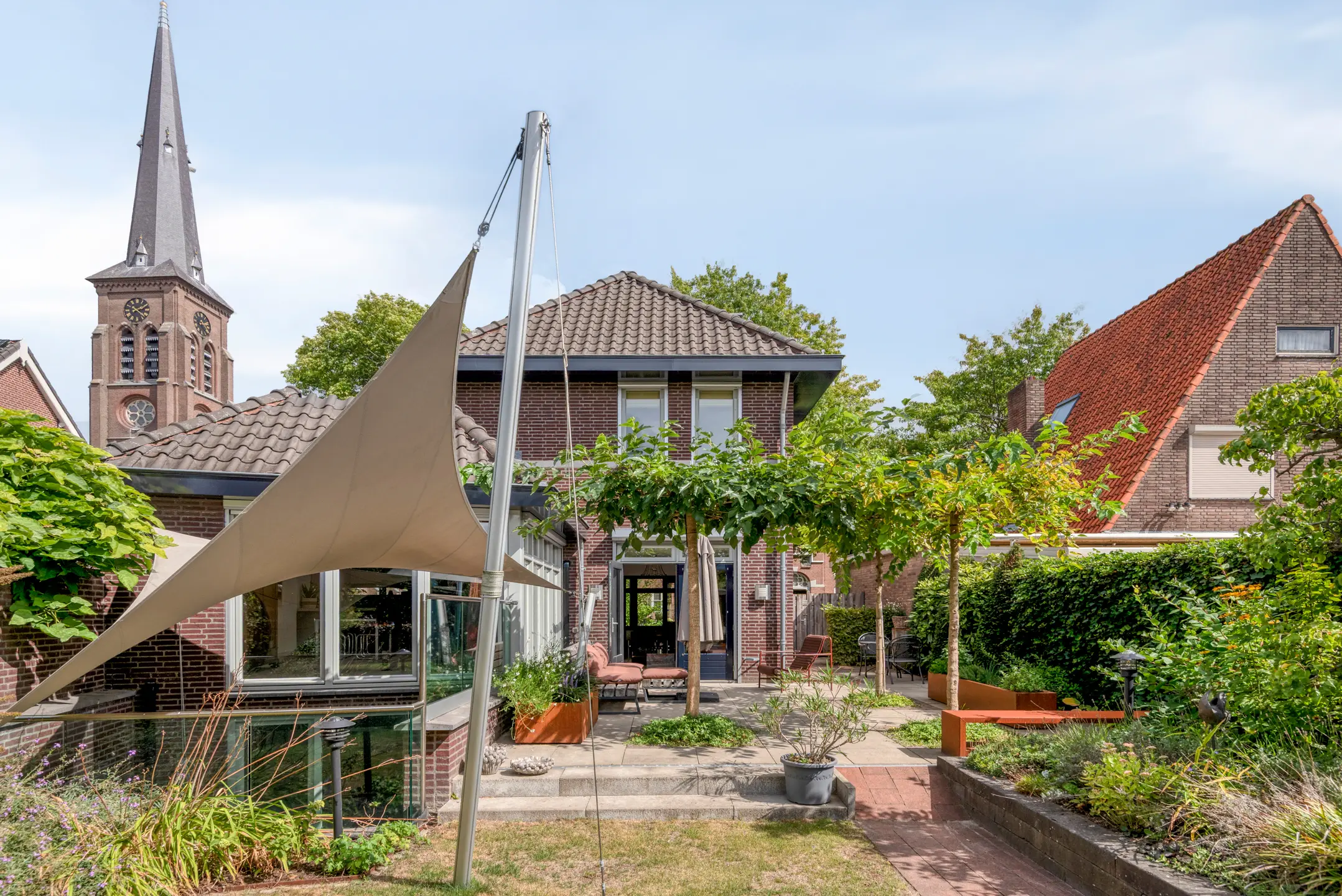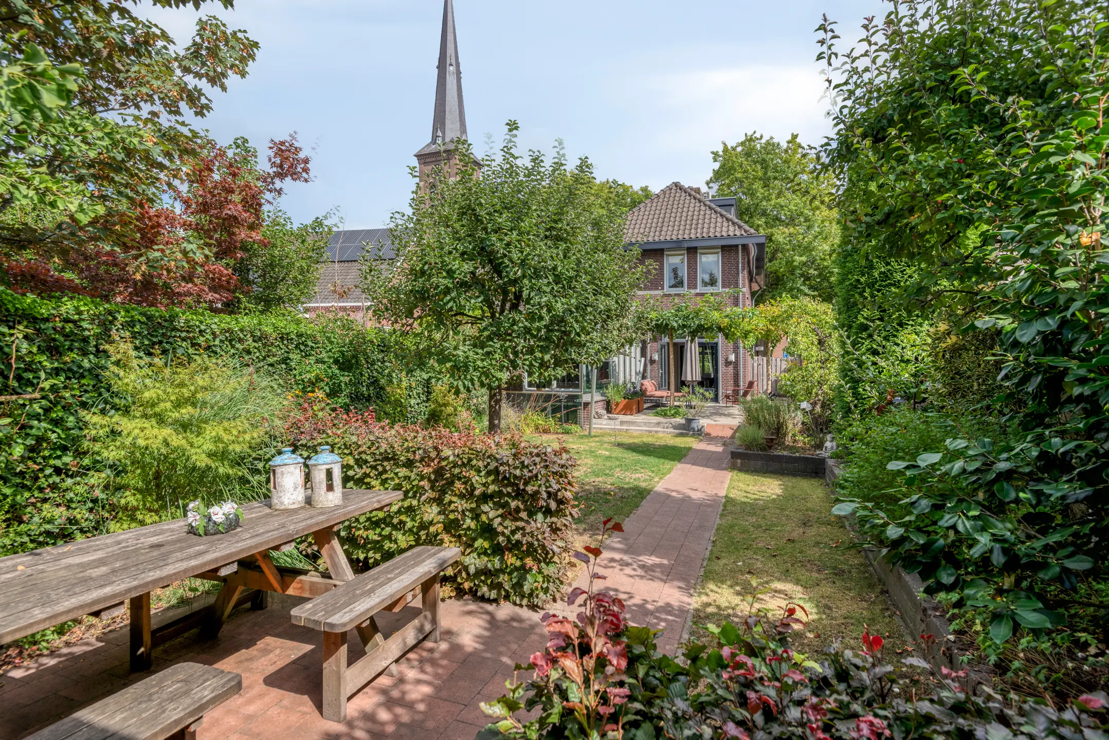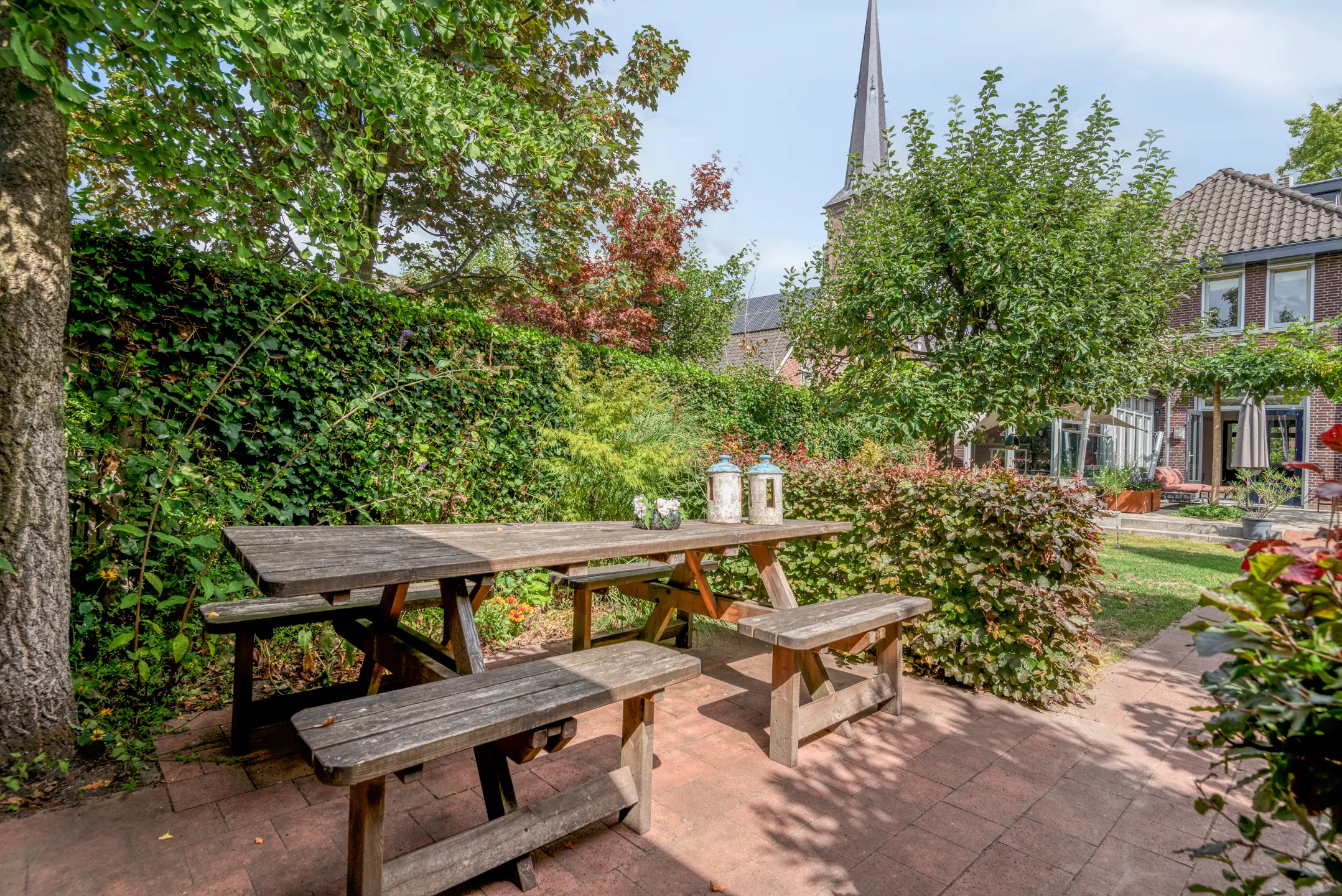 De tuin is een verborgen parel: groen, volwassen, met meerdere terrassen die uitnodigen tot lange zomeravonden. Hier heb je privacy, terwijl je tóch midden in het dorp leeft. Het uitzicht op de historische kerktoren geeft een bijna filmisch decor aan elke dag.