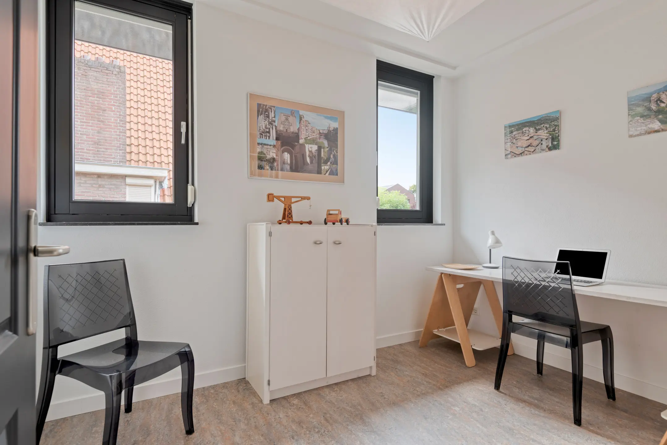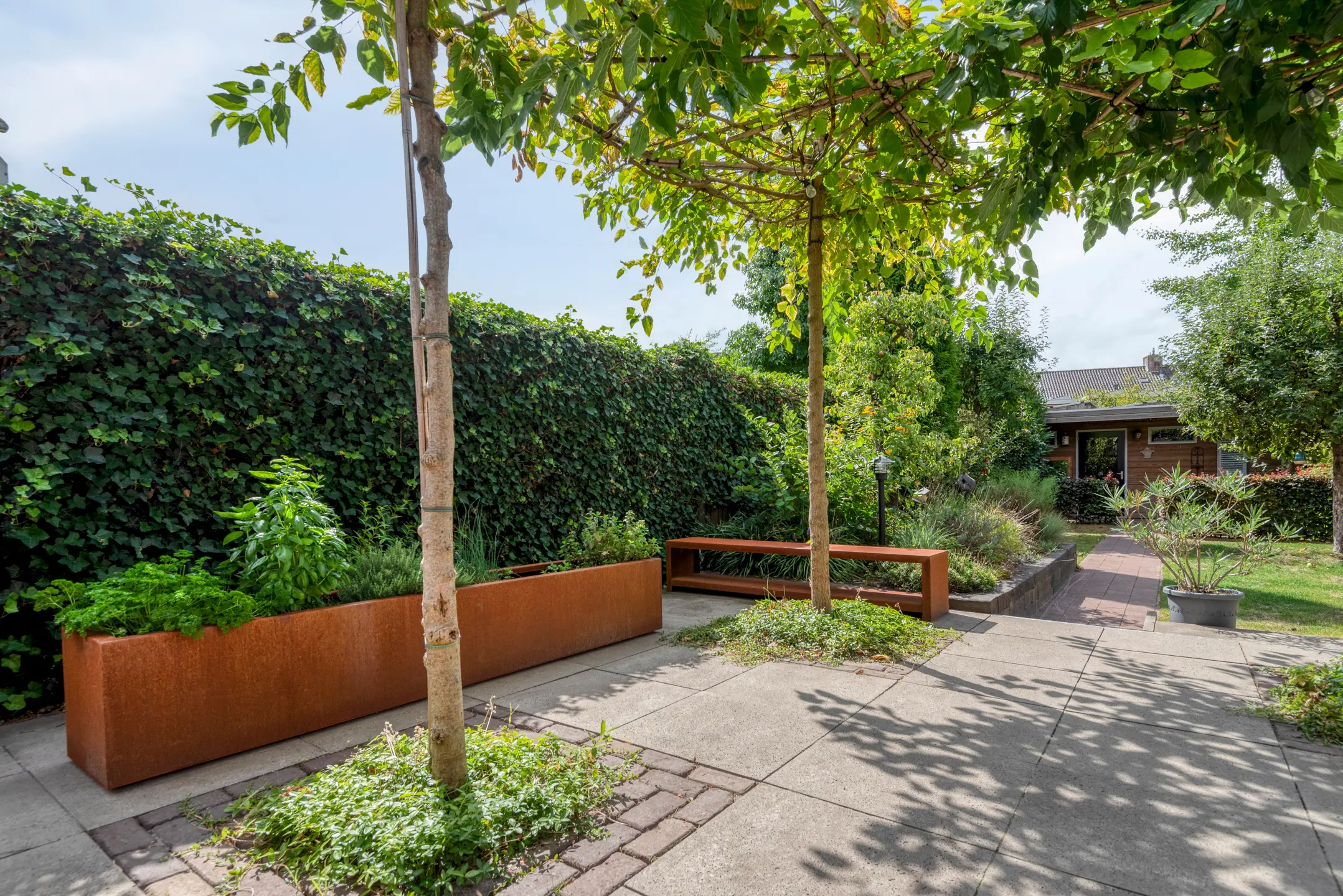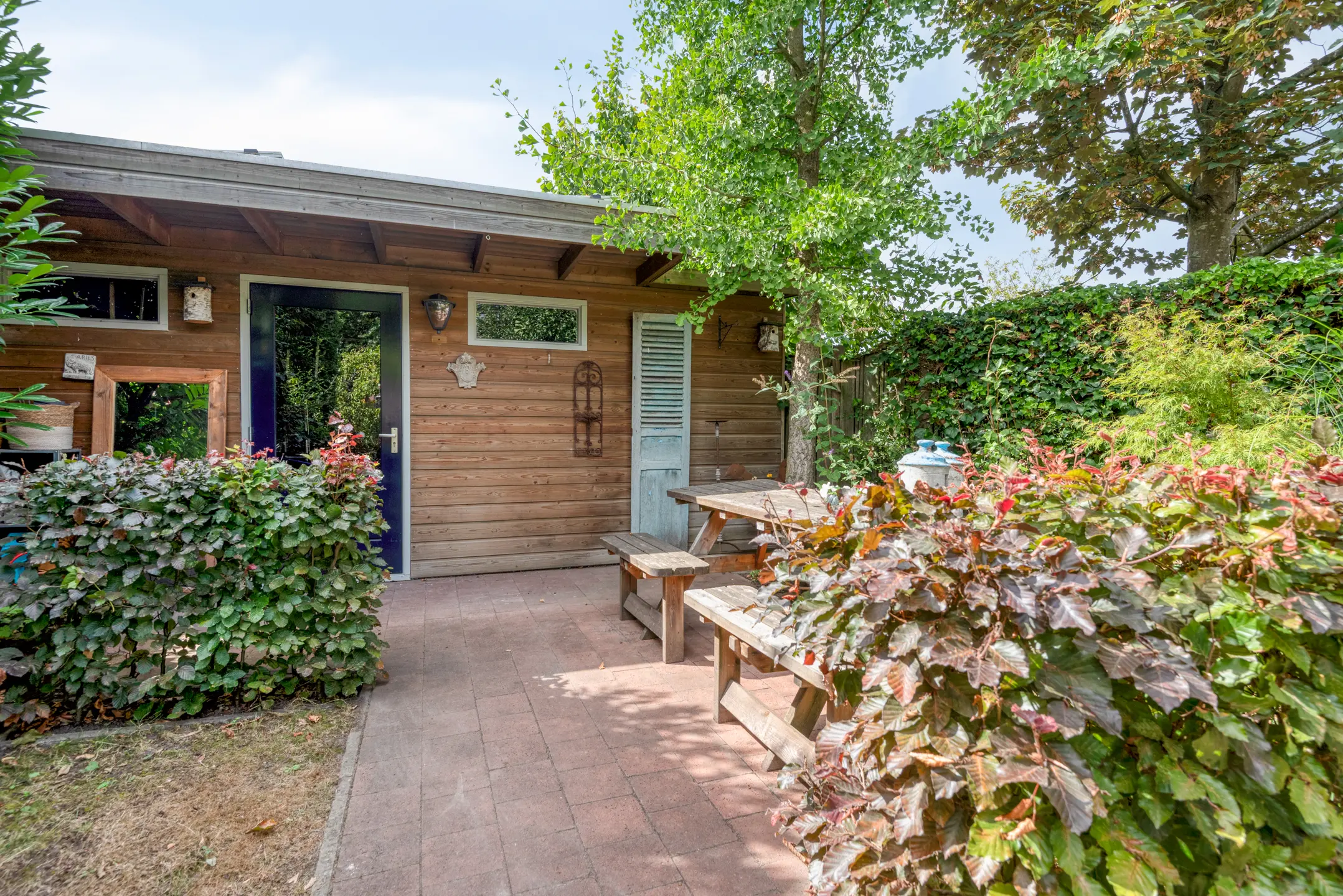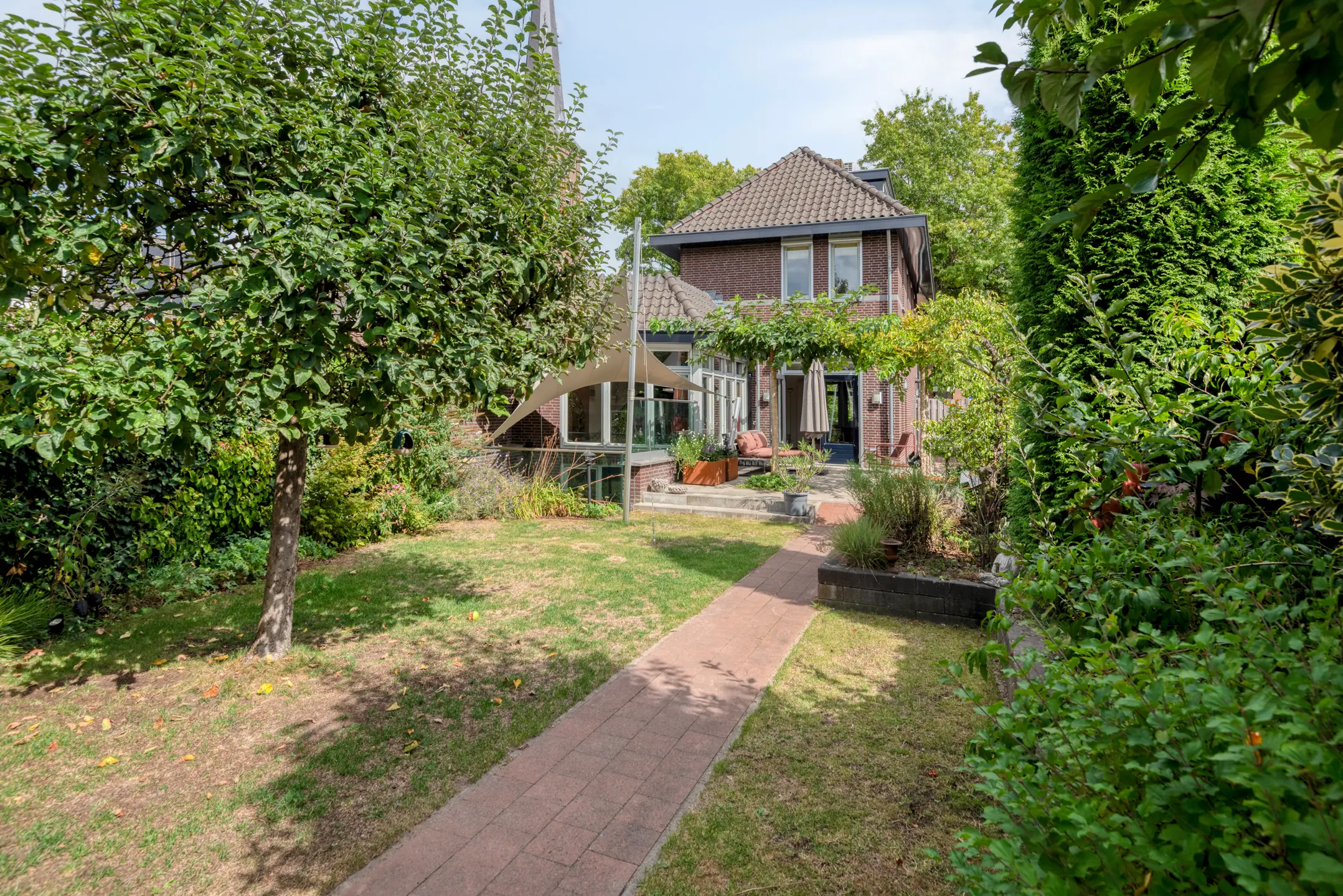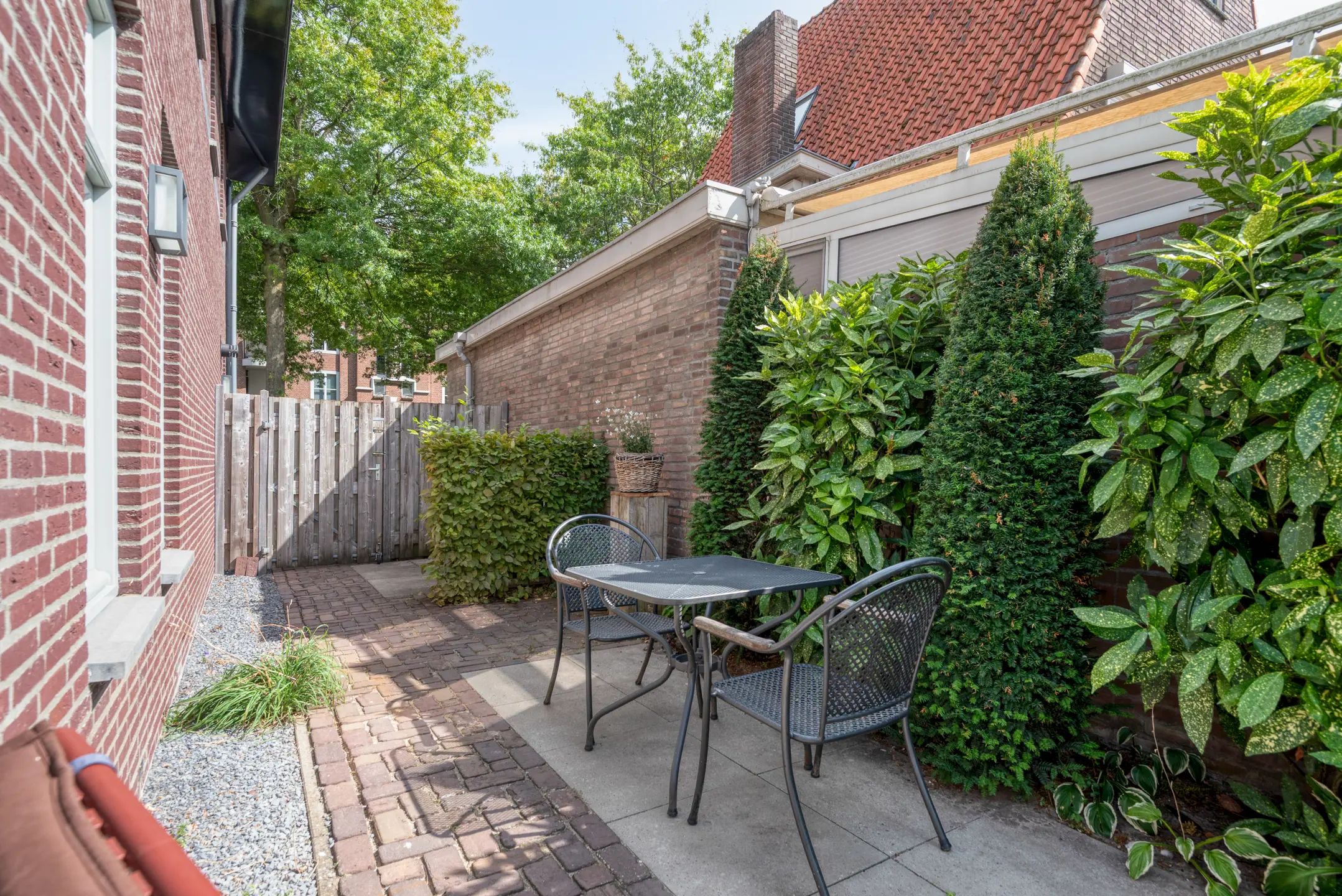 De tuin is een verborgen parel: groen, volwassen, met meerdere terrassen die uitnodigen tot lange zomeravonden. Hier heb je privacy, terwijl je tóch midden in het dorp leeft. Het uitzicht op de historische kerktoren geeft een bijna filmisch decor aan elke dag.