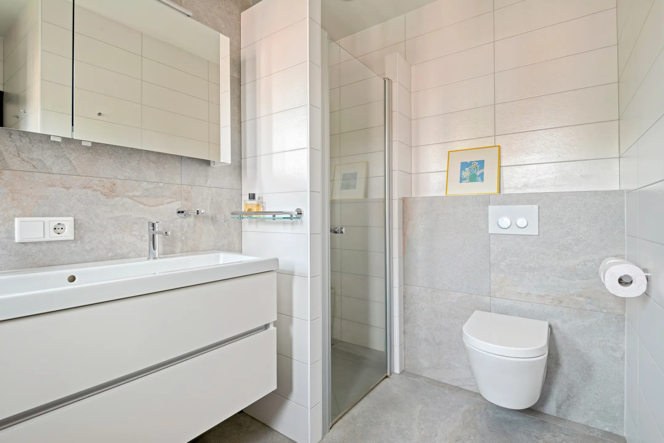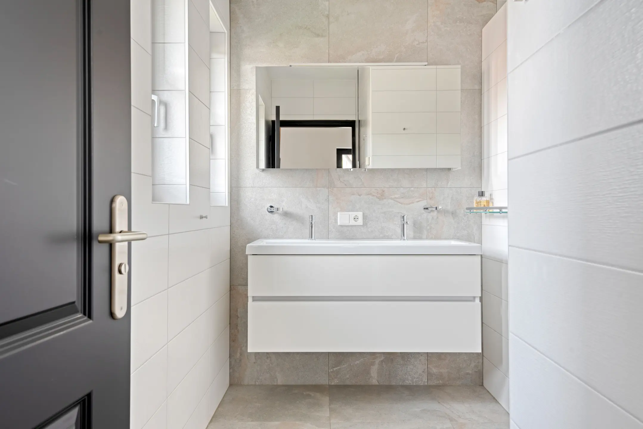 De voorzijde ademt klasse. Een stijlvolle entree leidt je naar de salon: hoge plafonds, een sfeervolle haard, prachtige schuifdeuren. Hier voel je direct de grandeur van een huis waar elk detail klopt. De schuifdeuren openen naar de tuingerichte living, een zee van licht met royale raampartijen en toegang tot het terras. Dit is wonen zoals je het voor je ziet in woonmagazines – en hier is het werkelijkheid.