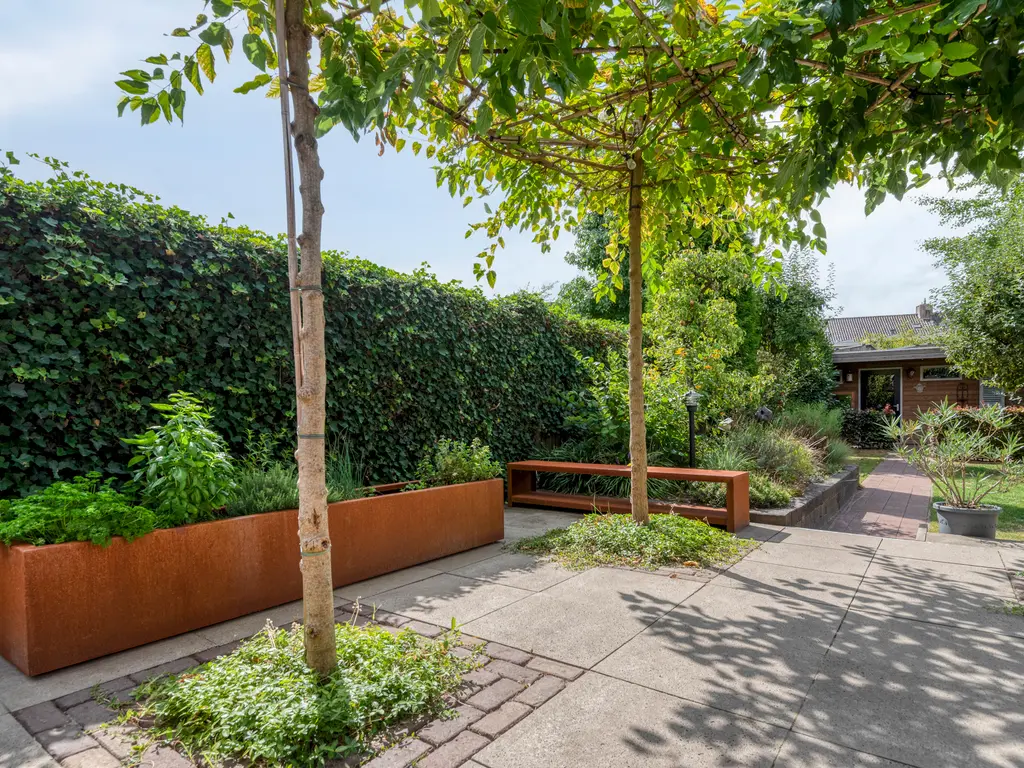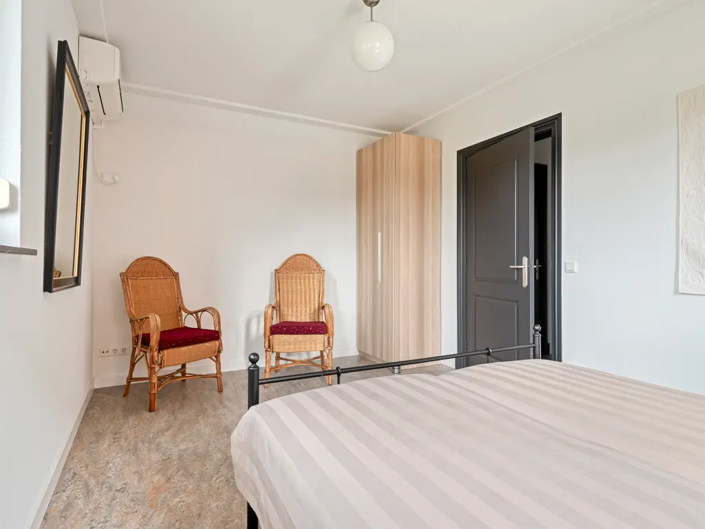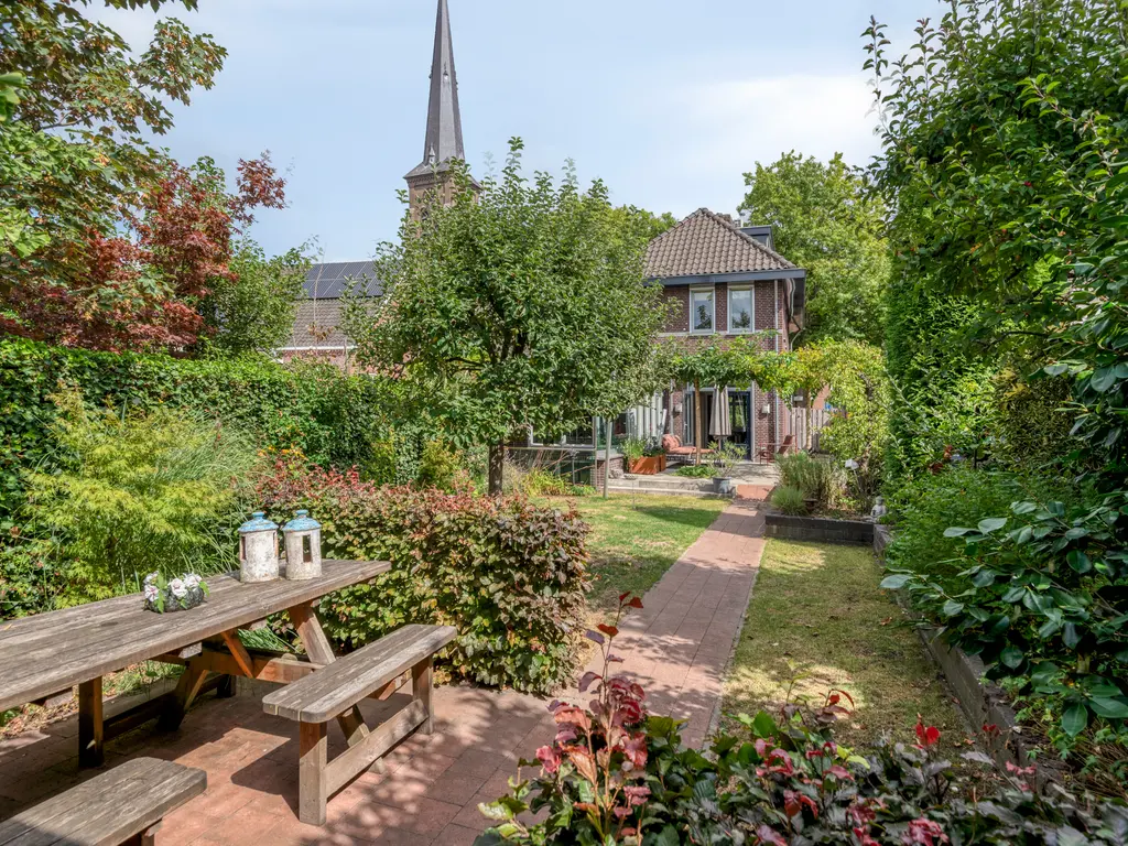 De tuin is een verborgen parel: groen, volwassen, met meerdere terrassen die uitnodigen tot lange zomeravonden. Hier heb je privacy, terwijl je tóch midden in het dorp leeft. Het uitzicht op de historische kerktoren geeft een bijna filmisch decor aan elke dag.