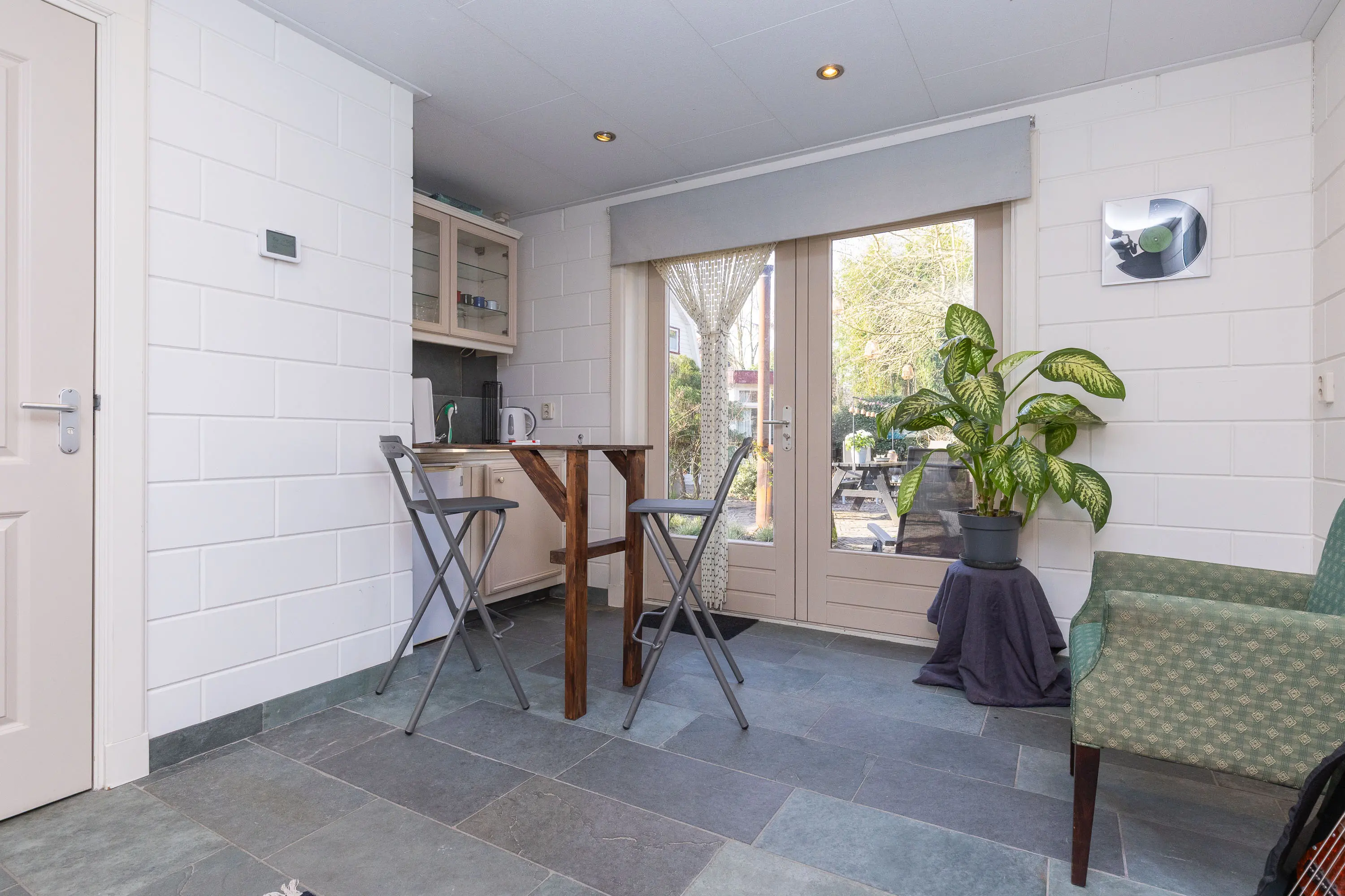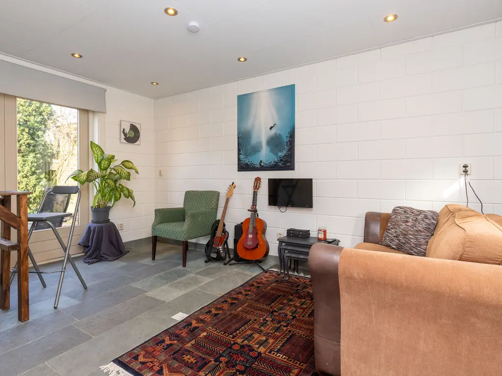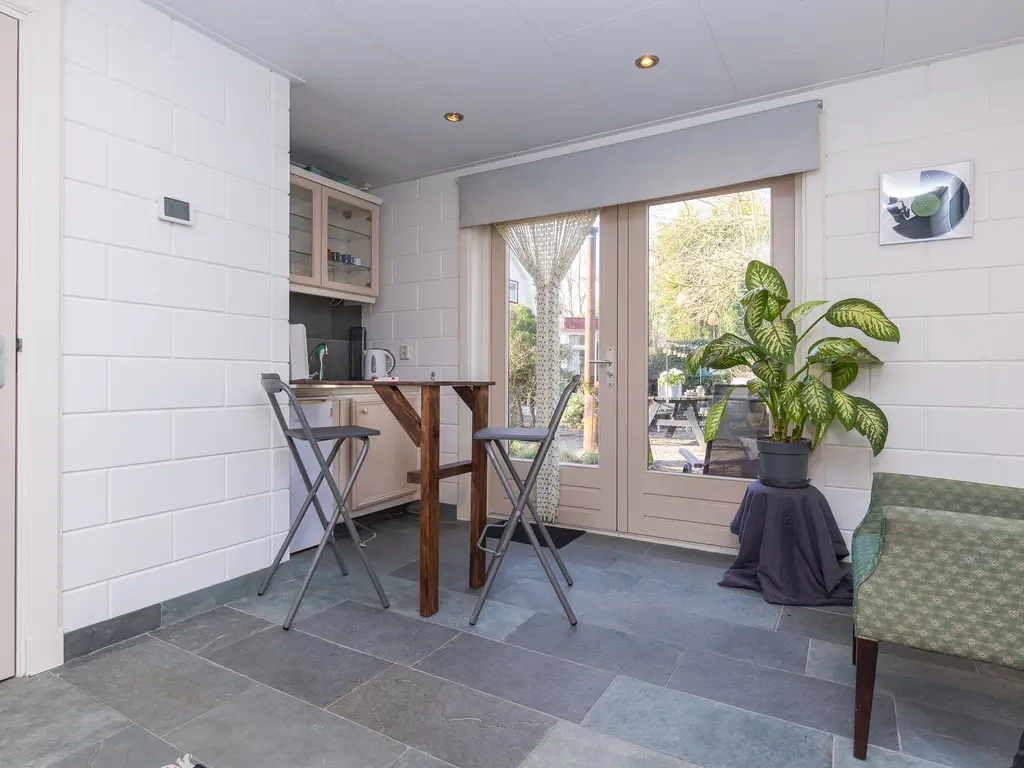 Via de tuin komt u vervolgens in het bijgebouw. Het bijgebouw met eigen toegang is voor meerdere doeleinden bruikbaar. Hebben uw pubers ruimte nodig? Een werkplek of praktijk aan huis? Inwonende ouders of schoonouders? Alles is hier mogelijk. De begane grond is voorzien van vloerverwarming. Thans zijn er twee slaapkamers op de eerste verdieping, een badkamer, toilet en keuken op de begane grond . De woonkamer van dit bijgebouw grenst eveneens aan de binnentuin. Er is zelfs nog ruimte inpandig voor een auto of een extra werkplek of slaapkamer op de begane grond. Voor het bijgebouw treft u twee parkeerplaatsen op eigen terrein en een laadpaal voor uw elektrische auto.