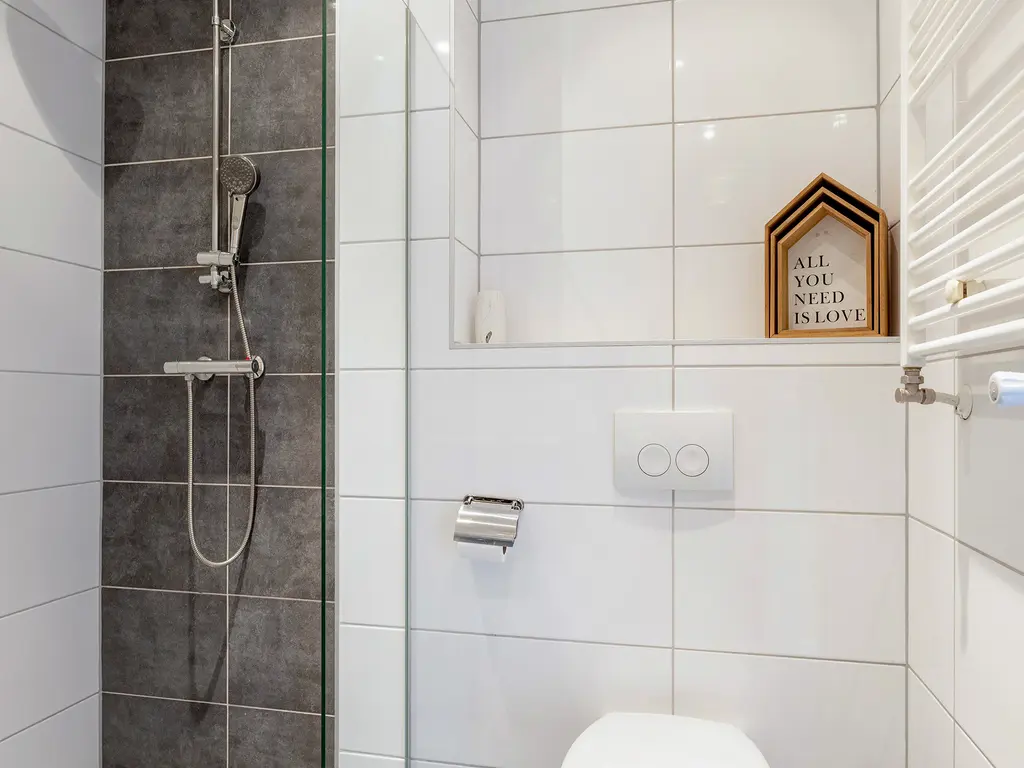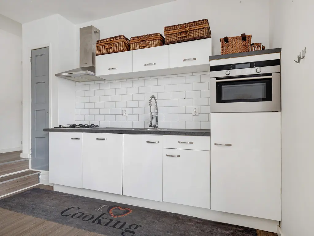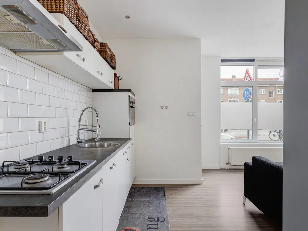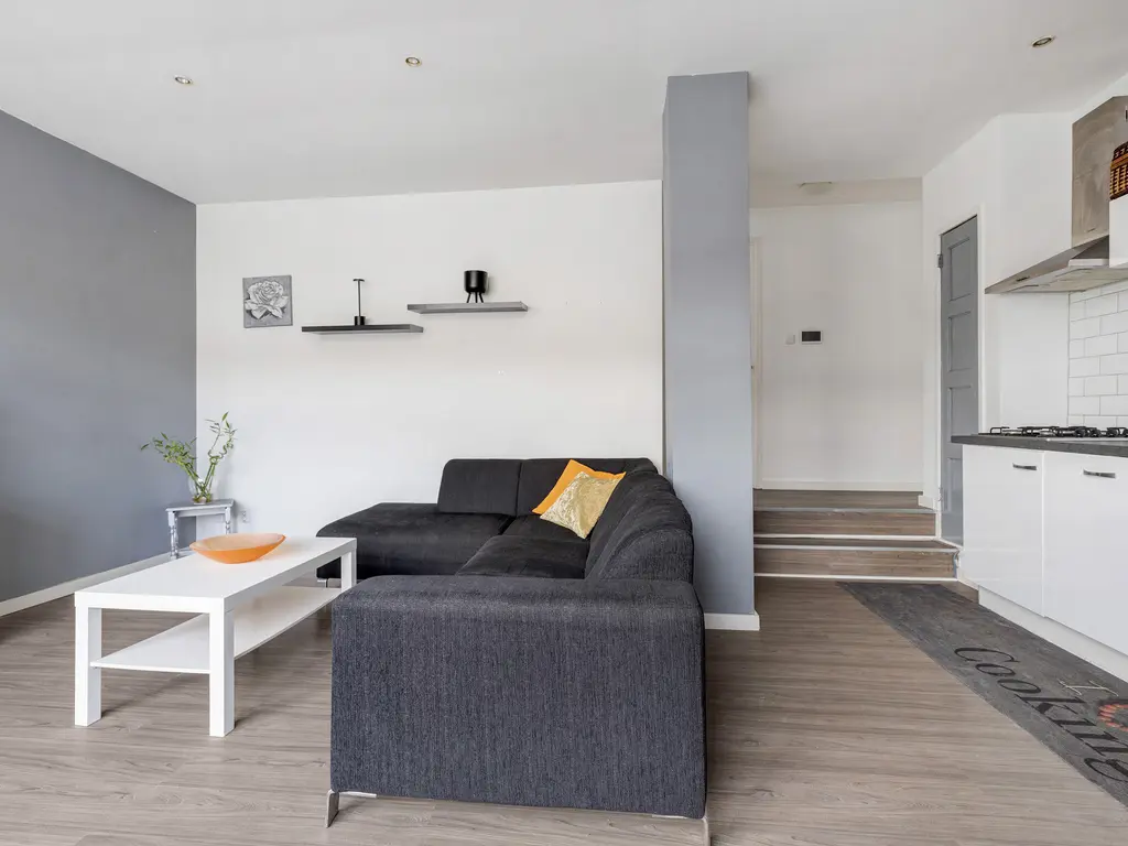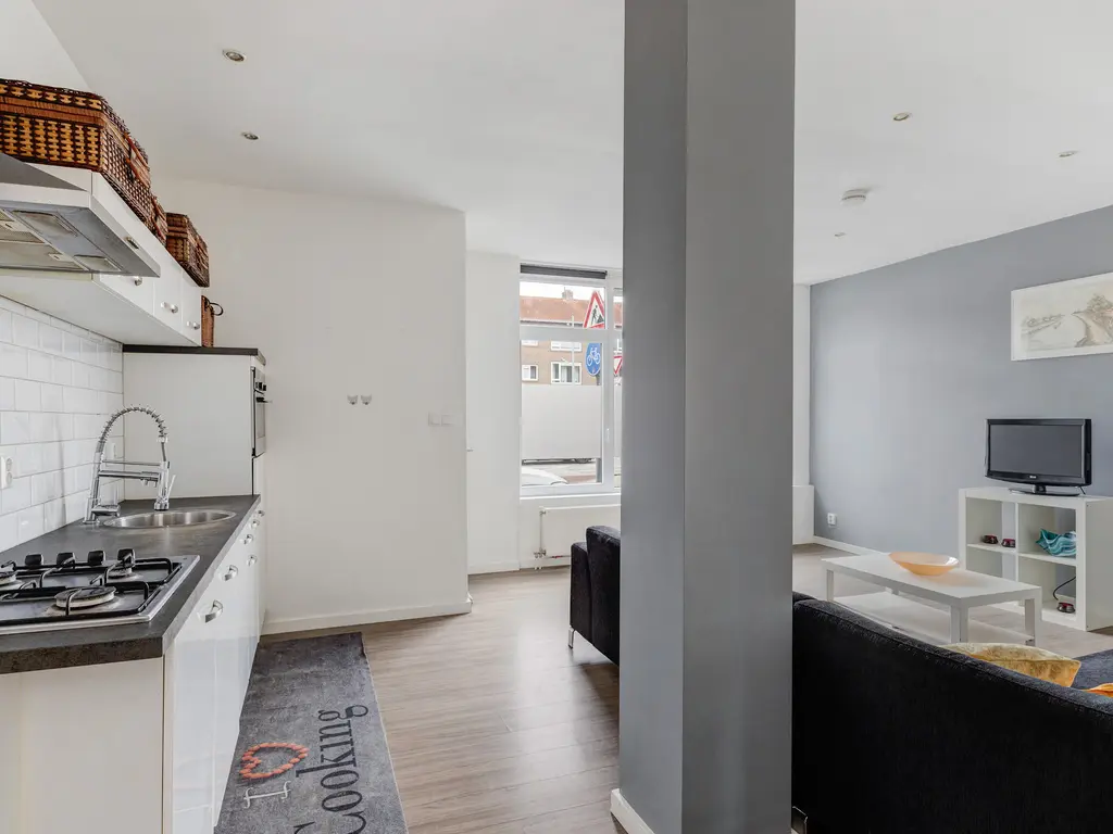 Via de voordeur, op straatniveau, kom je binnen in de hal. Door de hal kom in de fijne woonkamer met open keuken. Deze zijn gelegen aan de straatzijde. De keuken is voorzien van een combimagnetron, afzuigkap, kleine koelkast, vaatwasser en een 4-pits gaskookplaat. Via een klein trapje kom je bij de twee slaapkamers en ruime badkamer. De badkamer is voorzien van een inloopdouche, toilet en wastafel. De grote slaapkamer biedt toegang tot de grote tuin.