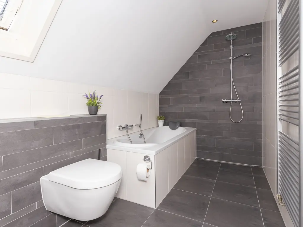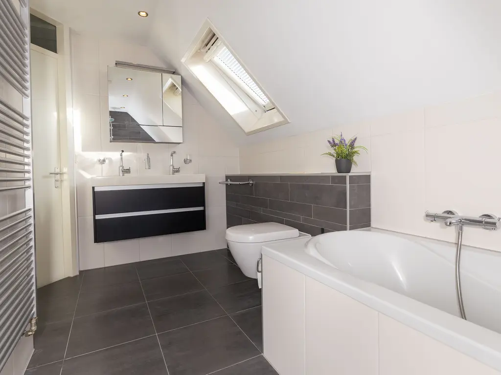 Hier bevinden zich drie ruime slaapkamers en een complete badkamer met vloerverwarming en met ligbad.