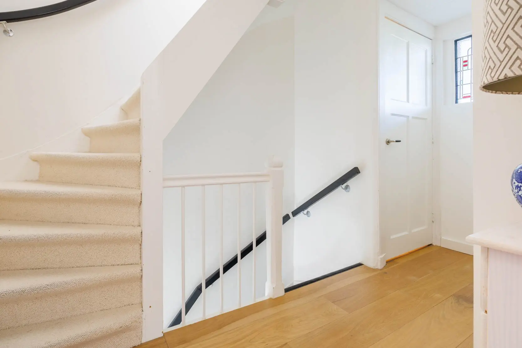Entrance hall with beautiful tiled flooring, equipped with the meter cupboard and stairs leading to the first floor.