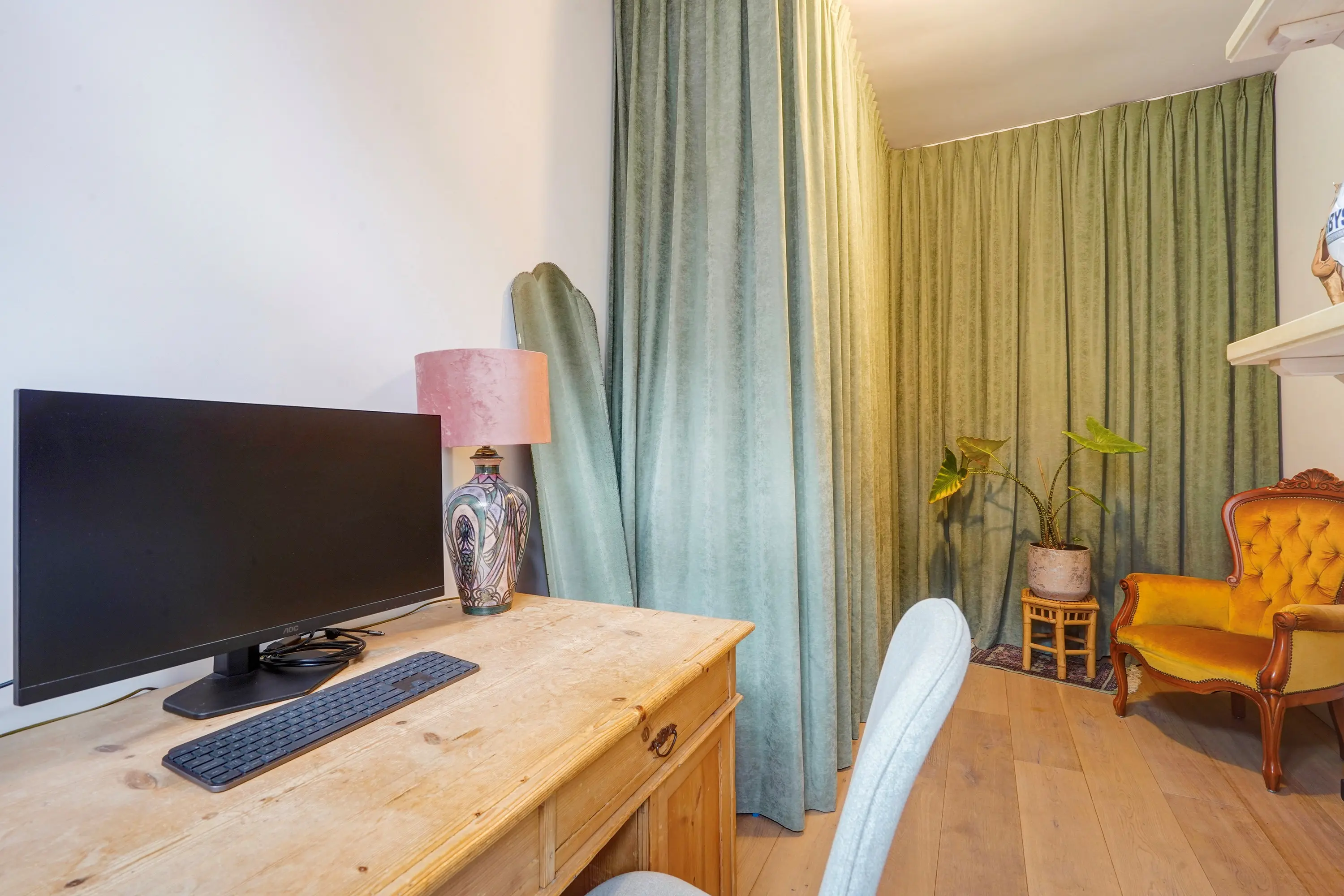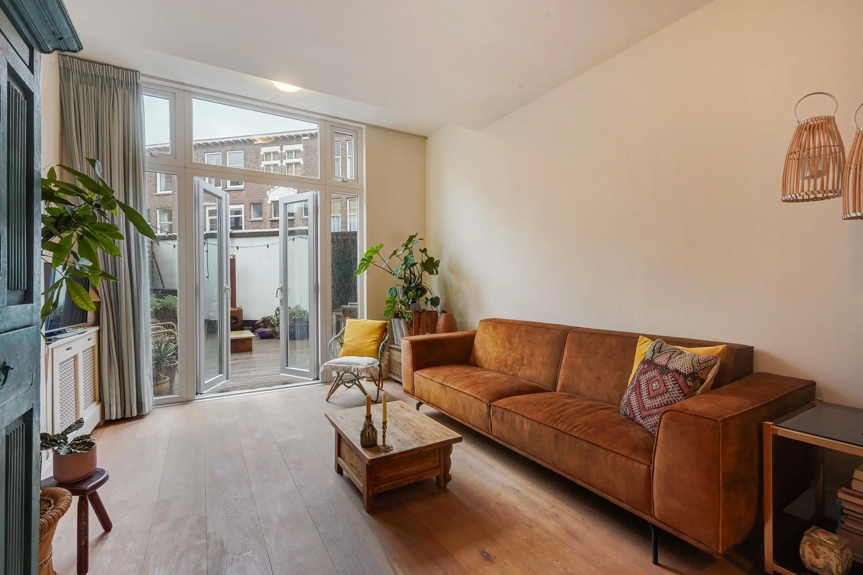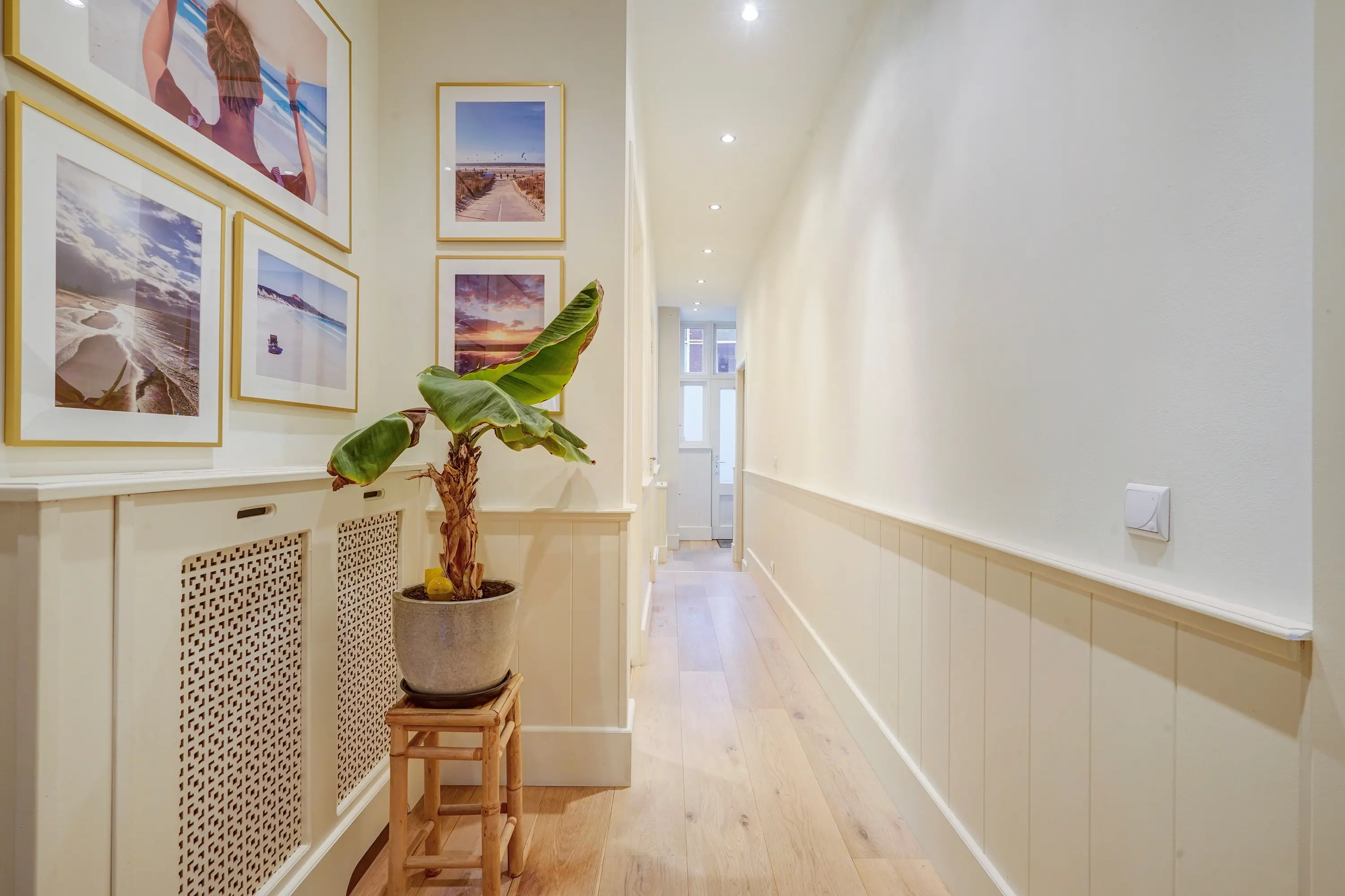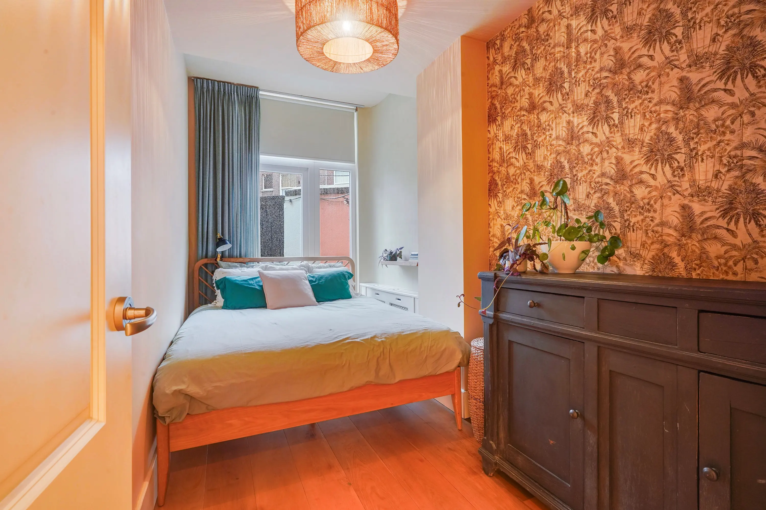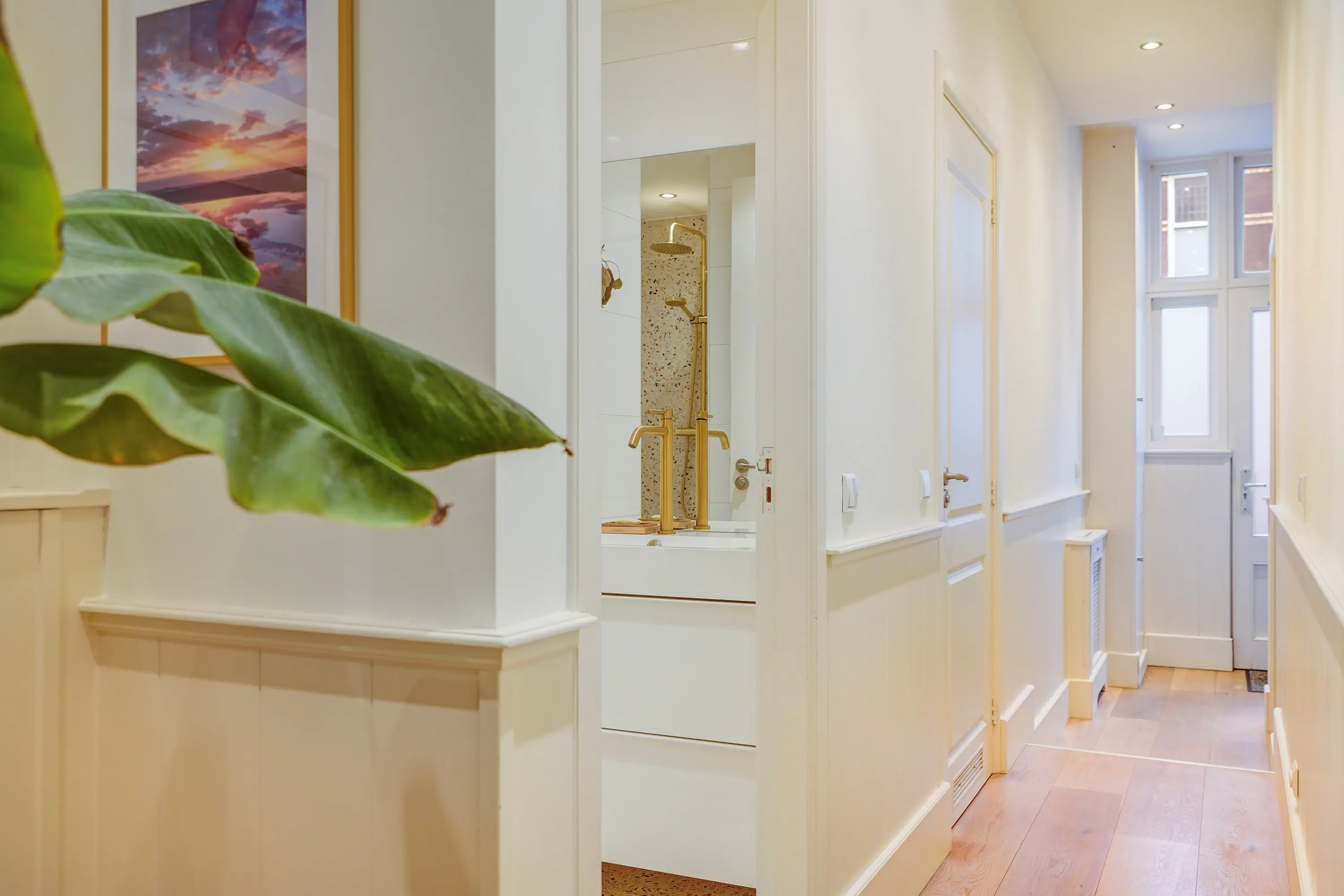 Entree appartement, hal v.v. meterkast met uitgebreide elektrische installatie, slaapkamer aan de voorzijde (thans in gebruik als werkplak) met veel kastruimte, apart toilet voorzien van antracietkleurige tegelvloer, grote witte wandtegels, zwevend wandcloset, fonteintje, halogeen inbouwspots en mechanische ventilatie, centrale gang met vaste kast voor Cv-combiketel AWB 2012, opstelplaats wasmachine en droger, moderne badkamer (vernieuwd in 2023) welke is voorzien van een prachtige terrazzo tegelvloer en douche wand en verder grote witte wandtegels, inloopdouche, wastafelmeubel, handdoekradiator en hier krijgt u letterlijk gouden kranen. Sfeervolle woon-/eetkamer met luxe open keuken in hoekopstelling welke is voorzien van hardstenen werkblad en diverse inbouwapparatuur zoals; rvs spoelbak met luxe kraan, combi magnetron/oven, vaatwasser (2025), 4-pits rvs gaskookplaat, koel-/vriescombinatie (2025) en afzuigkap, middels openslaande deuren vanuit de woonkamer toegang tot achtertuin ca.32 m² welke pal op het Zuiden is gelegen. De tweede slaapkamer heeft eveneens openslaande deuren naar achtertuin. Achtertuin pal Zuid gesitueerd met achterom naar de Ampèrestraat.