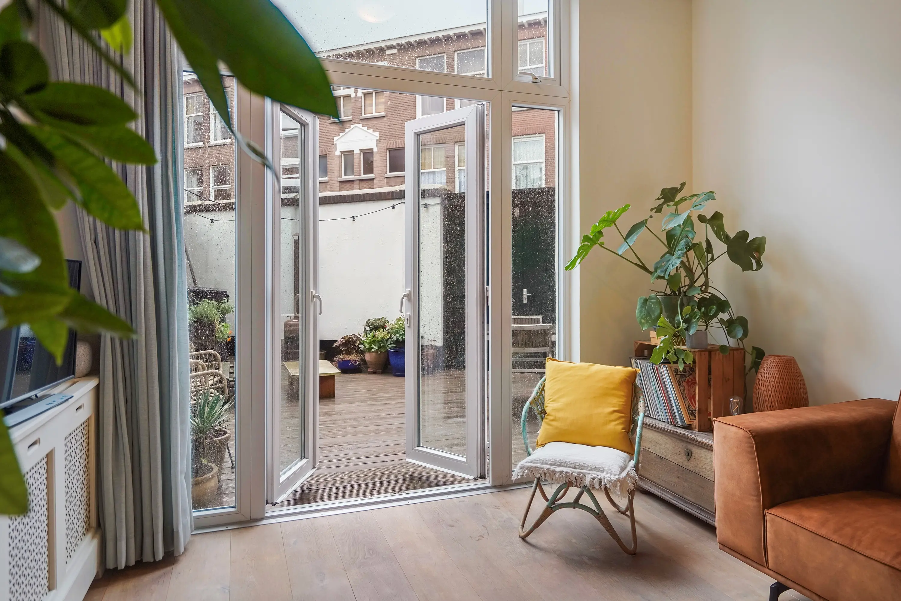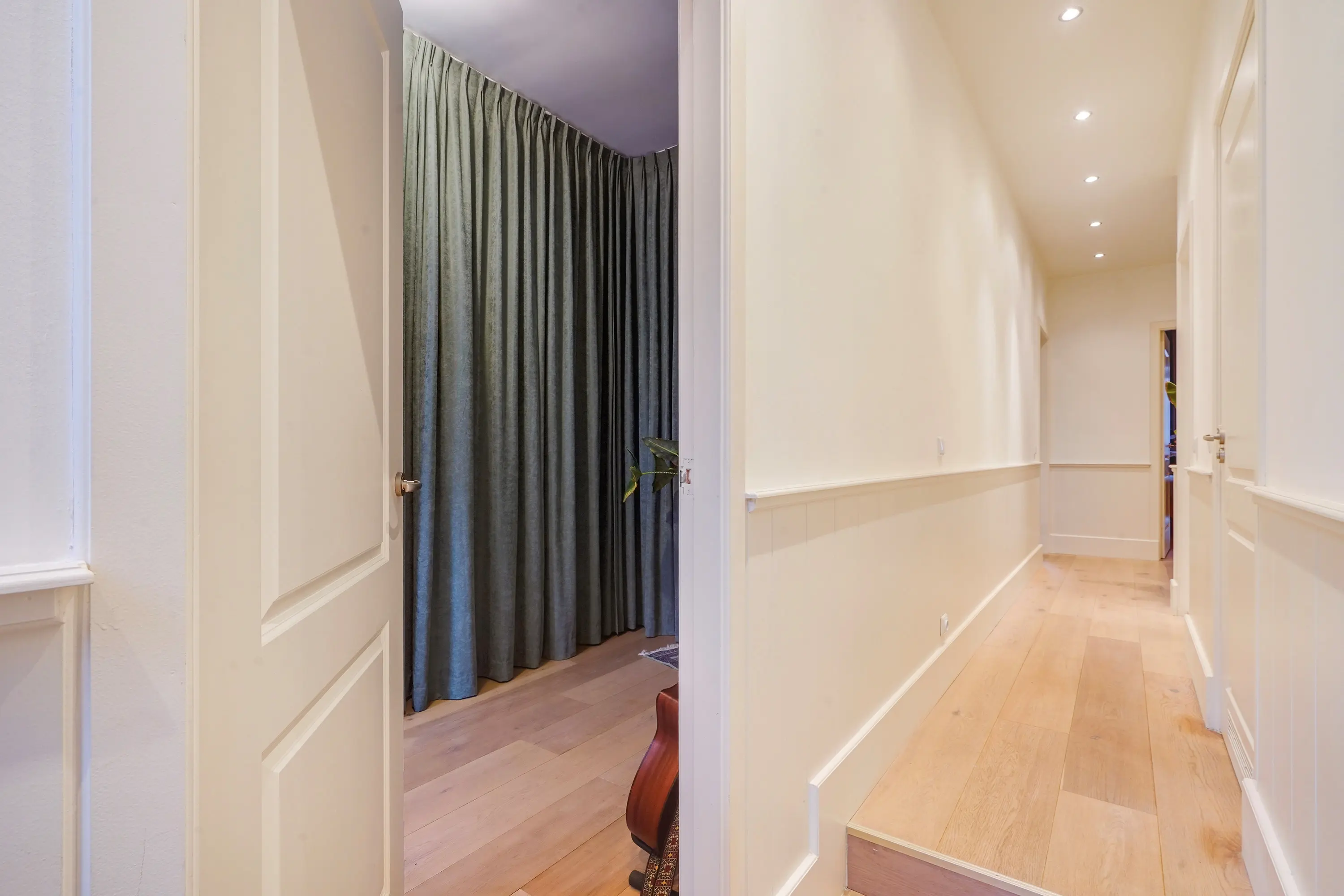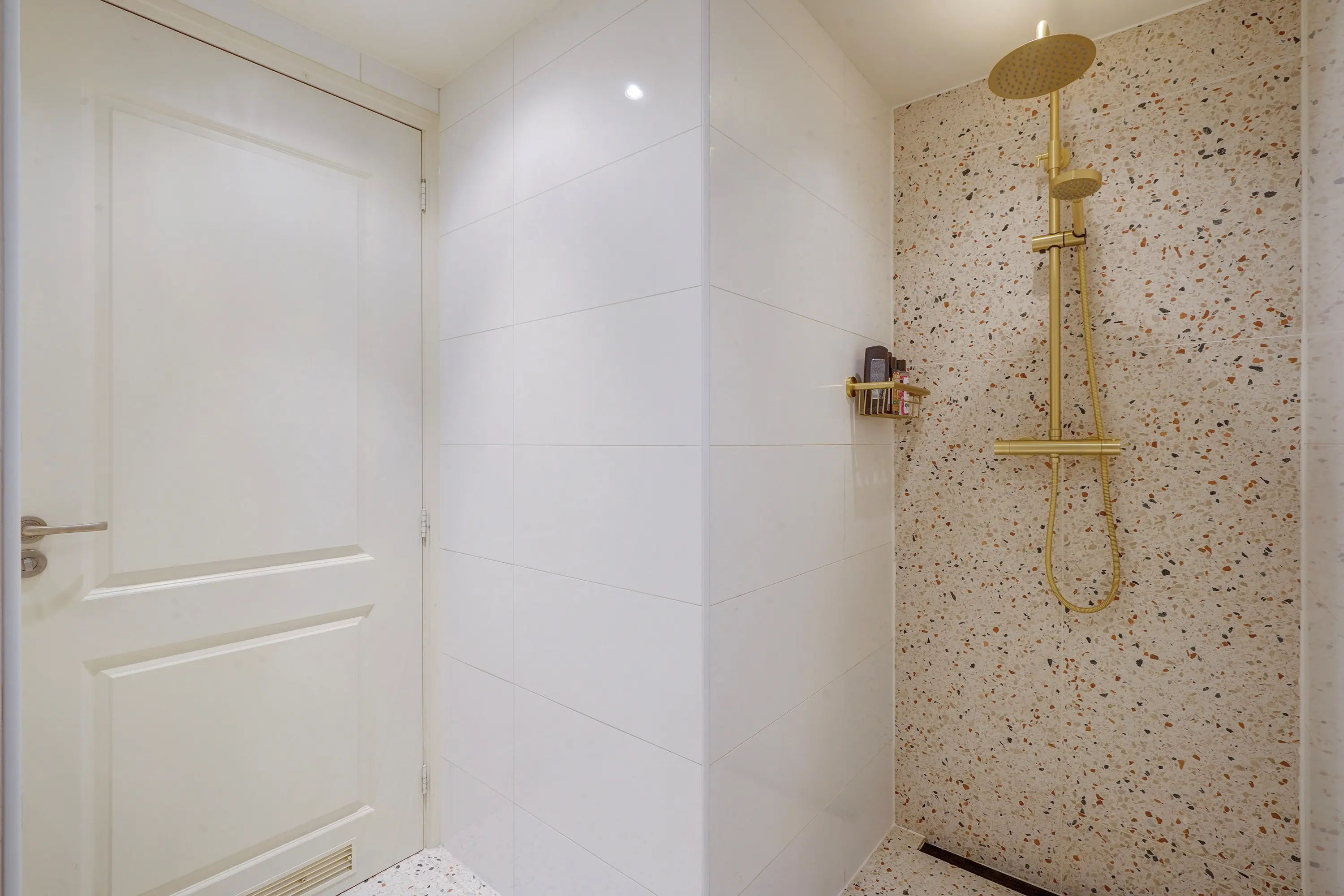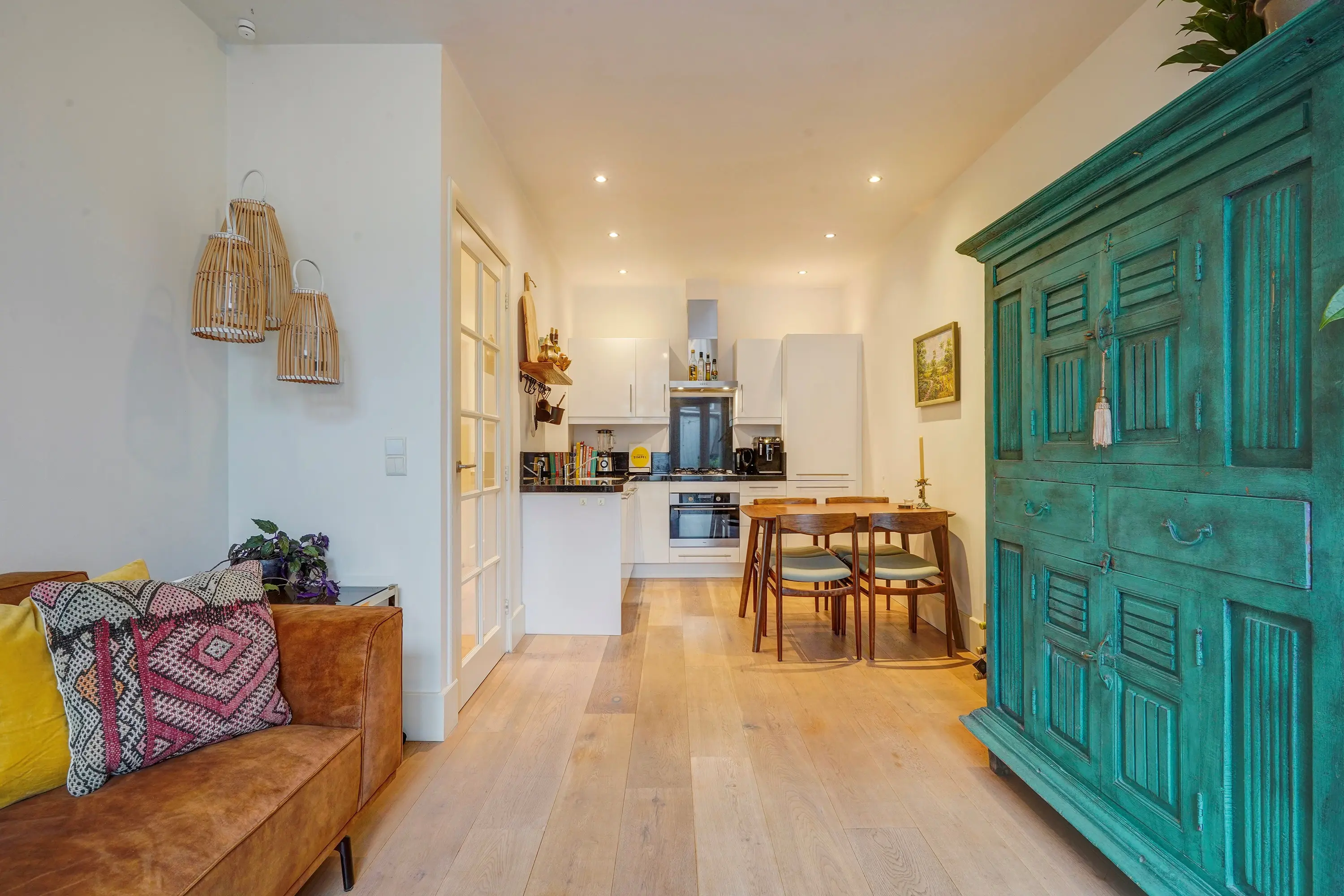 Entree appartement, hal v.v. meterkast met uitgebreide elektrische installatie, slaapkamer aan de voorzijde (thans in gebruik als werkplak) met veel kastruimte, apart toilet voorzien van antracietkleurige tegelvloer, grote witte wandtegels, zwevend wandcloset, fonteintje, halogeen inbouwspots en mechanische ventilatie, centrale gang met vaste kast voor Cv-combiketel AWB 2012, opstelplaats wasmachine en droger, moderne badkamer (vernieuwd in 2023) welke is voorzien van een prachtige terrazzo tegelvloer en douche wand en verder grote witte wandtegels, inloopdouche, wastafelmeubel, handdoekradiator en hier krijgt u letterlijk gouden kranen. Sfeervolle woon-/eetkamer met luxe open keuken in hoekopstelling welke is voorzien van hardstenen werkblad en diverse inbouwapparatuur zoals; rvs spoelbak met luxe kraan, combi magnetron/oven, vaatwasser (2025), 4-pits rvs gaskookplaat, koel-/vriescombinatie (2025) en afzuigkap, middels openslaande deuren vanuit de woonkamer toegang tot achtertuin ca.32 m² welke pal op het Zuiden is gelegen. De tweede slaapkamer heeft eveneens openslaande deuren naar achtertuin. Achtertuin pal Zuid gesitueerd met achterom naar de Ampèrestraat.