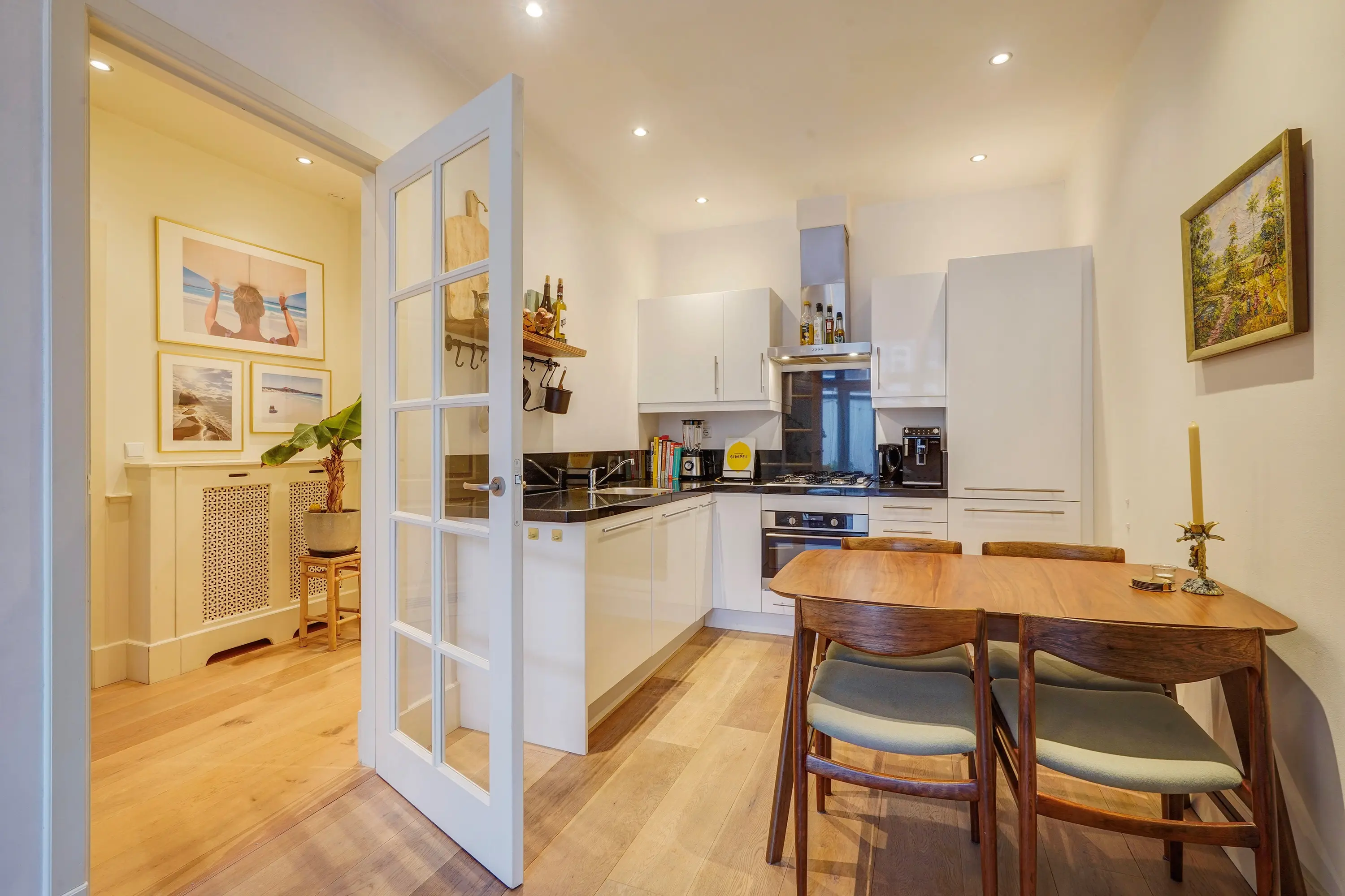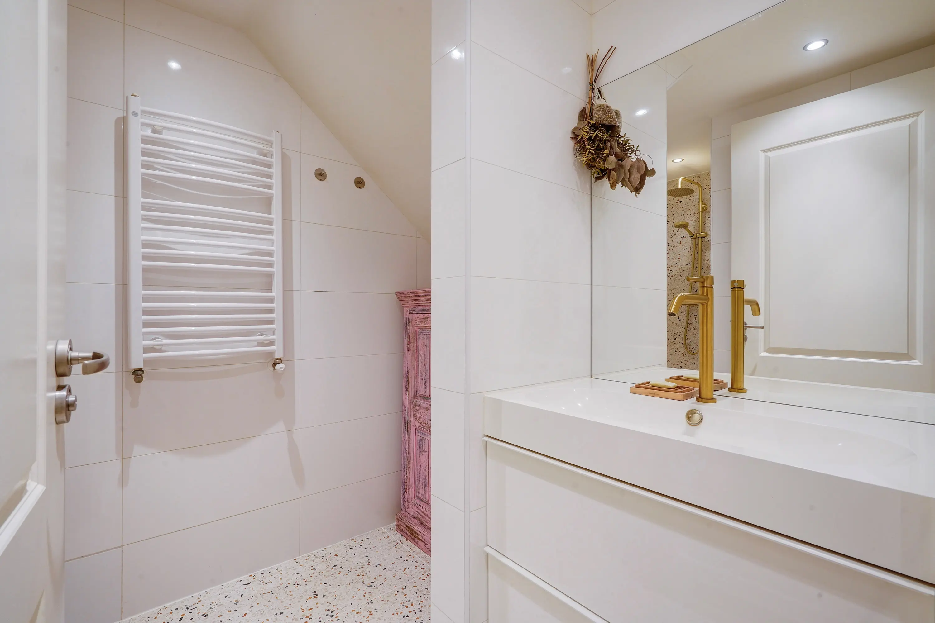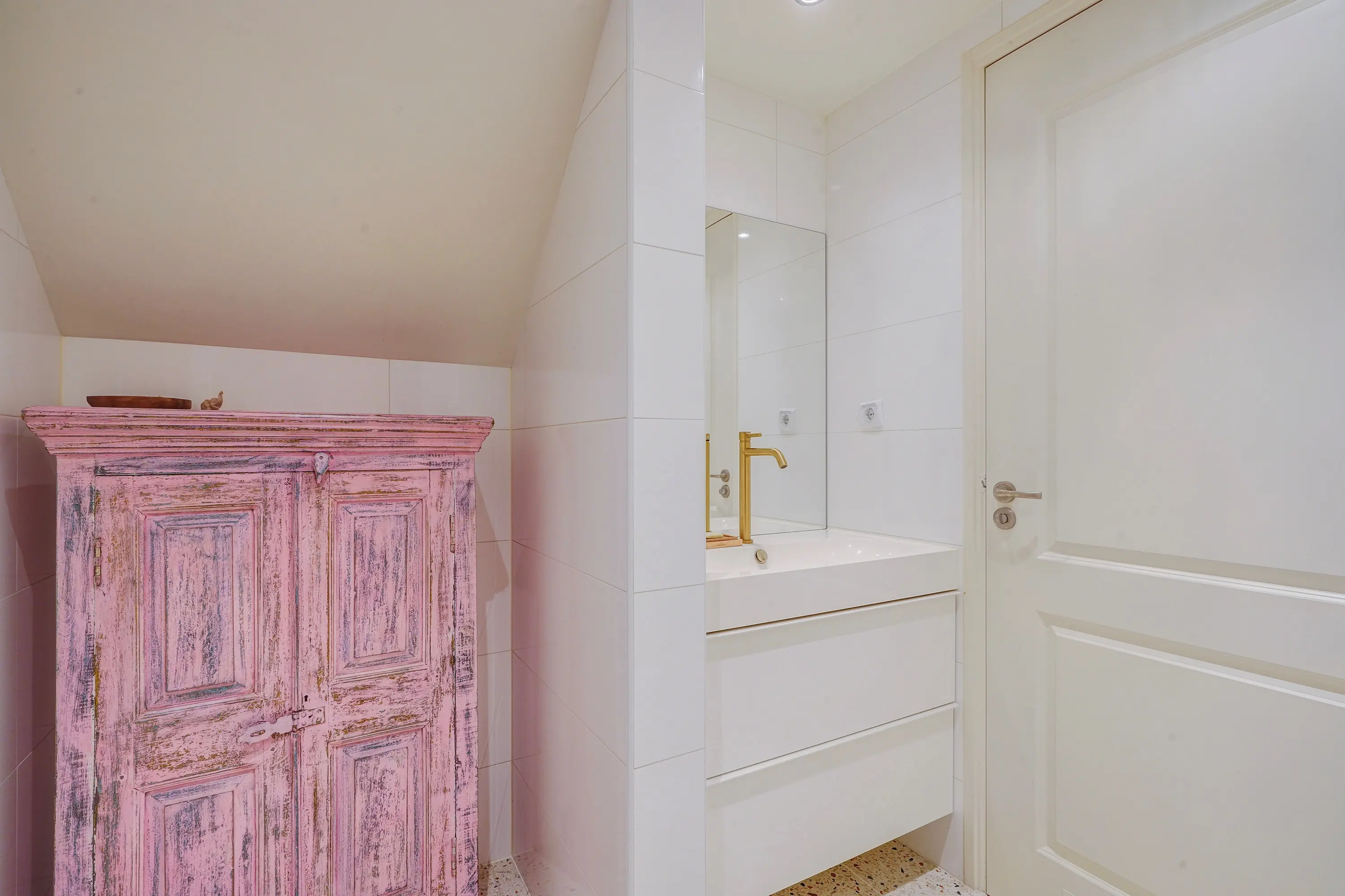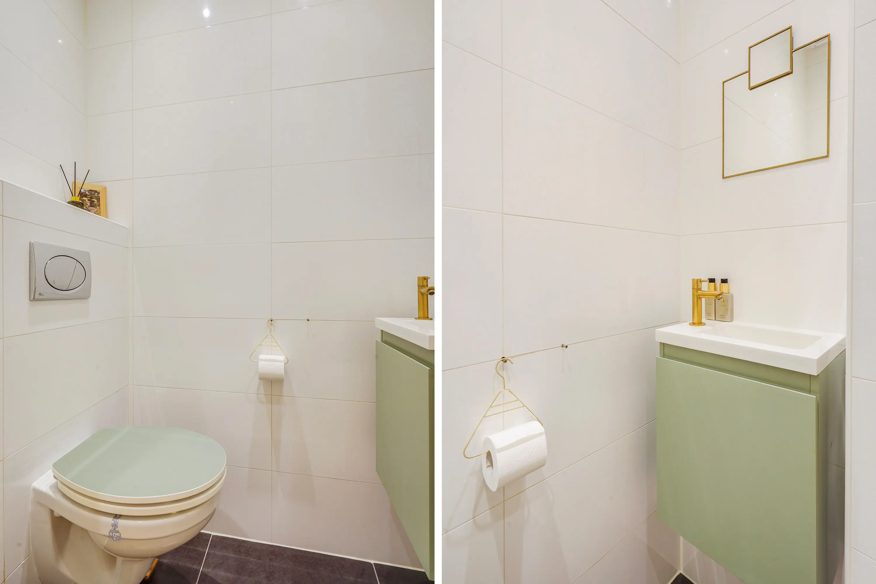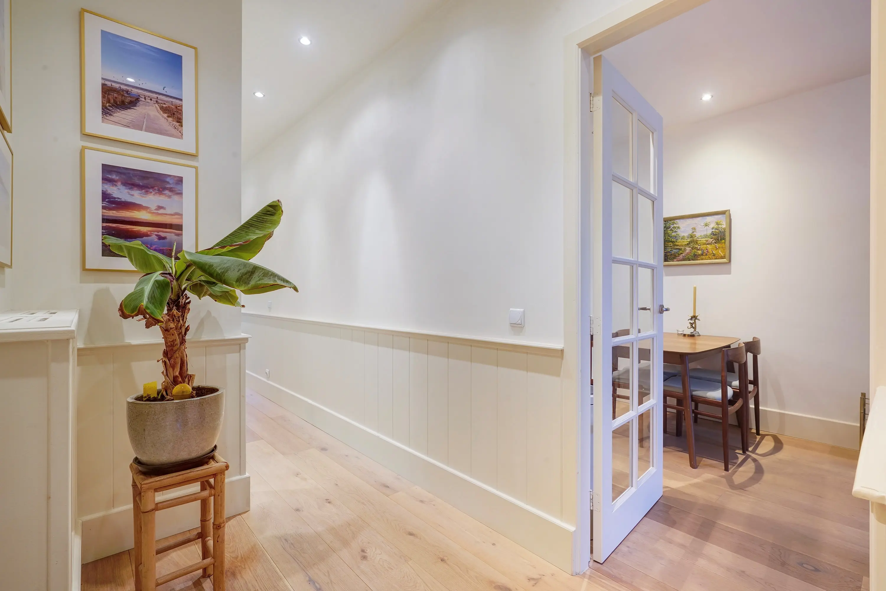Entree appartement, hal v.v. meterkast met uitgebreide elektrische installatie, slaapkamer aan de voorzijde (thans in gebruik als werkplak) met veel kastruimte, apart toilet voorzien van antracietkleurige tegelvloer, grote witte wandtegels, zwevend wandcloset, fonteintje, halogeen inbouwspots en mechanische ventilatie, centrale gang met vaste kast voor Cv-combiketel AWB 2012, opstelplaats wasmachine en droger, moderne badkamer (vernieuwd in 2023) welke is voorzien van een prachtige terrazzo tegelvloer en douche wand en verder grote witte wandtegels, inloopdouche, wastafelmeubel, handdoekradiator en hier krijgt u letterlijk gouden kranen. Sfeervolle woon-/eetkamer met luxe open keuken in hoekopstelling welke is voorzien van hardstenen werkblad en diverse inbouwapparatuur zoals; rvs spoelbak met luxe kraan, combi magnetron/oven, vaatwasser (2025), 4-pits rvs gaskookplaat, koel-/vriescombinatie (2025) en afzuigkap, middels openslaande deuren vanuit de woonkamer toegang tot achtertuin ca.32 m² welke pal op het Zuiden is gelegen. De tweede slaapkamer heeft eveneens openslaande deuren naar achtertuin. Achtertuin pal Zuid gesitueerd met achterom naar de Ampèrestraat.
