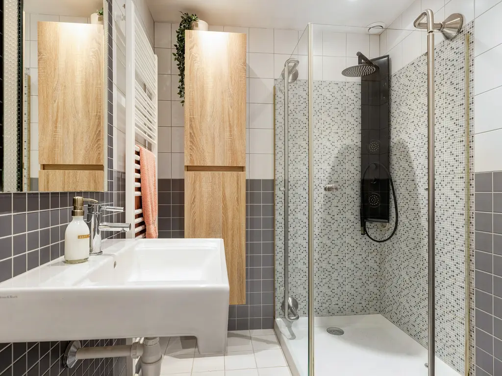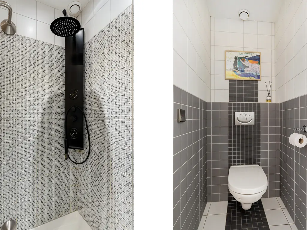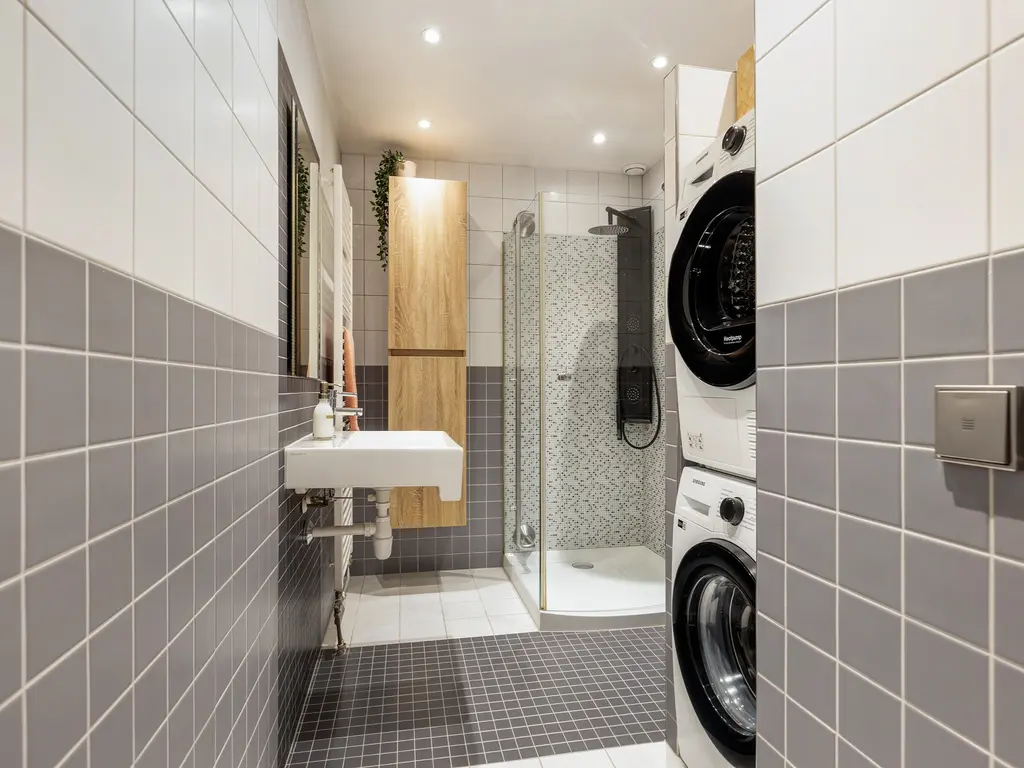 Badkamer: Fraai betegeld, met een douchecabine, wastafelmeubel en designradiator en aansluitingen voor wasmachine en droger – strak, modern en praktisch.