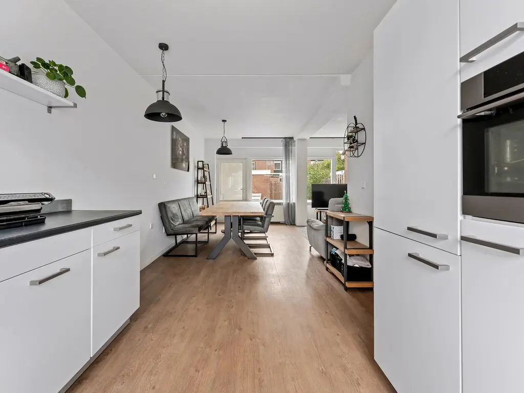 Binnengekomen in de royale hal tref je het modern afgewerkte toilet met fonteintje, de trapopgang naar de eerste verdieping en toegang tot de woonkamer. De doorzonwoonkamer is heerlijk licht en biedt voldoende ruimte voor zowel een comfortabele zithoek als een gezellige eethoek. De open keuken in U-opstelling is voorzien van diverse inbouwapparatuur, waaronder een inductiekookplaat, afzuigkap, koel-vriescombinatie, oven en vaatwasser, perfect voor de thuiskok.
