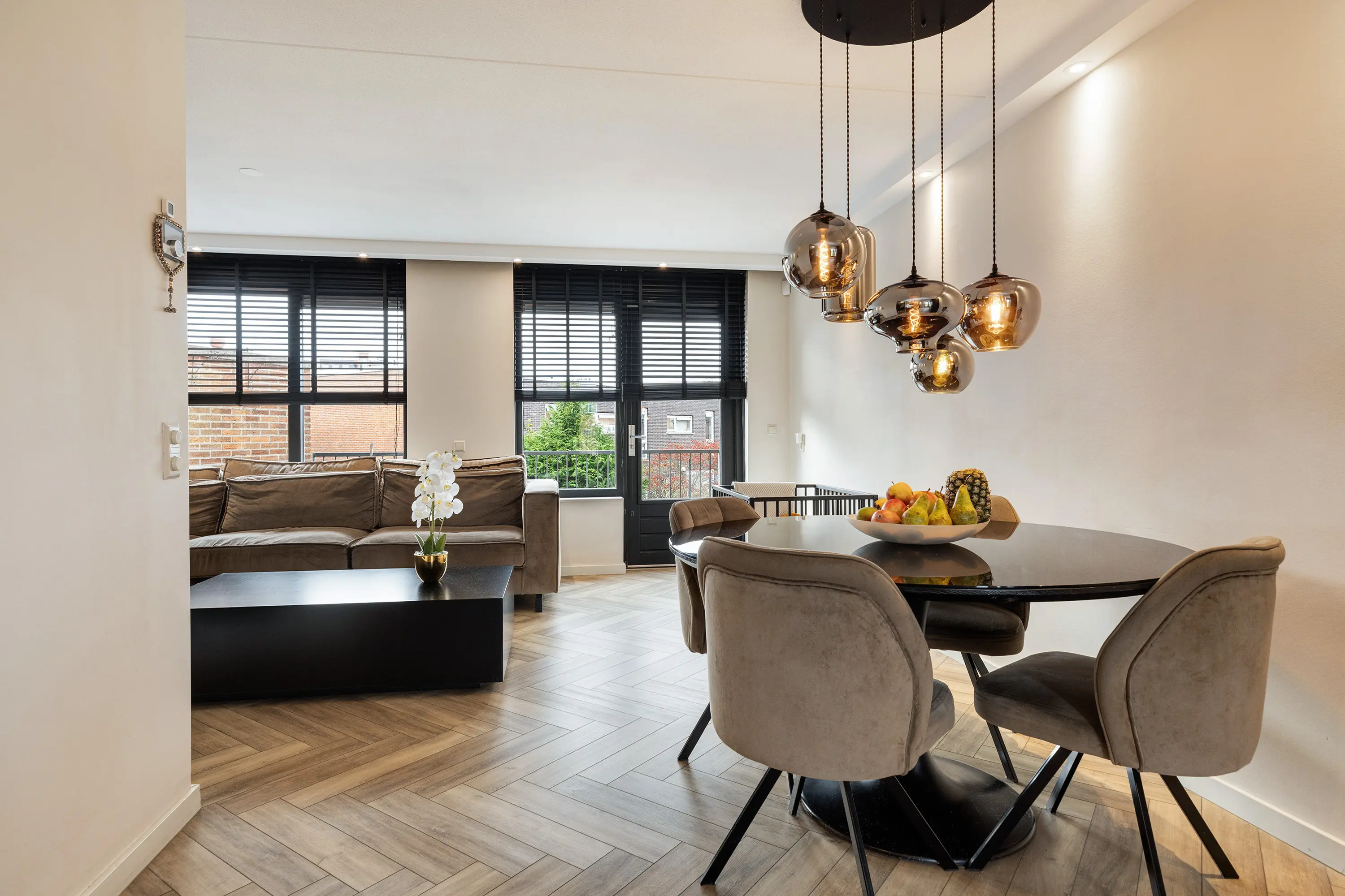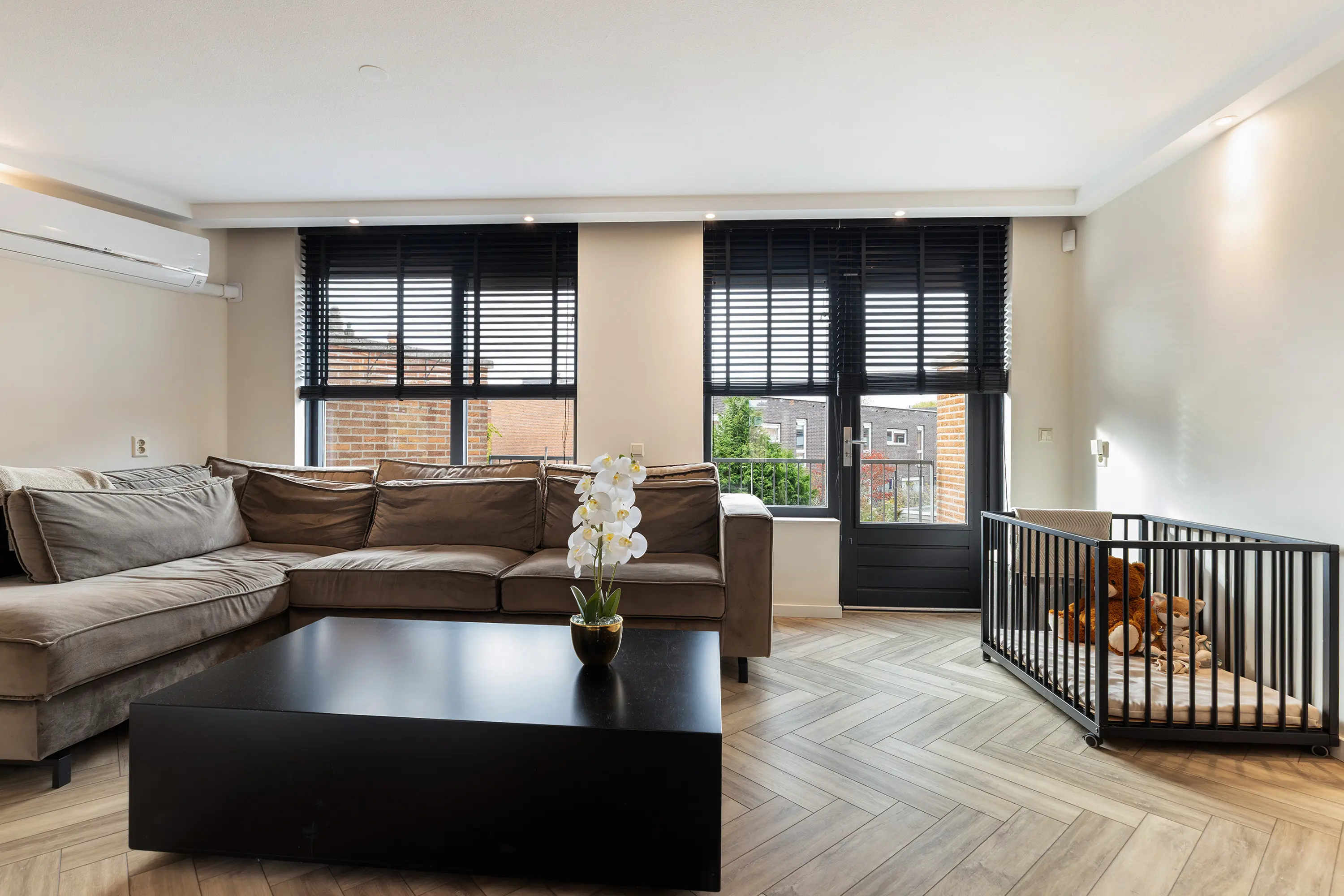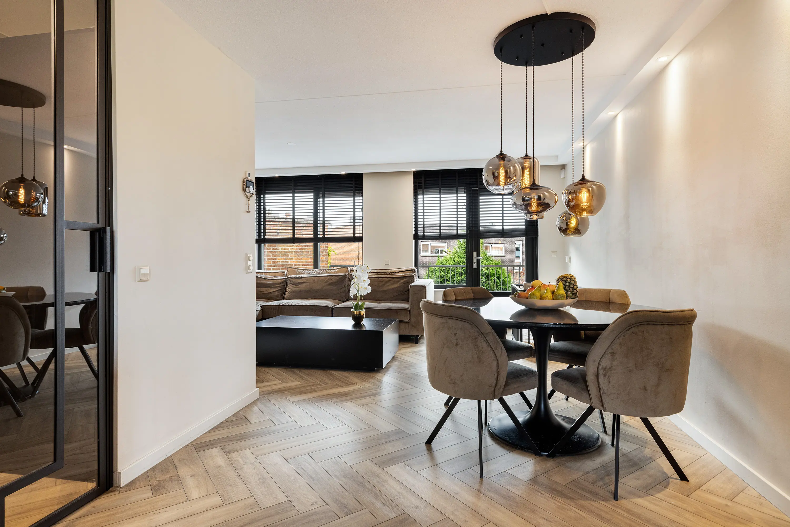 Via een stijlvolle zwarte stalen deur kom je in de lichte woonkamer.