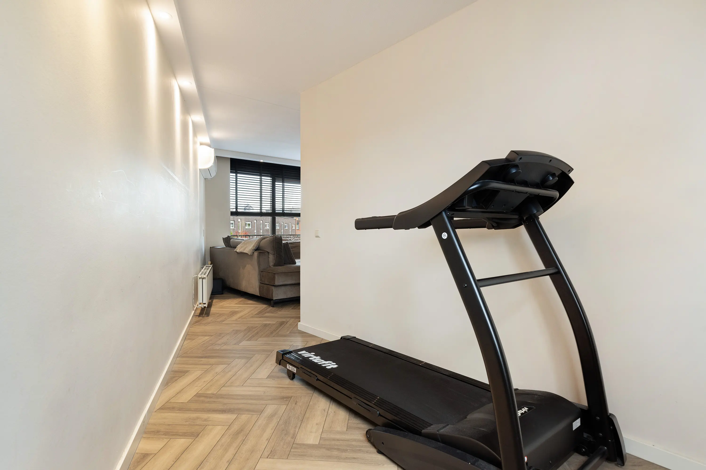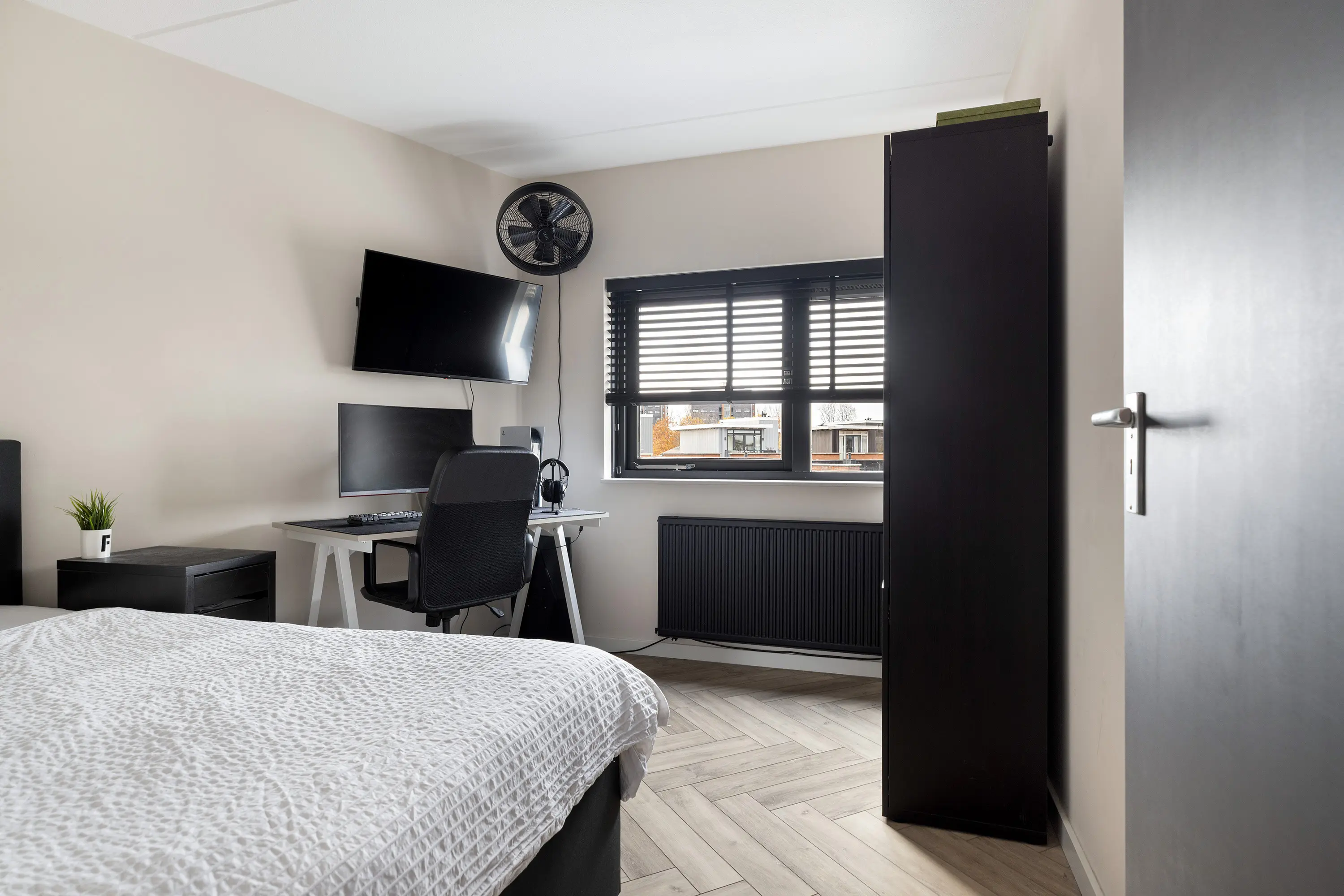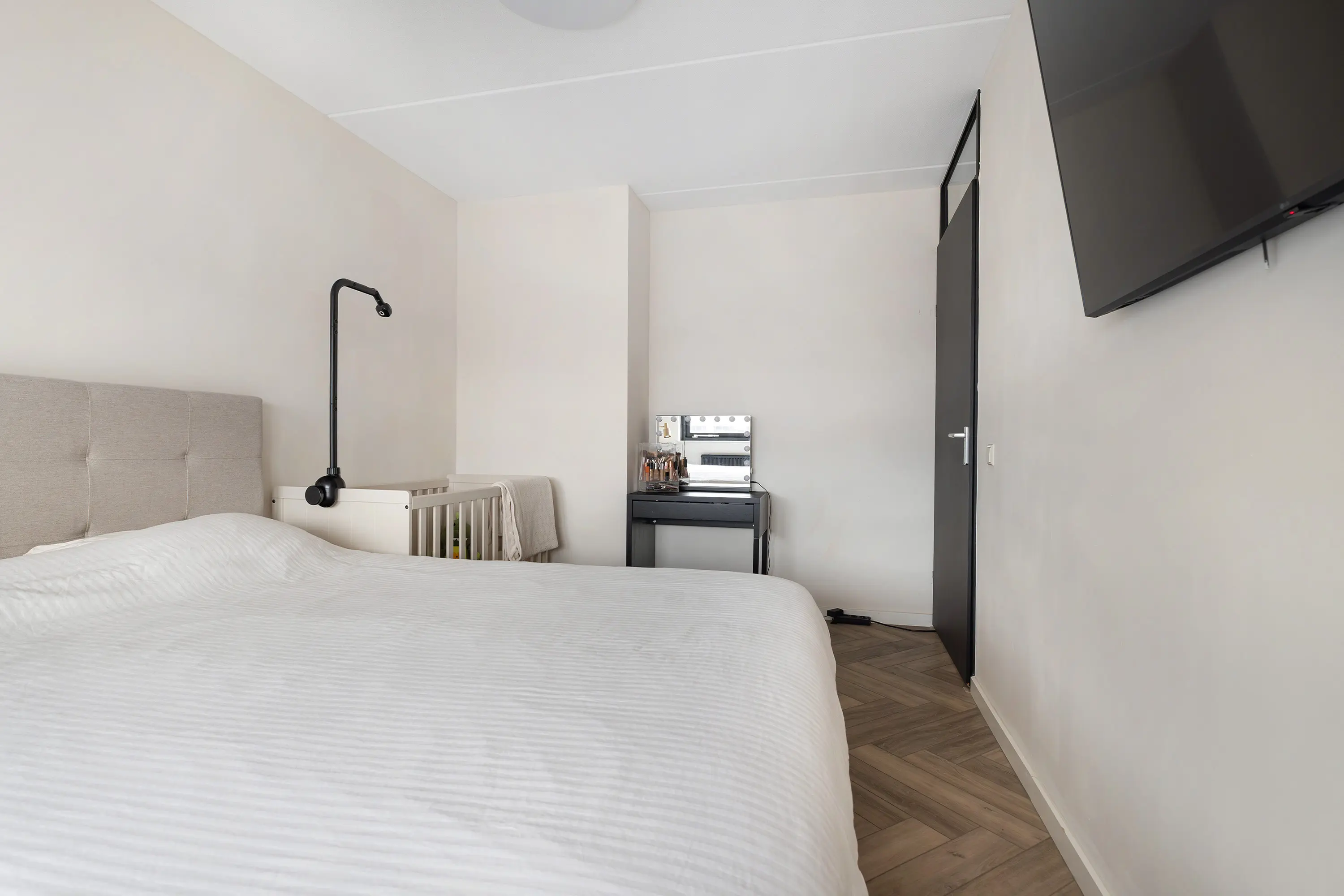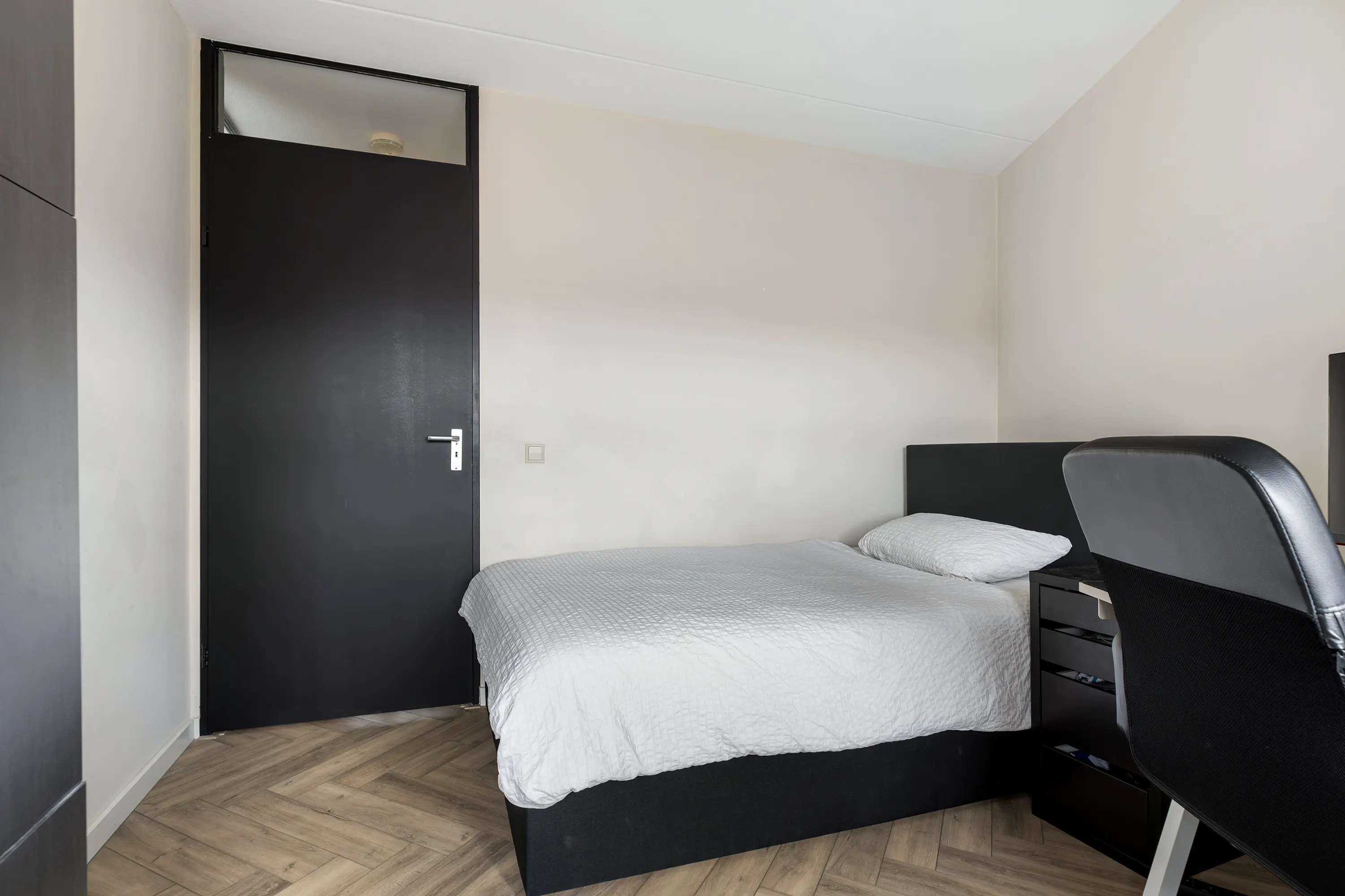 Ook op deze verdieping ligt een visgraat PVC-vloer en zijn alle wanden strak gestukt.