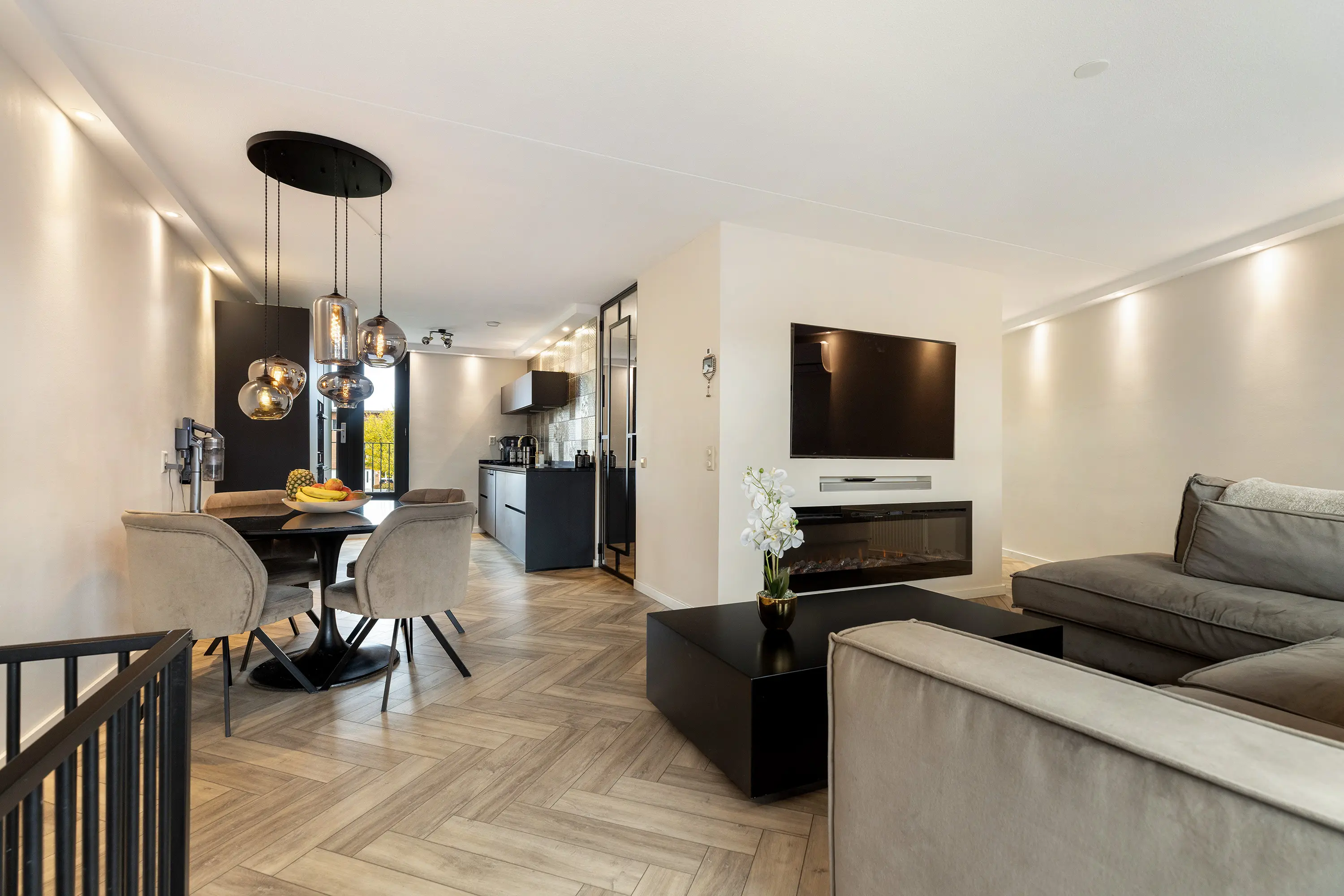 De fraaie cinewall met elektrische haard en uitsparing voor de televisie zorgt voor een luxe uitstraling.