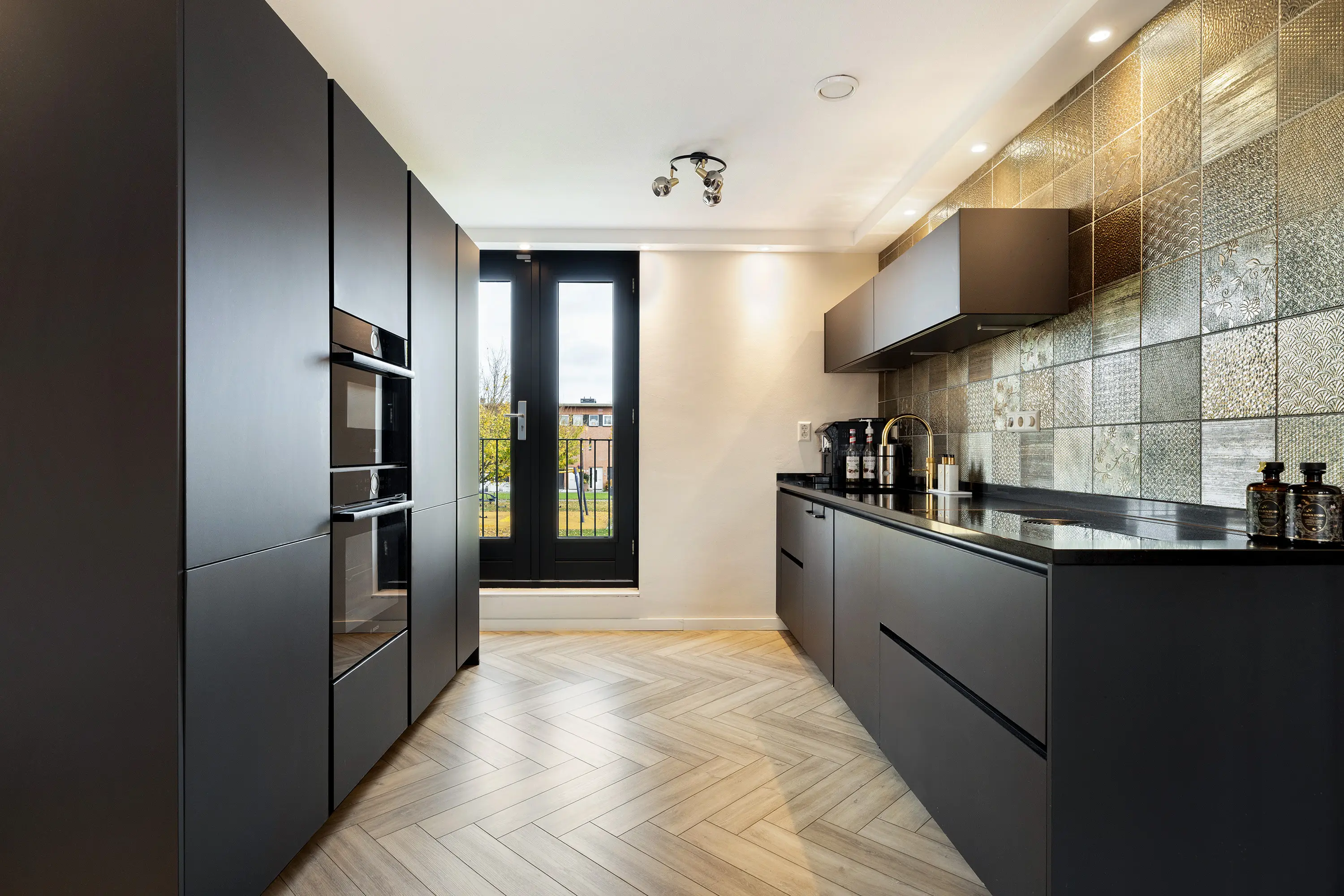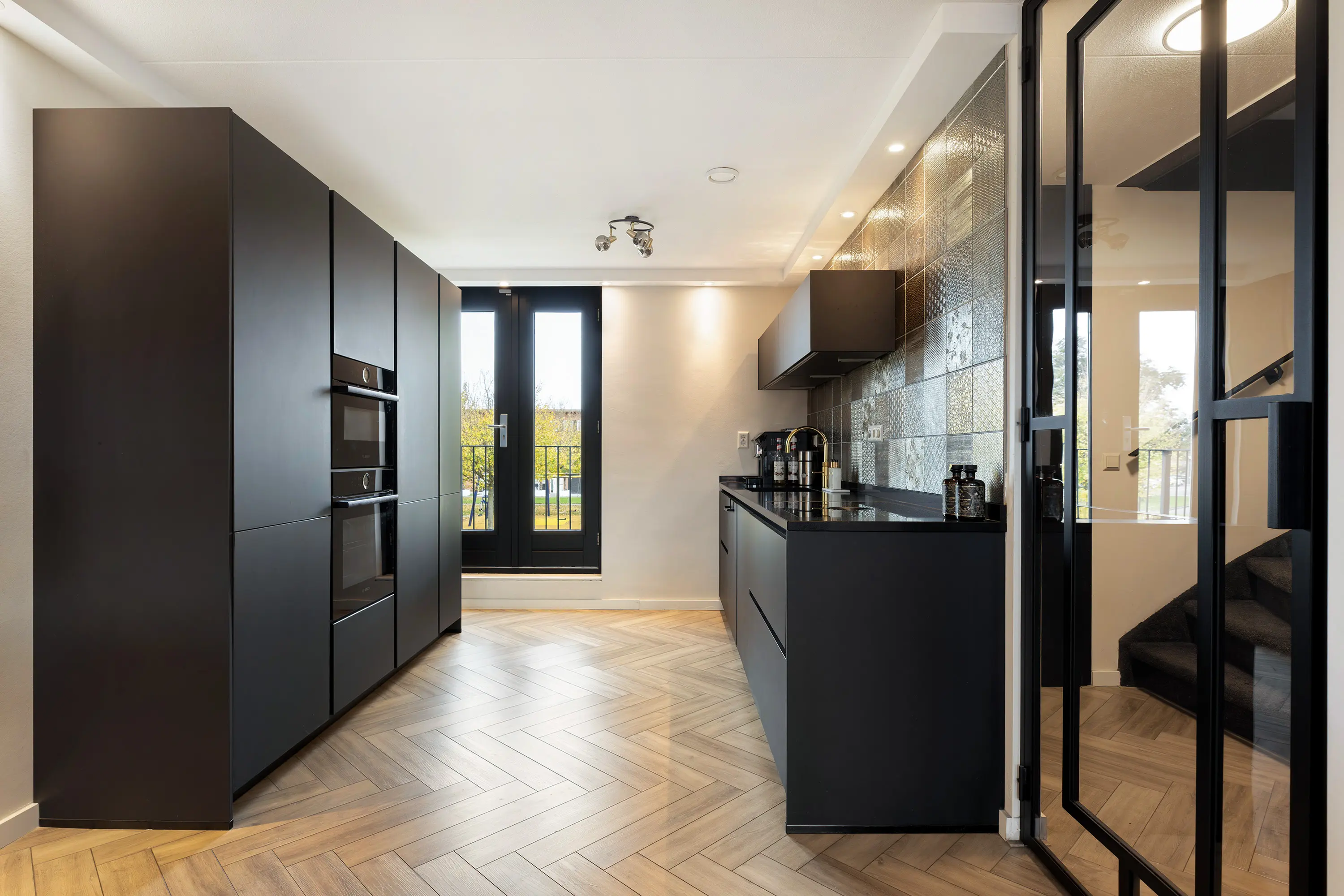 Aan de voorzijde bevindt zich de moderne zwarte keuken in twee rechte opstellingen, voorzien van: