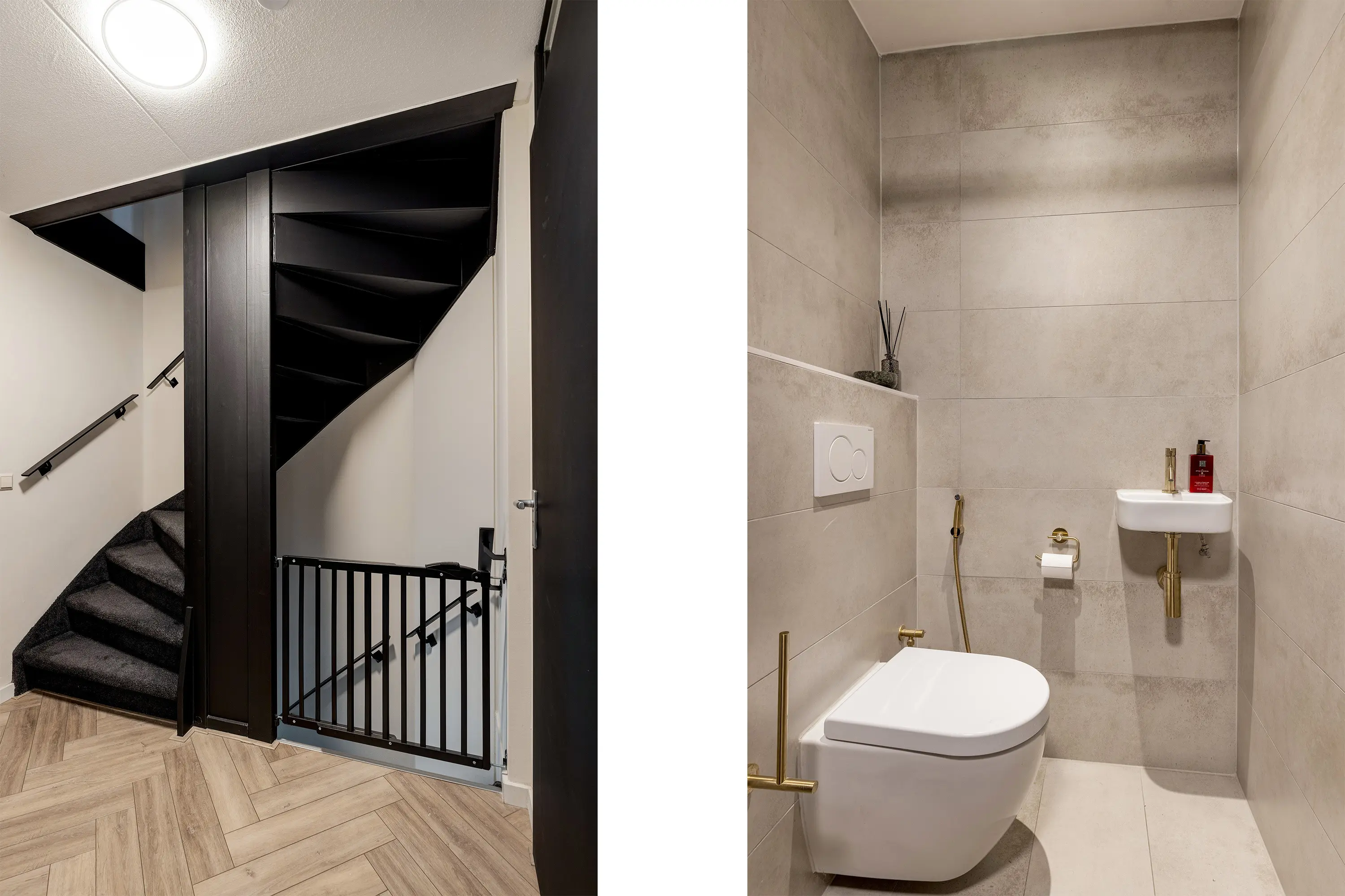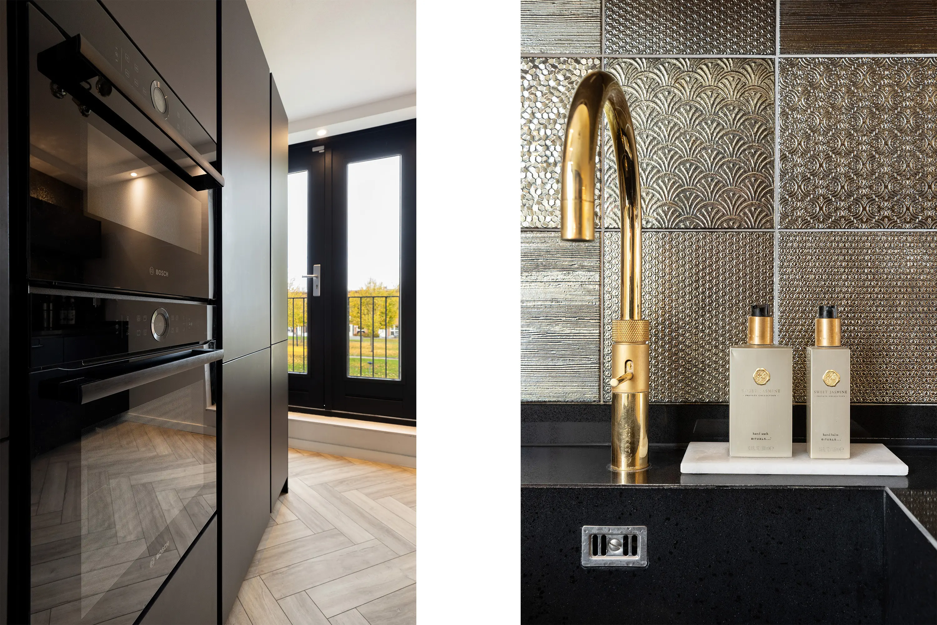 Goudkleurige Quooker in de keuken en stijlvolle gouden details in het toilet
