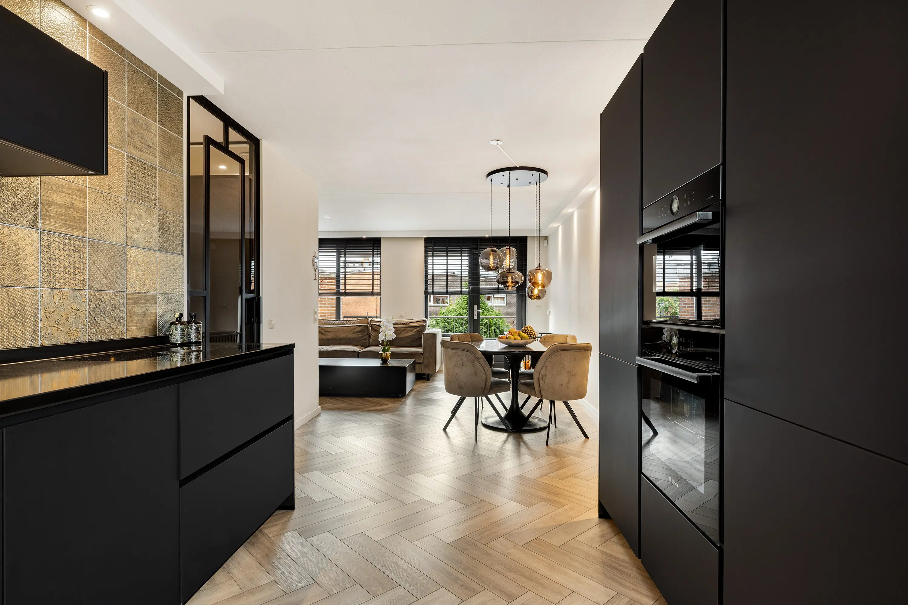 Luxe zwarte keuken met natuurstenen blad en hoogwaardige apparatuur