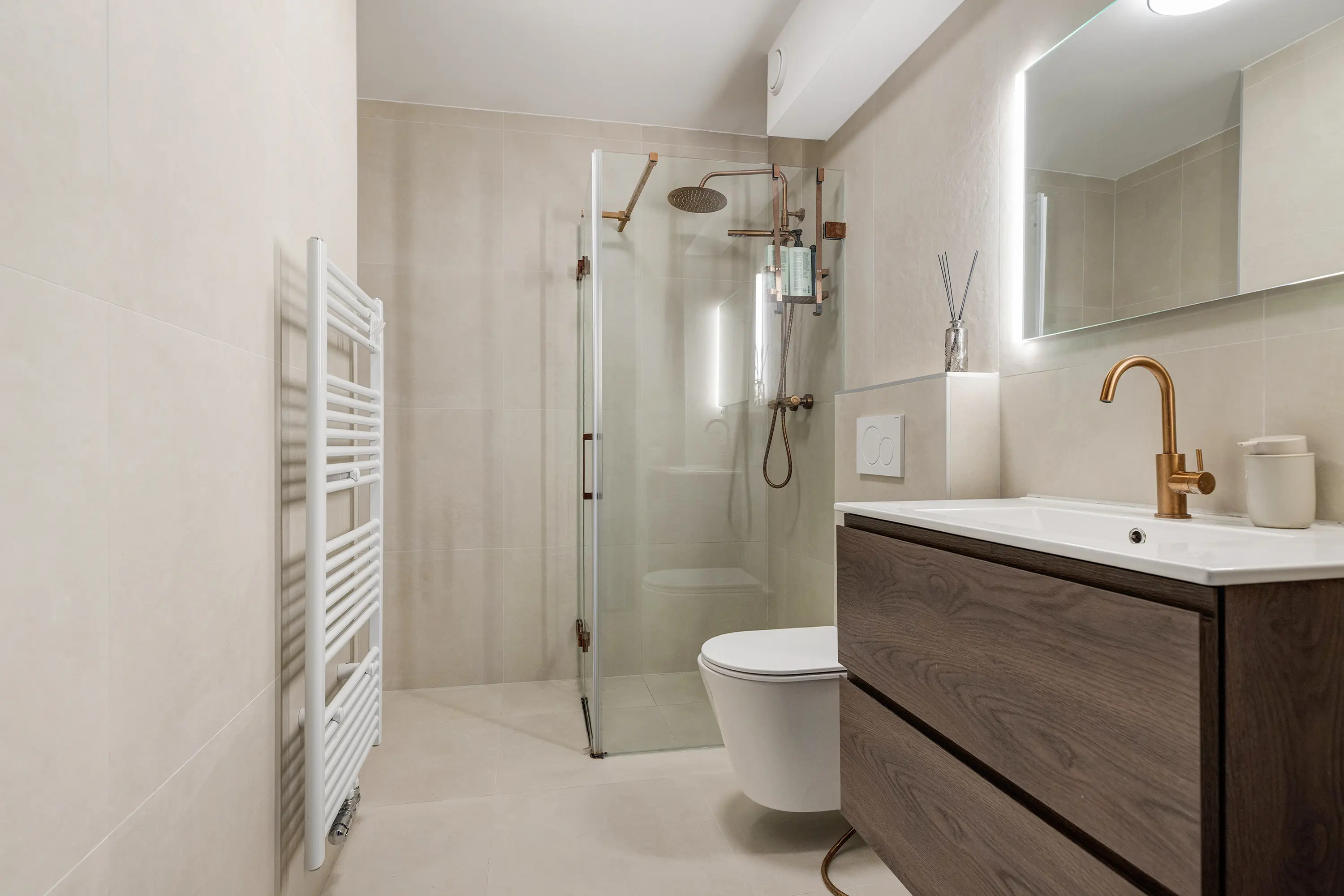 - Geheel betegeld in beige tinten en voorzien van: