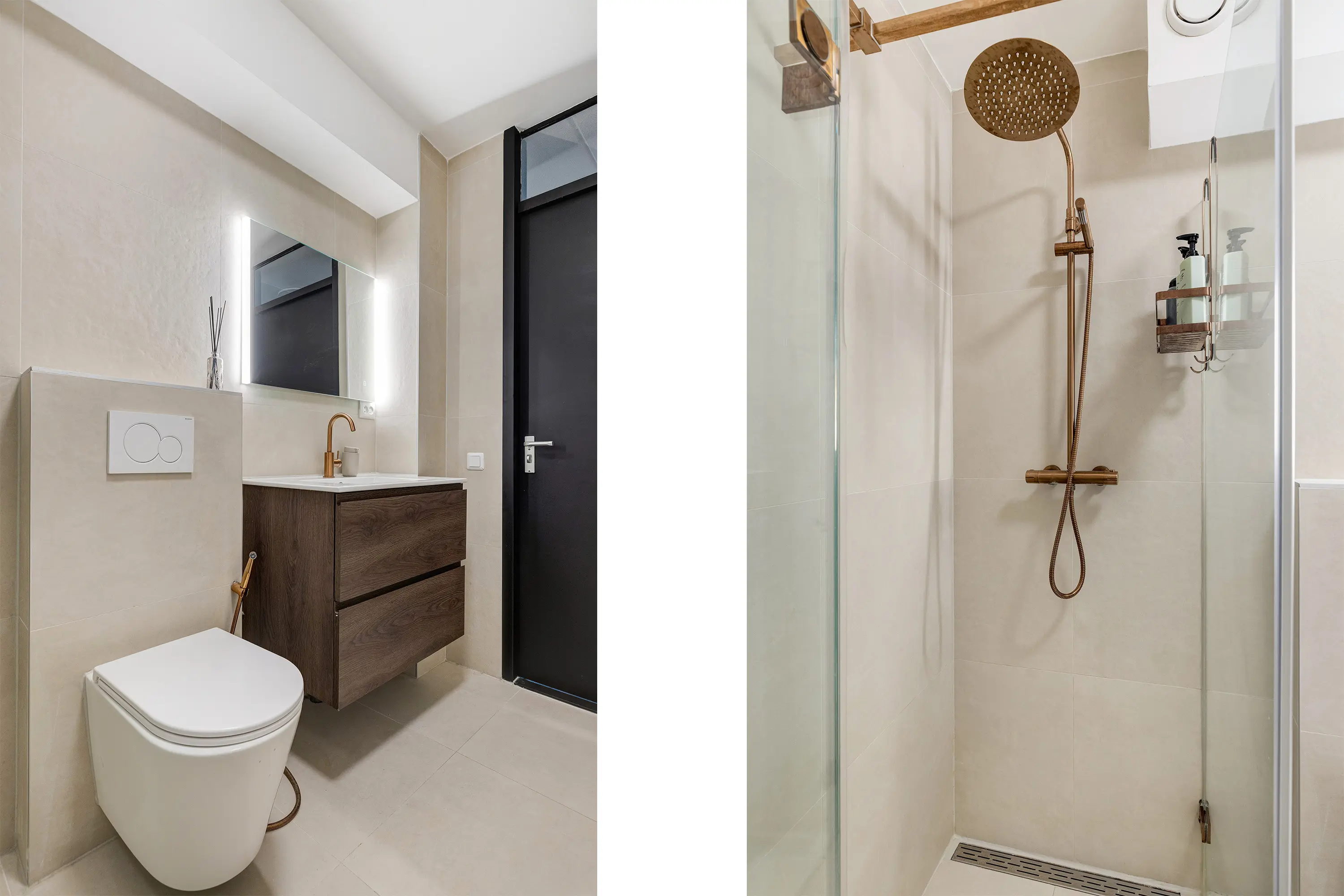 De toiletruimte is volledig betegeld in beige tinten en afgewerkt met gouden details en kranen.