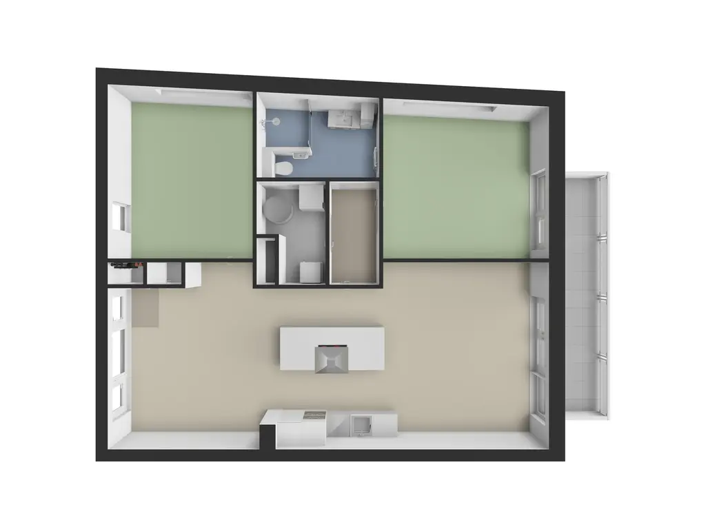 Bij binnenkomst van het appartement stapt u direct in de eetkamer, die in open verbinding staat met de centraal gelegen keuken en de woonkamer. De gehele woning is afgewerkt met een moderne pvc-vloer met comfortabele vloerverwarming en strak gestucte wanden en plafonds.