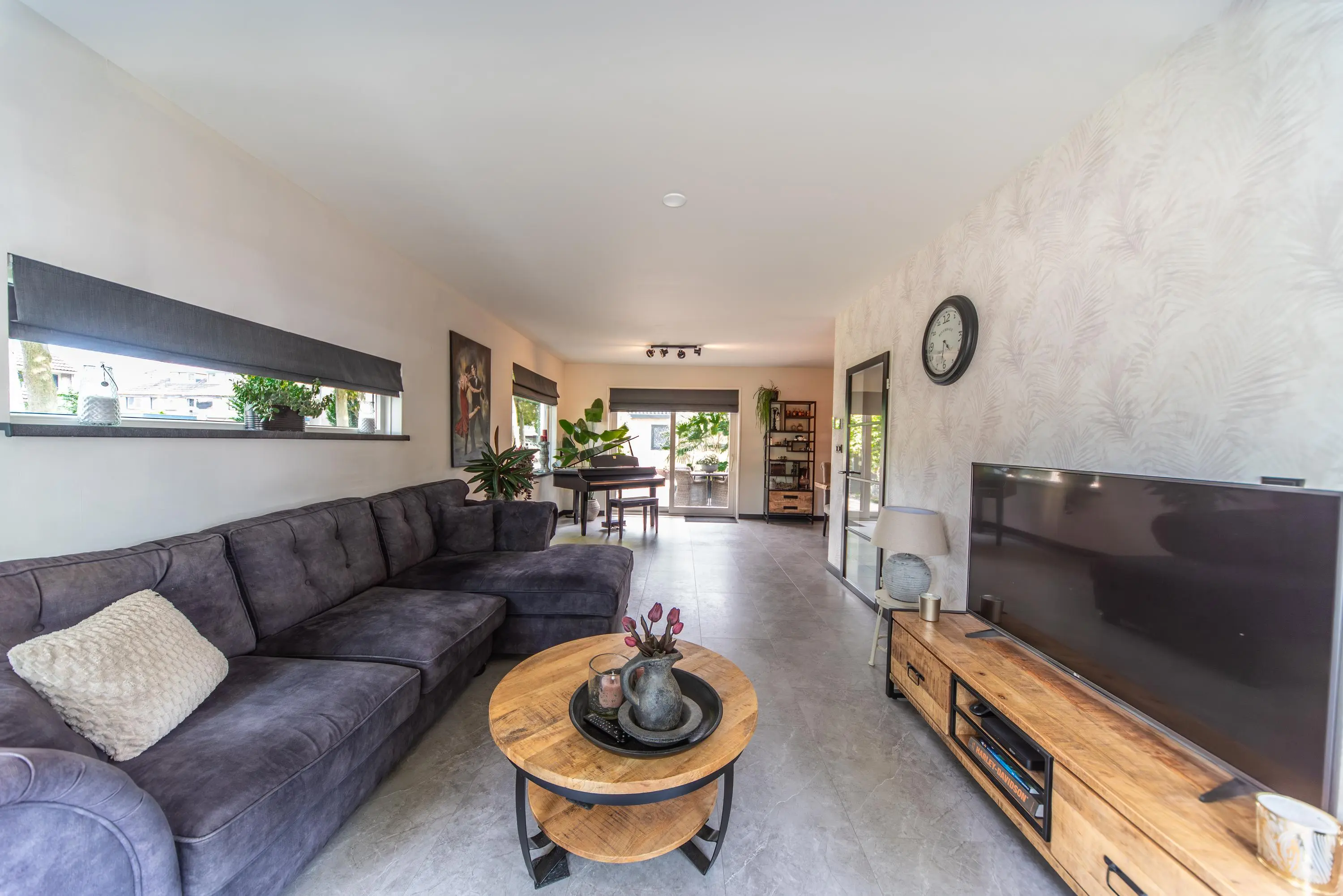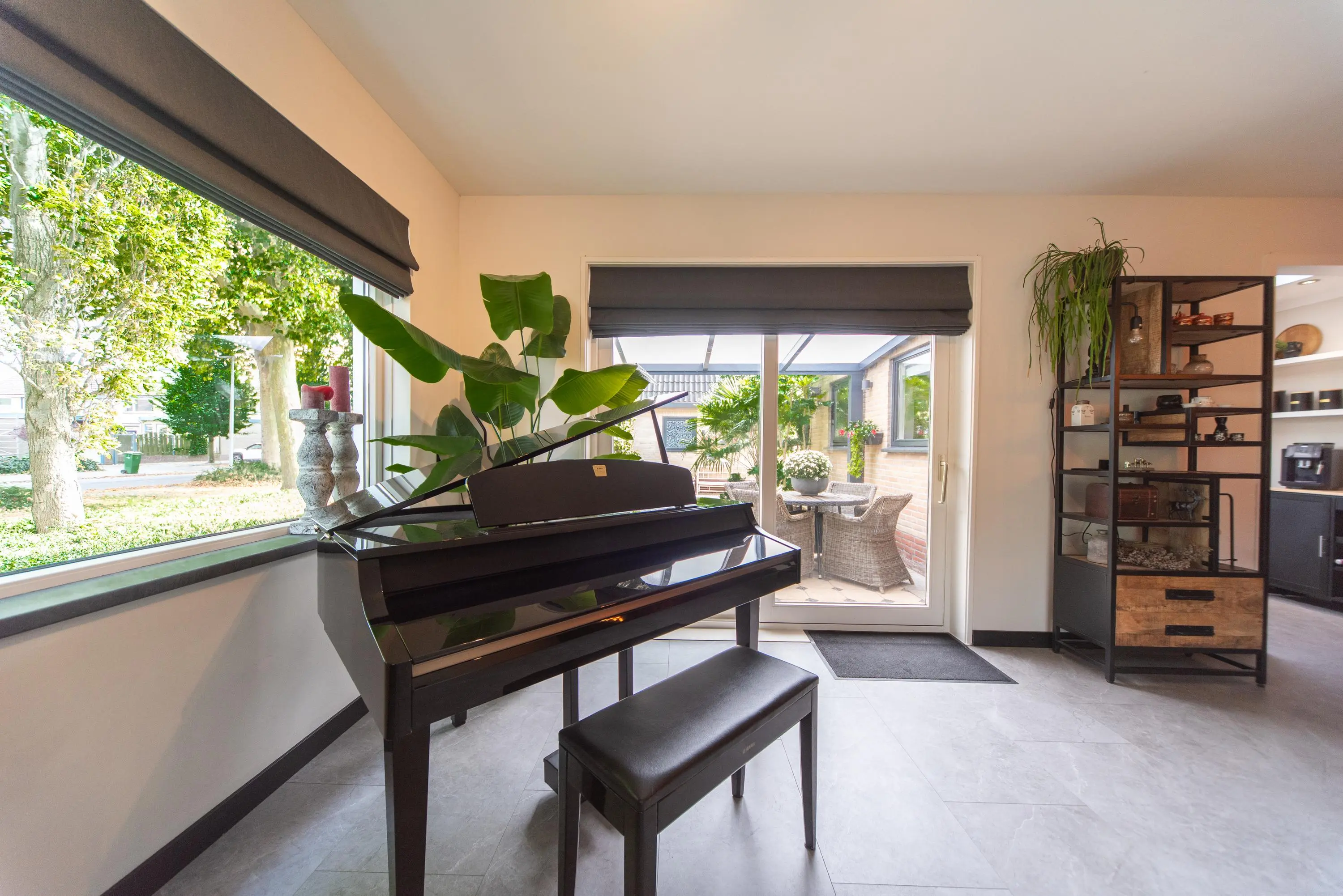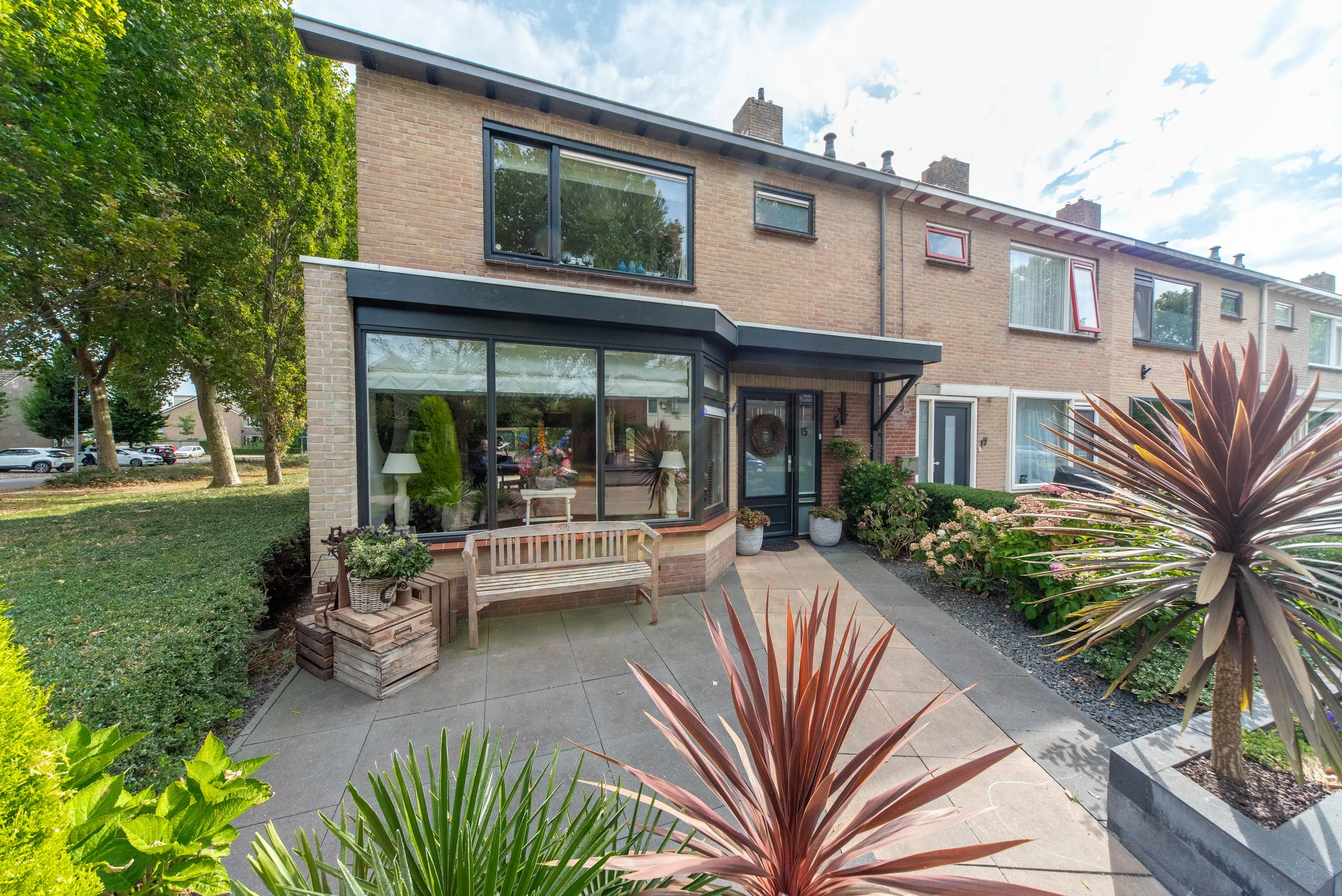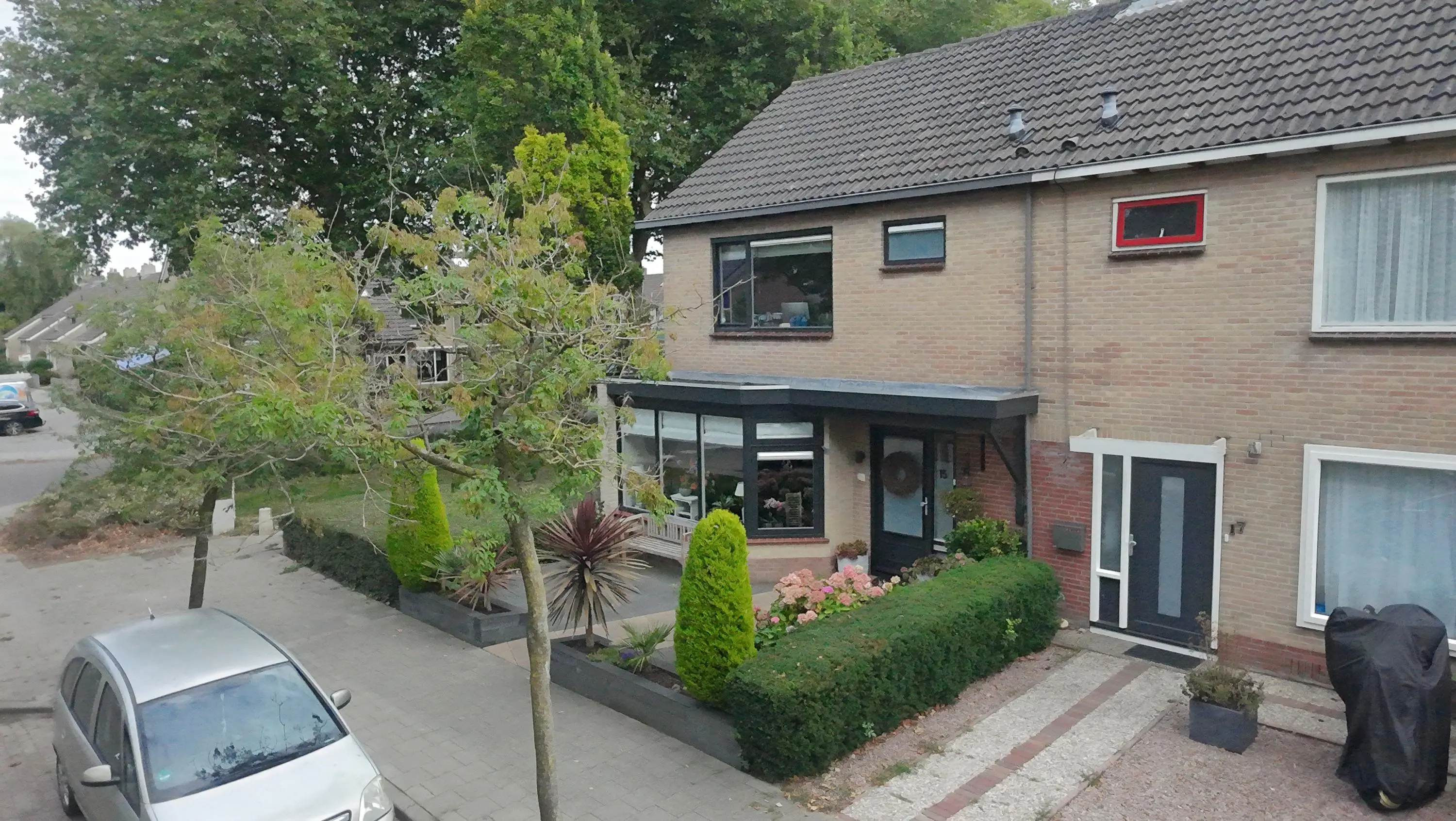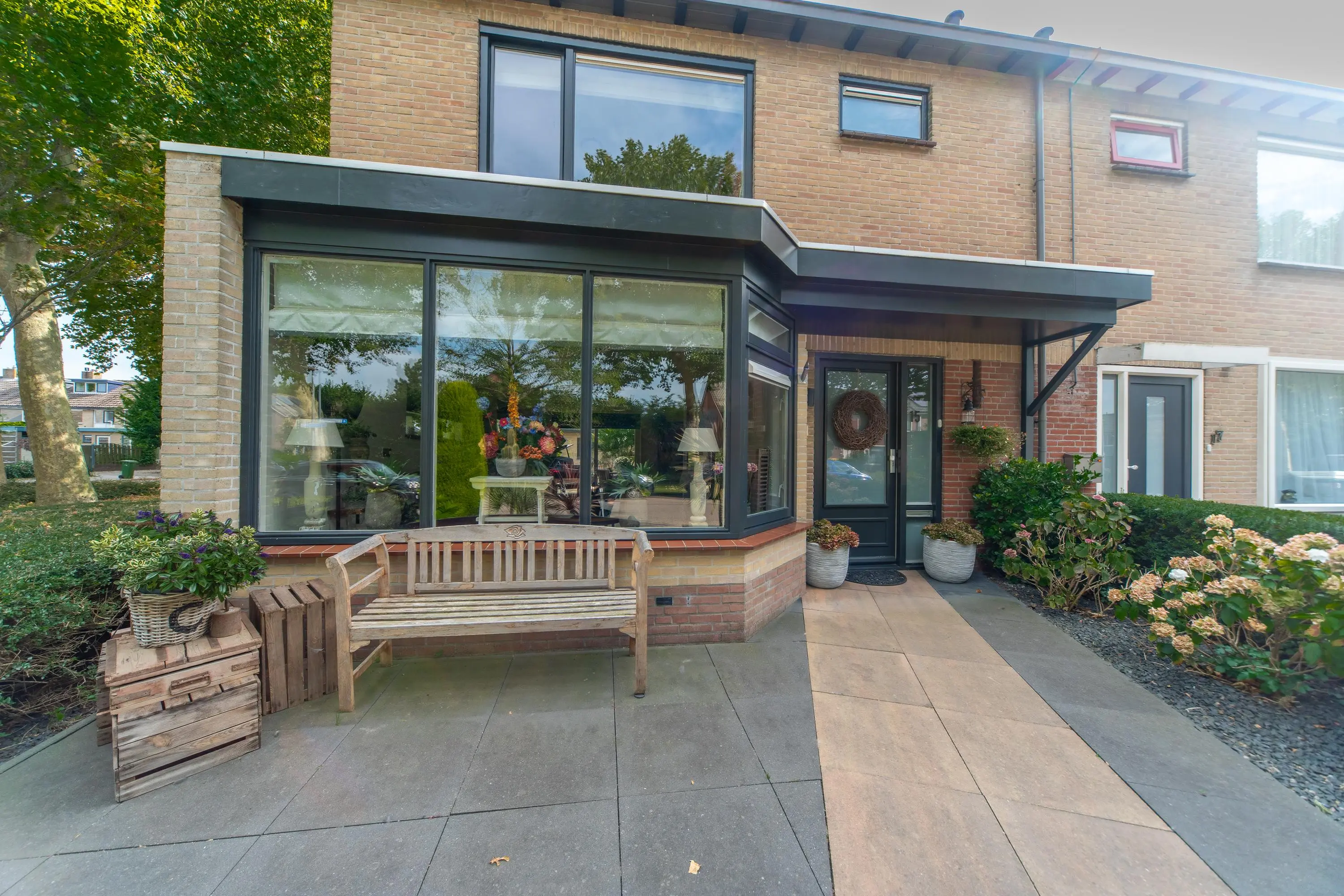 Als we de voortuin in komen lopen, valt het al gelijk op: strakke bestrating, verzorgde planten, luxe erker, dit is een woning met een hoog afwerkingsniveau. De juiste materialen zijn gebruikt en u voelt gelijk een warme, moderne, luxe sfeer die u normaal alleen in woningmagazines tegenkomt. Als we de woning betreden via de voordeur, komen we uit in een vestibule waar zich de in 2024 vernieuwde meterkast en toiletruimte met vrijhangend wandcloset en fonteintje bevindt. Vervolgens komen we uit in de grote hal met kapstok en slimme opbergplek voor alle schoenen, weggewerkt onder de trapopgang naar boven. In de hal bevindt zich ook de entree naar de zonnige doorzonwoonkamer, waar zelfs genoeg ruimte is voor de stijlvolle zwarte piano. Er valt veel licht in de woonkamer doordat er aan de voorzijde van de woning een erker geplaatst is, het een eindwoning betreft met aan de oostkant van de woning 2 ramen en aan de achterzijde hebben we nog een royale schuifpui naar de op het zuiden gelegen zonnige tuin met nieuw geplaatste aluminium overkapping waar u 's morgens heerlijk met een kopje koffie in de hand uw favoriete krantje leest.