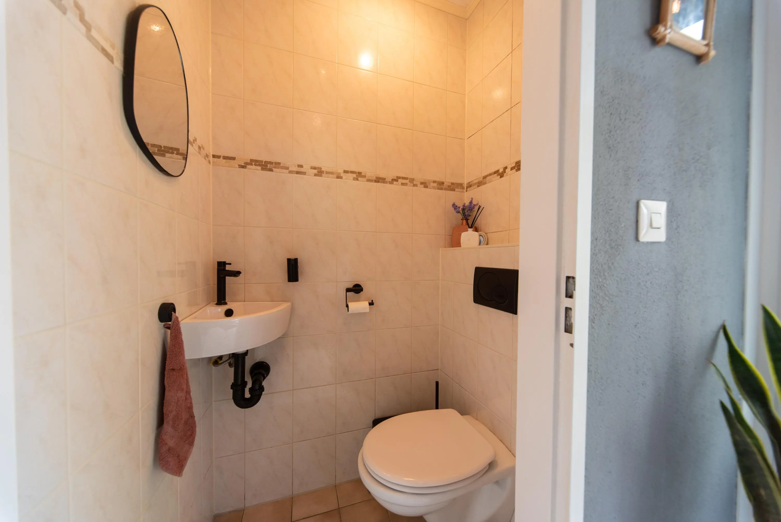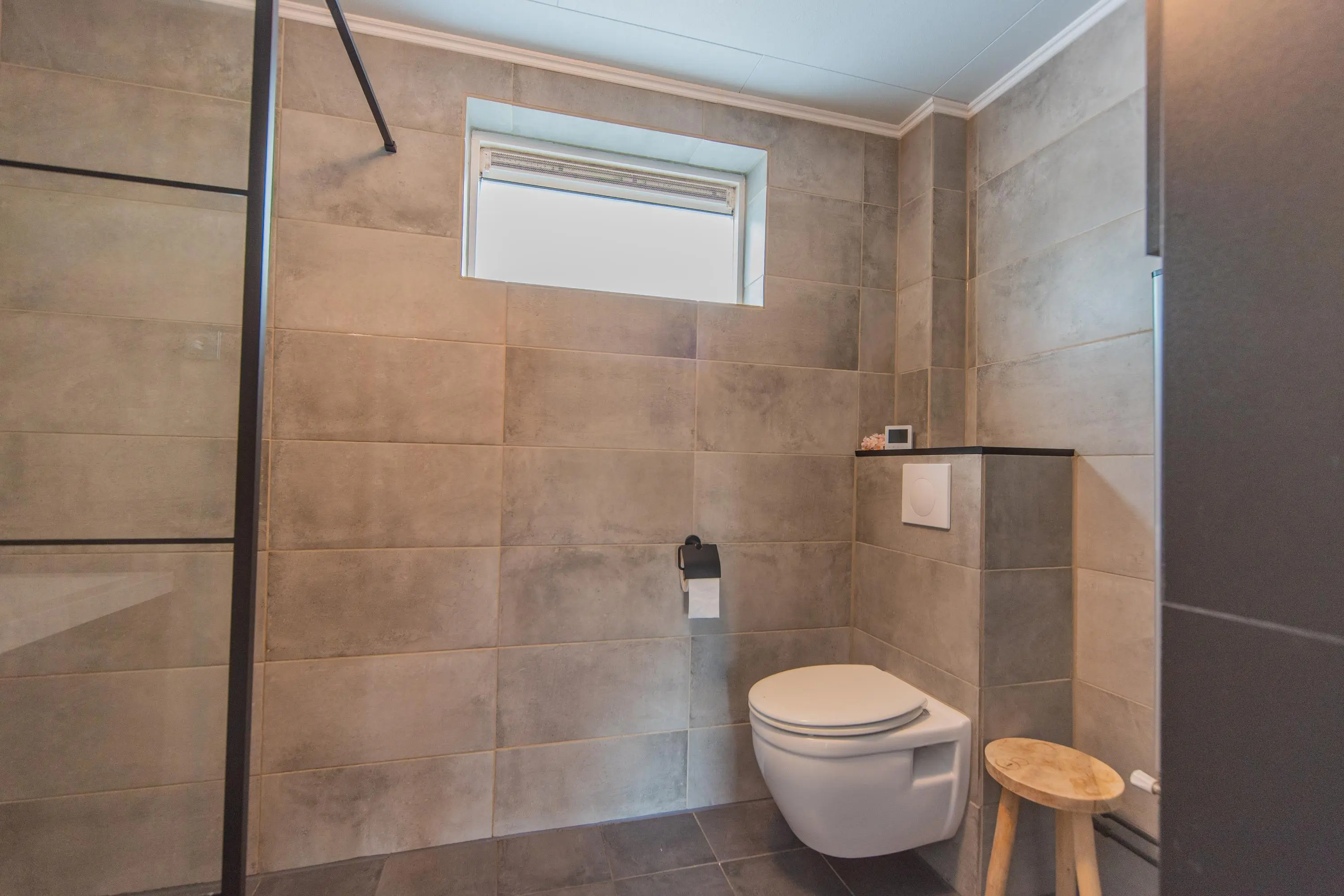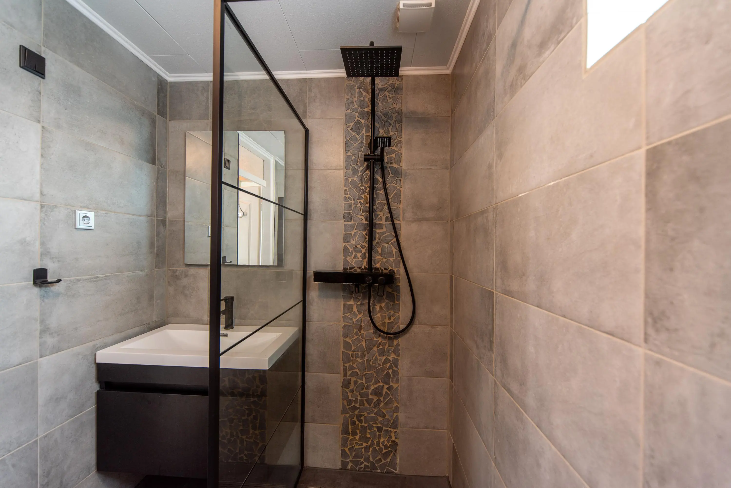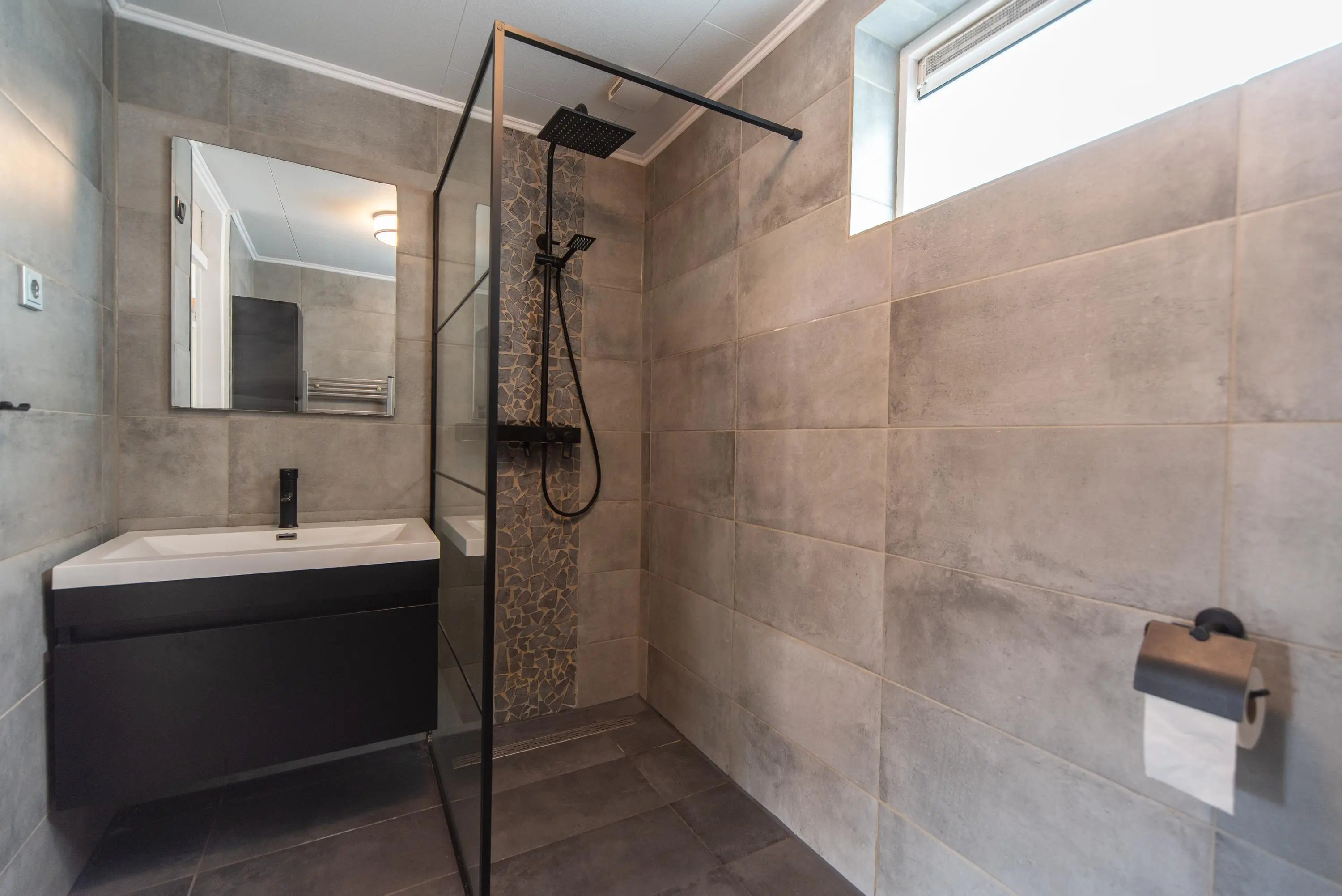 De badkamer is voorzien van een vrijhangend wandcloset, inloopdouche met regen- en losse handdouche en een modern badkamermeubel met spiegel. Door de gekozen kleur van de wandtegels i.c.m. sierstenen als wandbekleding in de douche waant u zich bijna in een luxe spa of wellness.