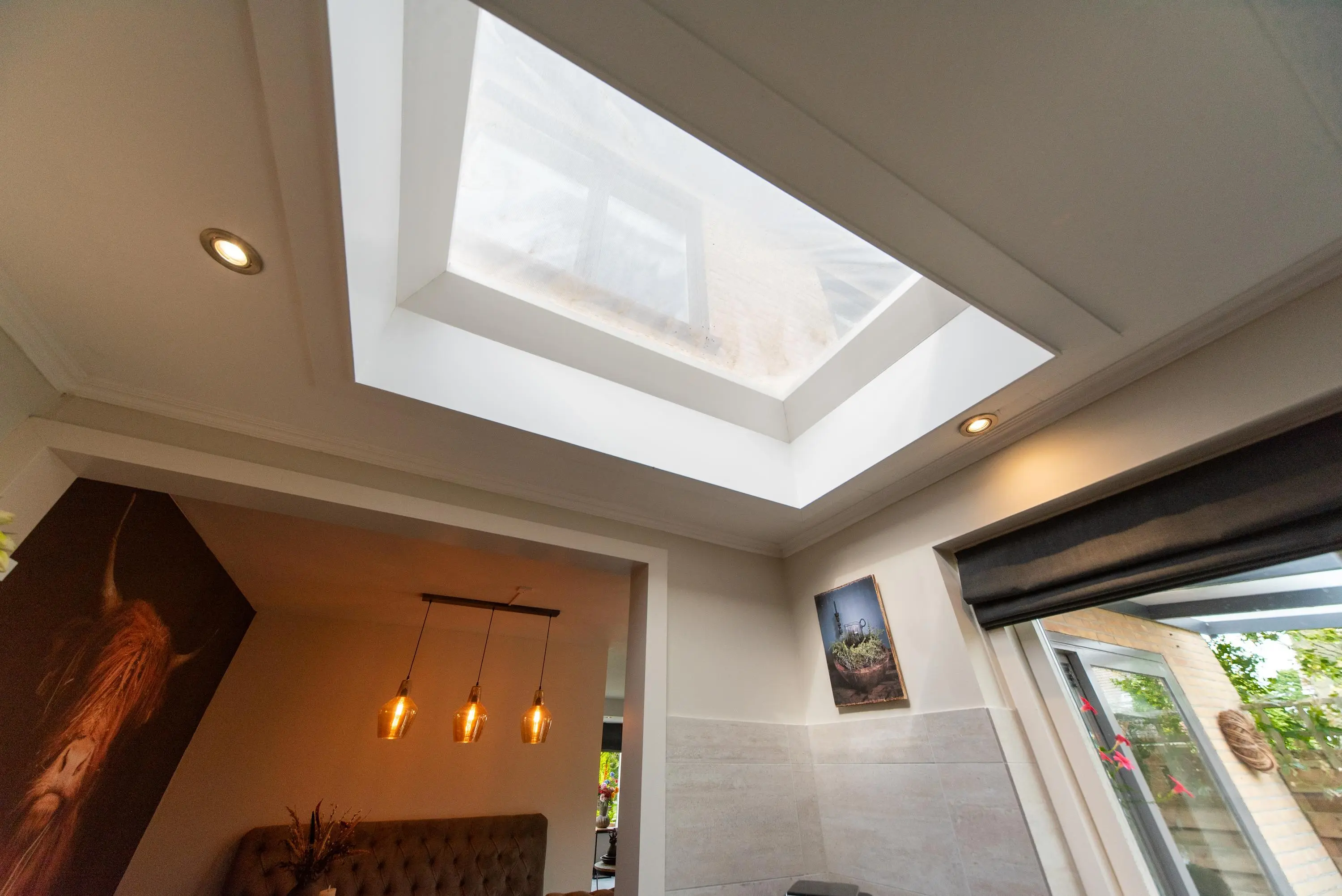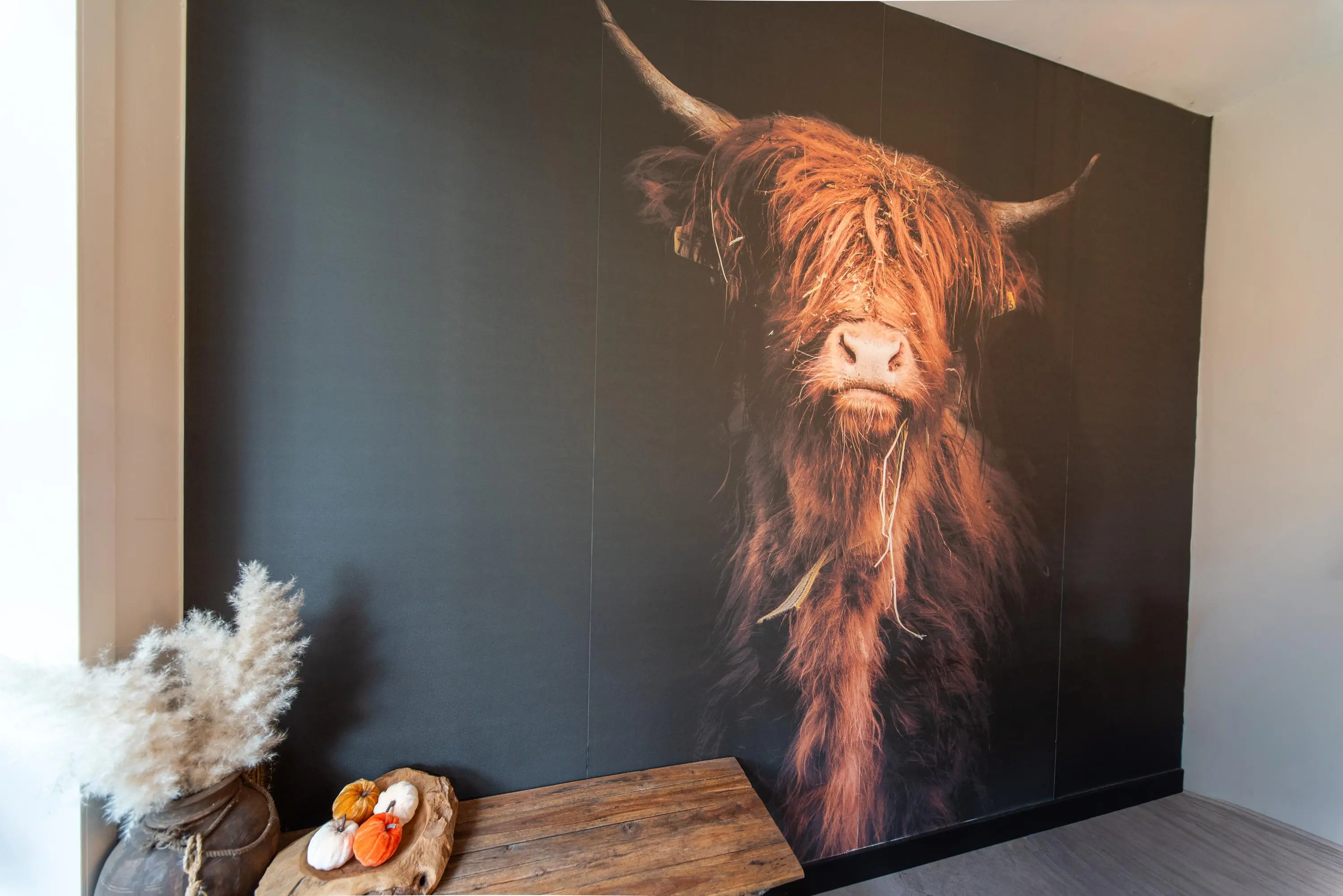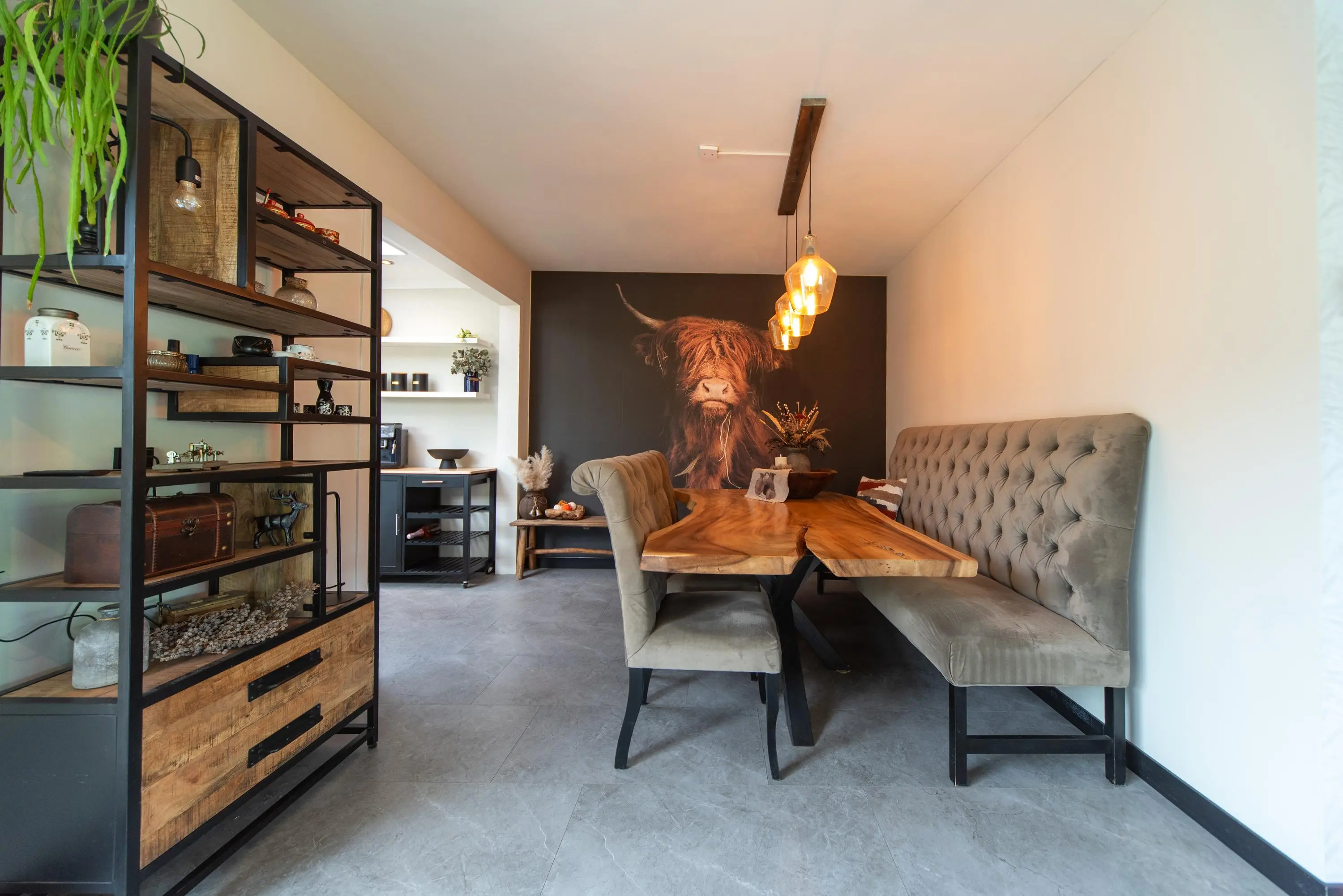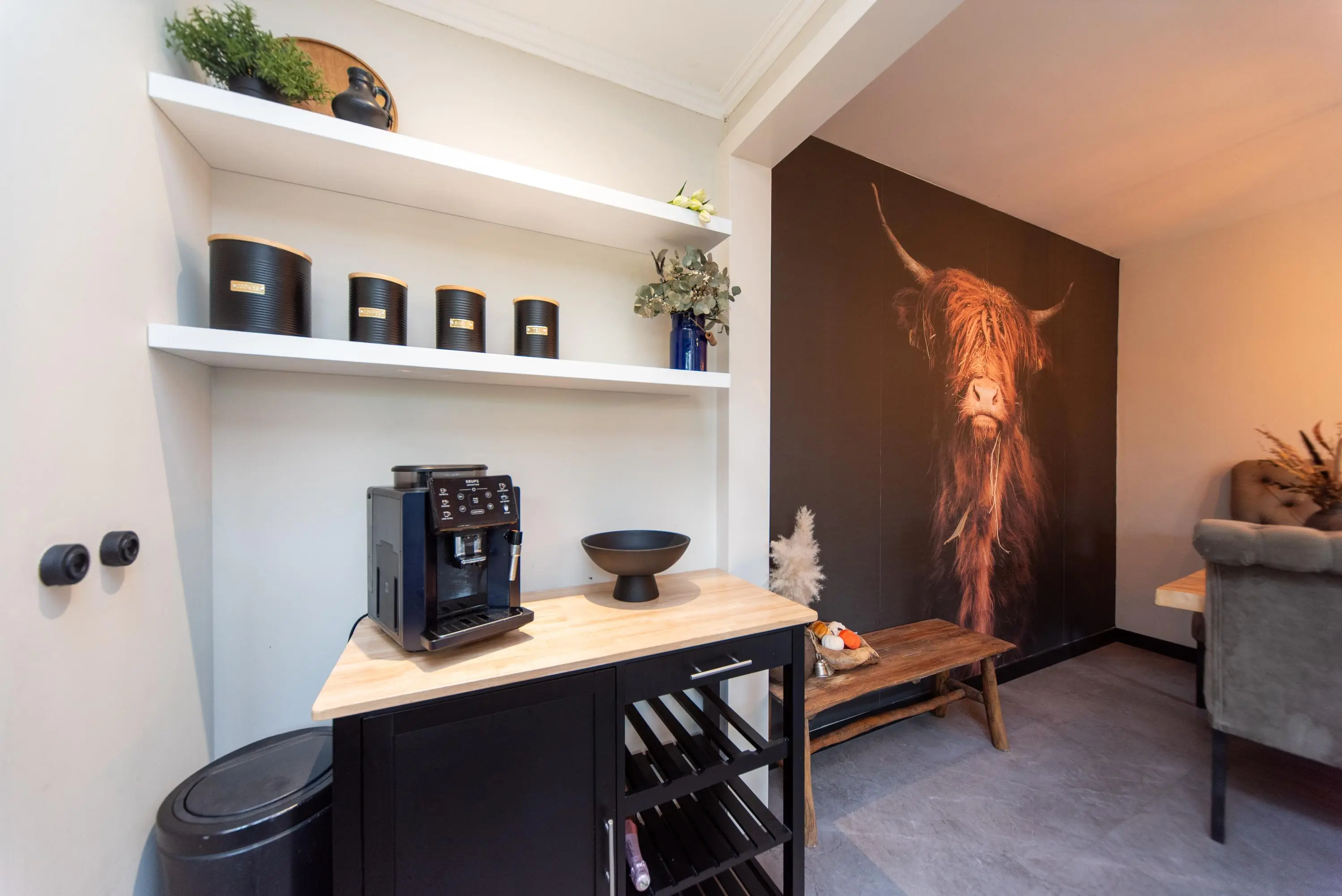 Lopen we richting de nagenoeg nieuwe keuken, dan valt gelijk de massieve eetkamertafel met luxe zitbank op, waar we recht in de ogen kijken van een Schotse hooglander in de vorm van een volledige muurbekleding van wand tot wand, een noemenswaardig detail waar iedereen u tijdens de heerlijke etentjes met familie of vrienden u zeker mee zal complimenteren.
