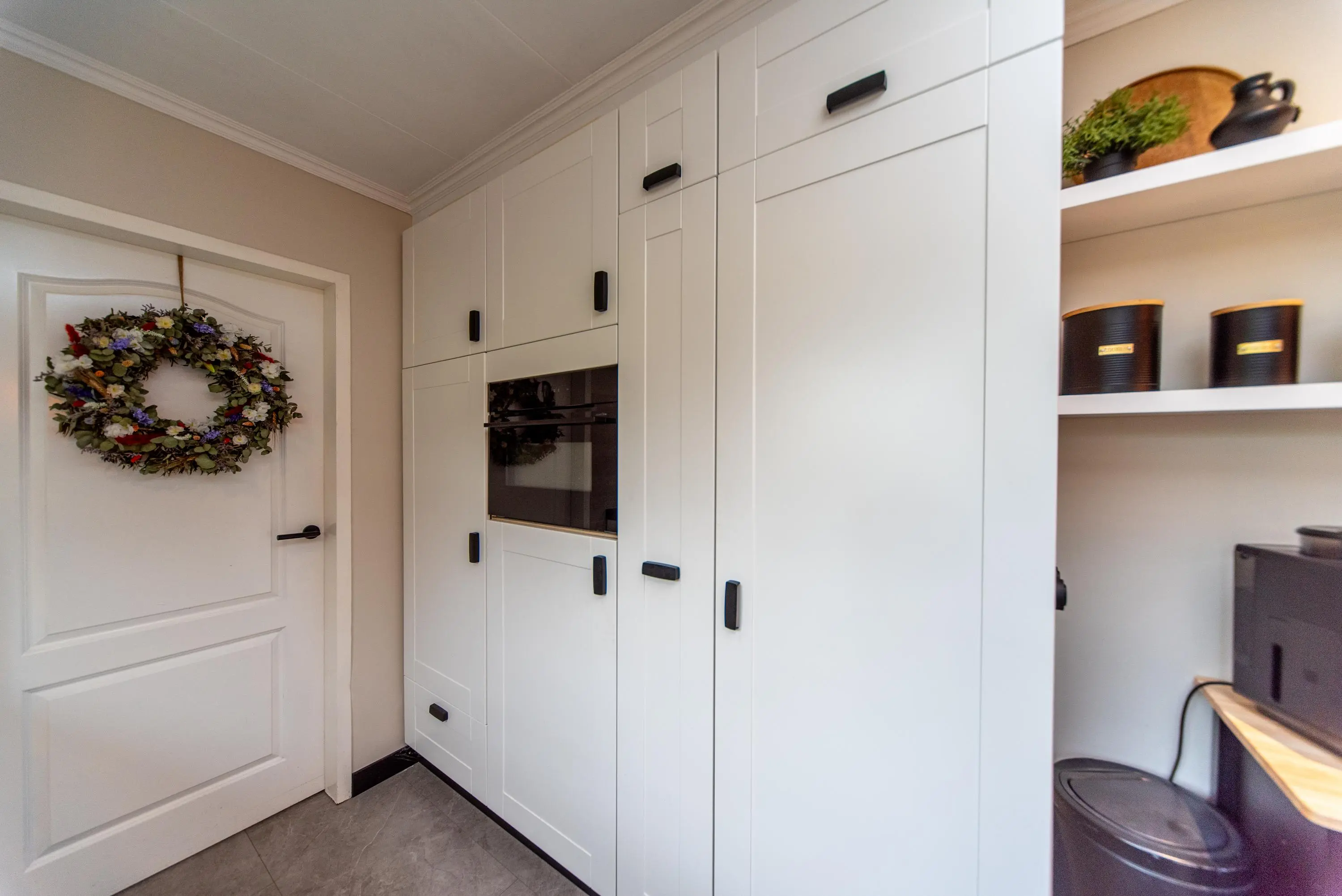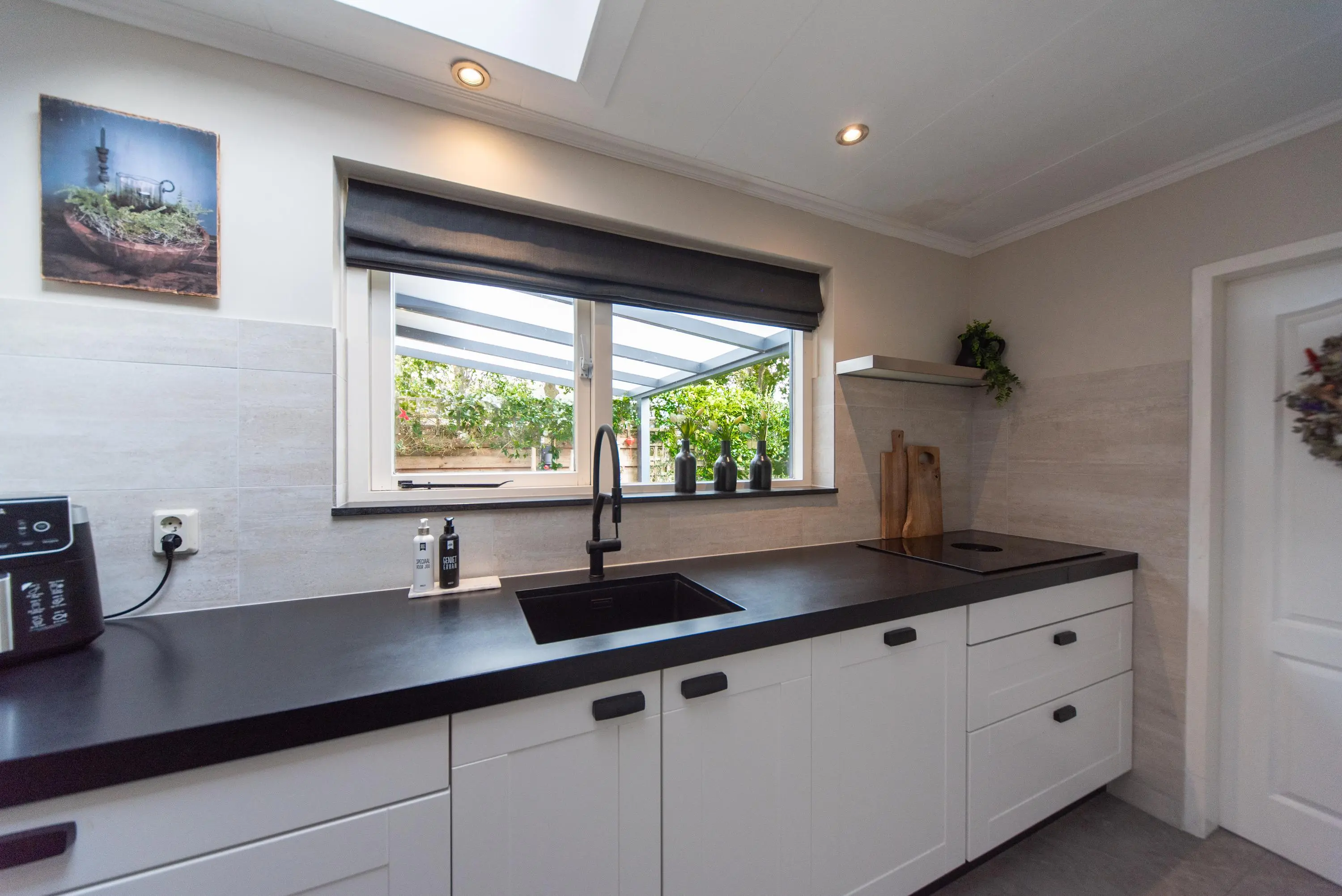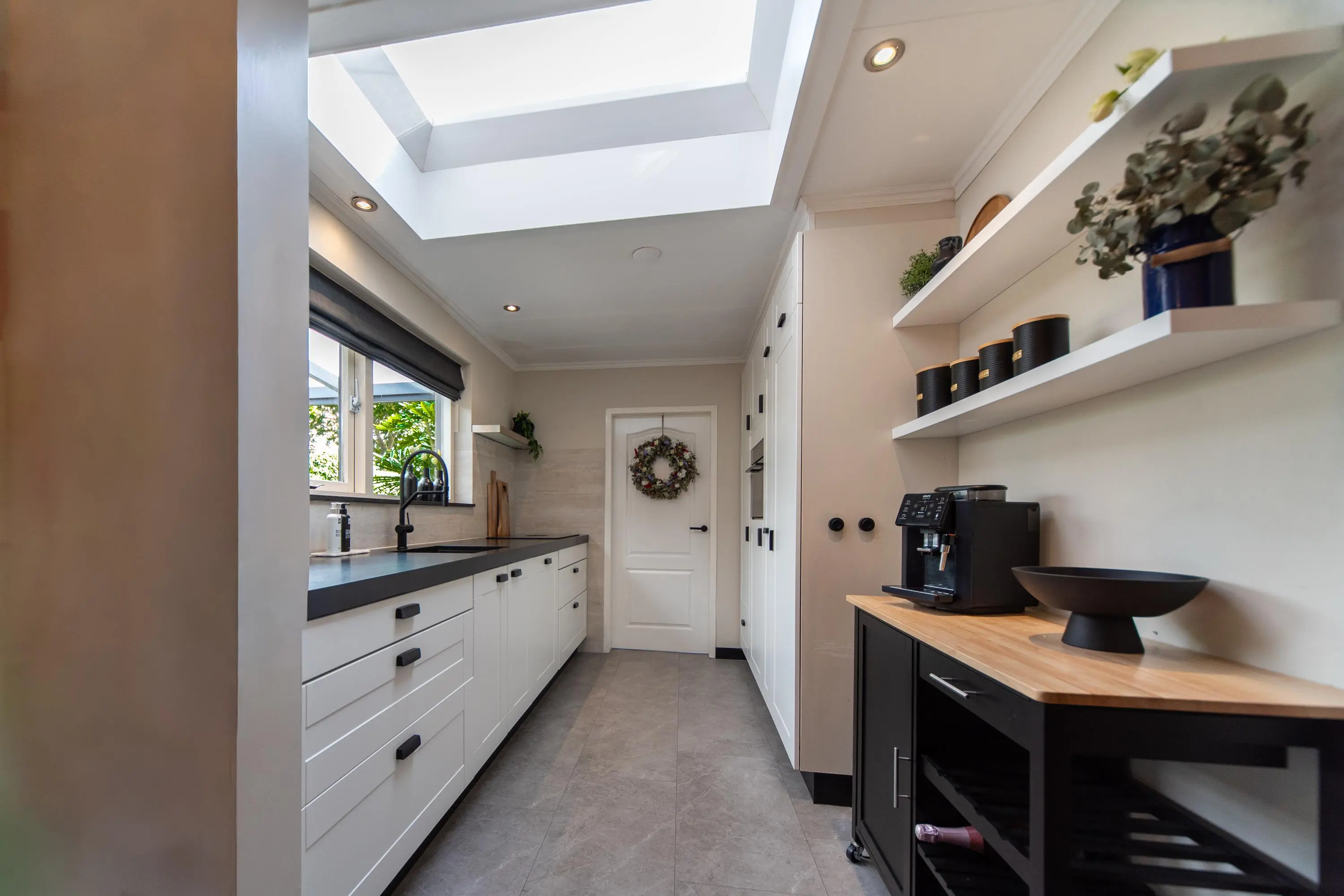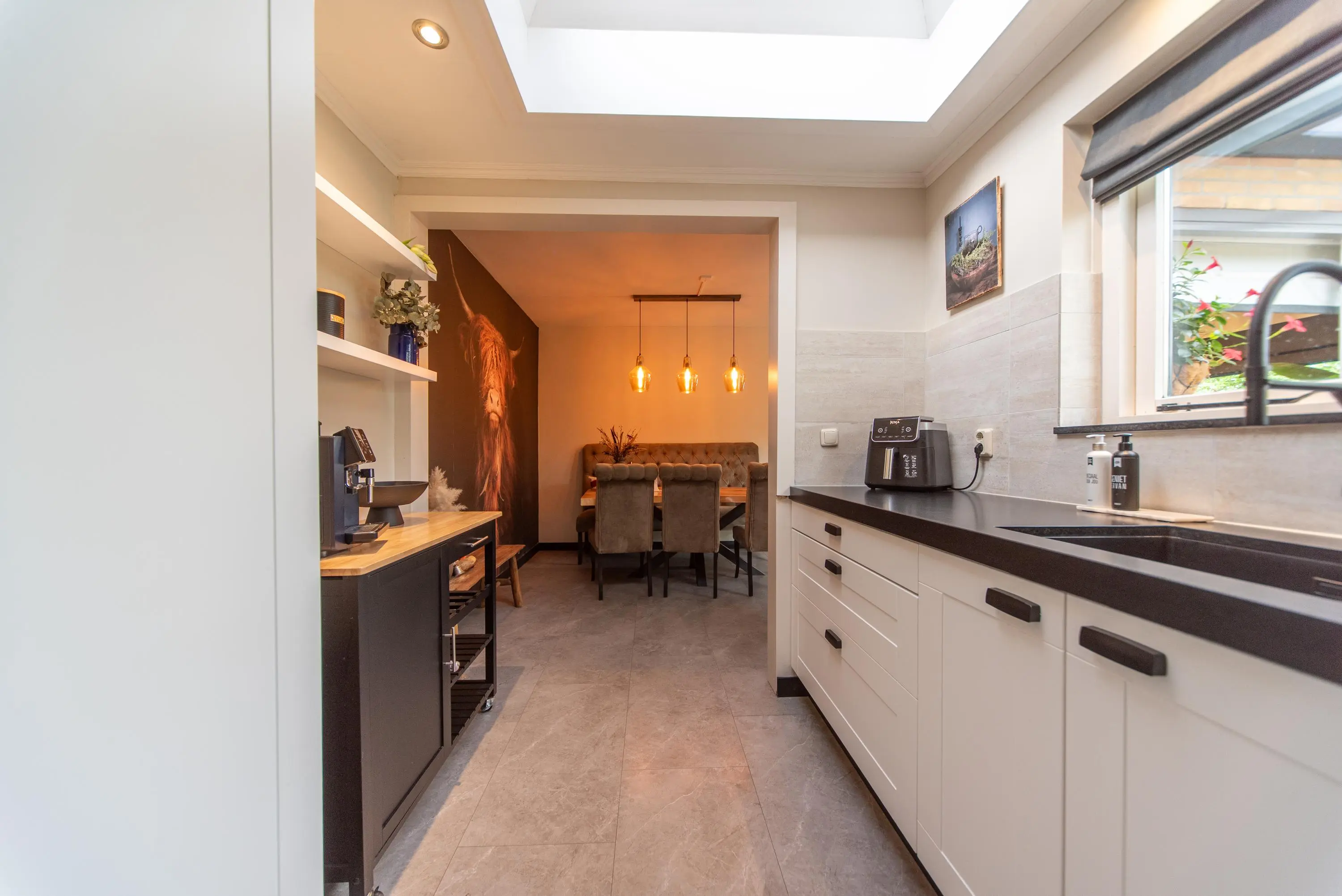 De volledig in 2024/2025 vernieuwde, in wit met zwart uitgevoerde keuken is voorzien van een luxueuze lichtkoepel en de nieuwste moderne inbouwapparatuur, zoals een Bora-inductiekookplaat met ingebouwd afzuigsysteem, een vaatwasser, een magnetron/combi-oven en een aparte koelkast en vriezer. De huidige eigenaren hebben hier ook een heuse koffiecorner gecreëerd waar u een heerlijke cappuccino of espresso kunt maken.