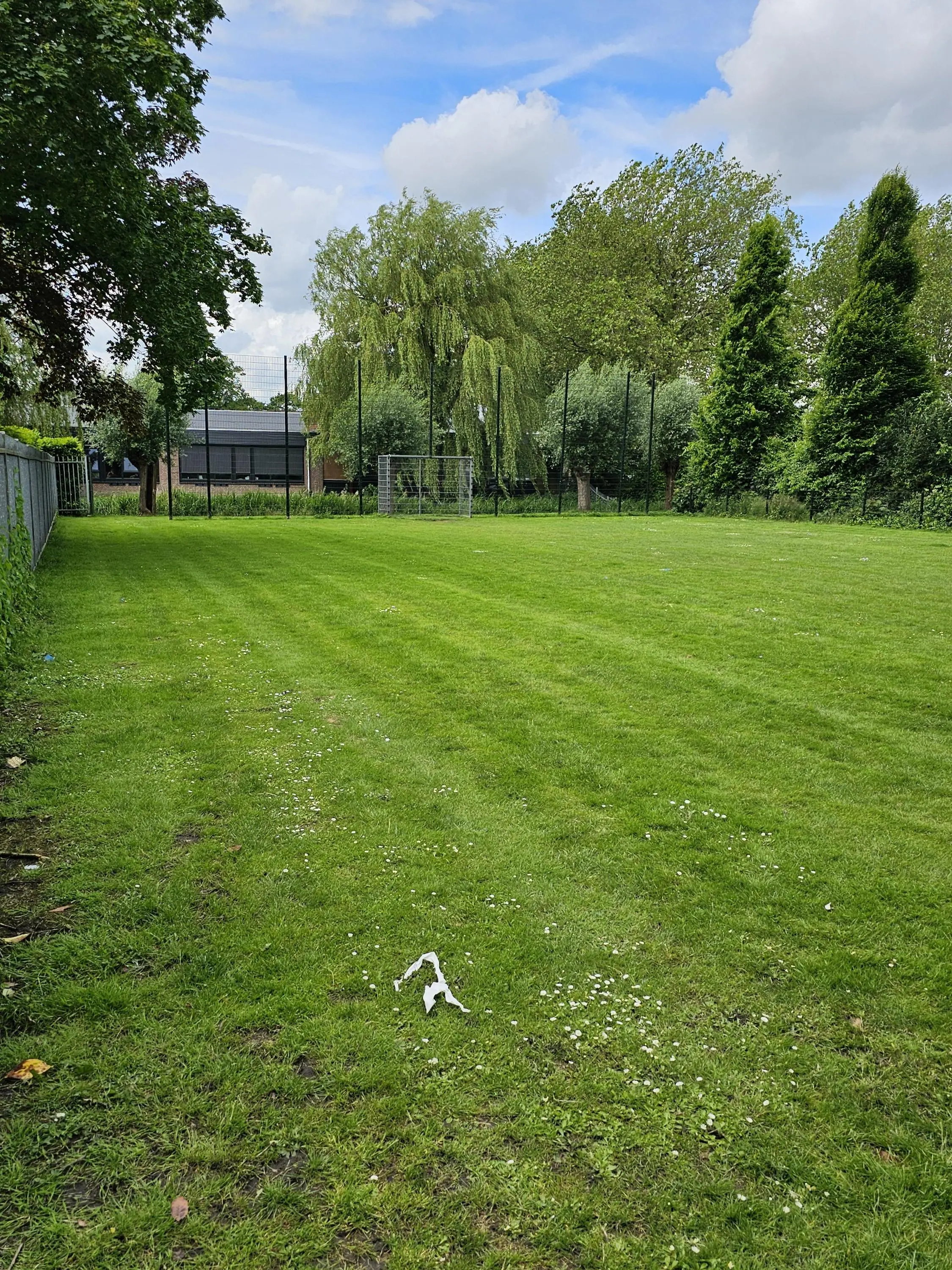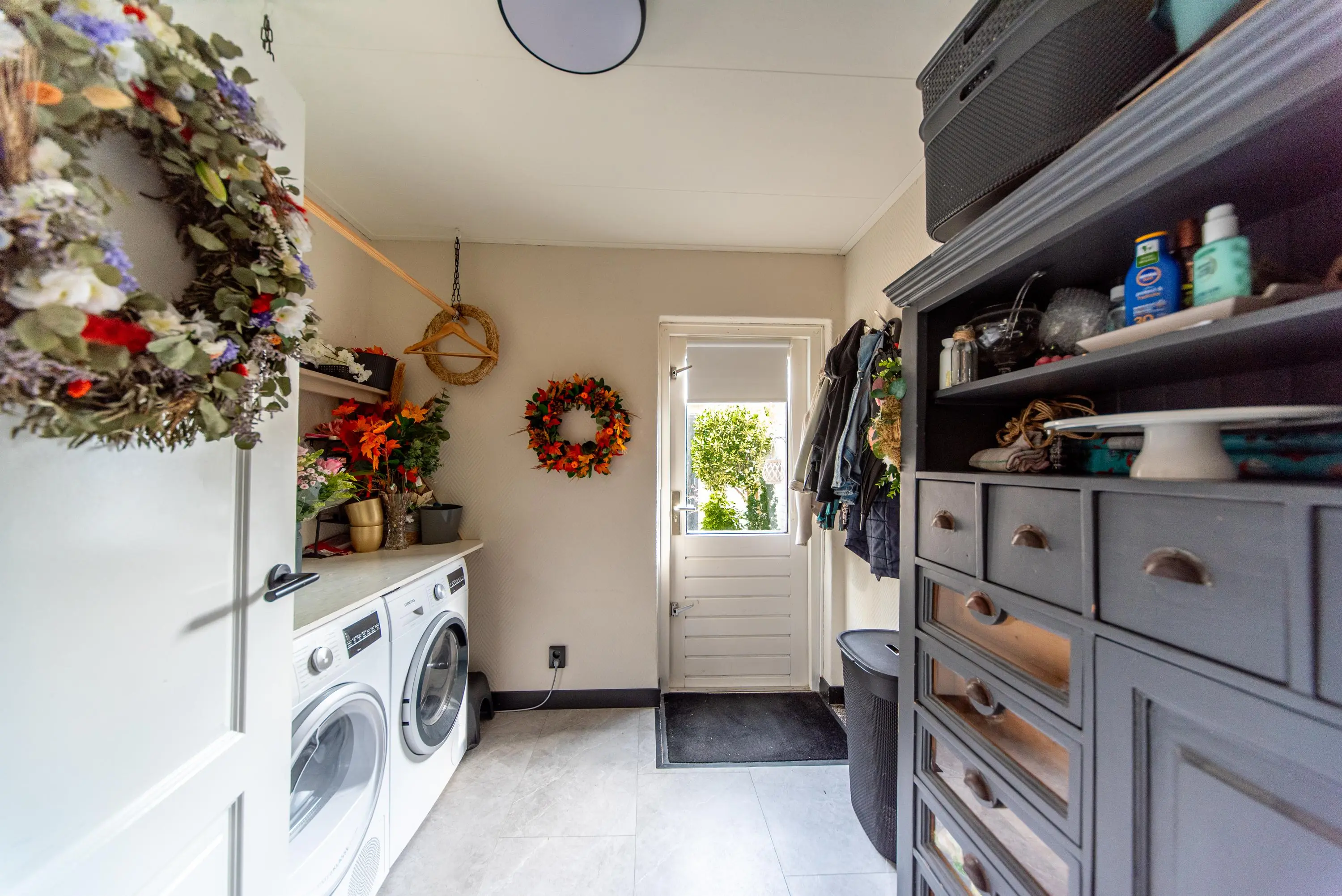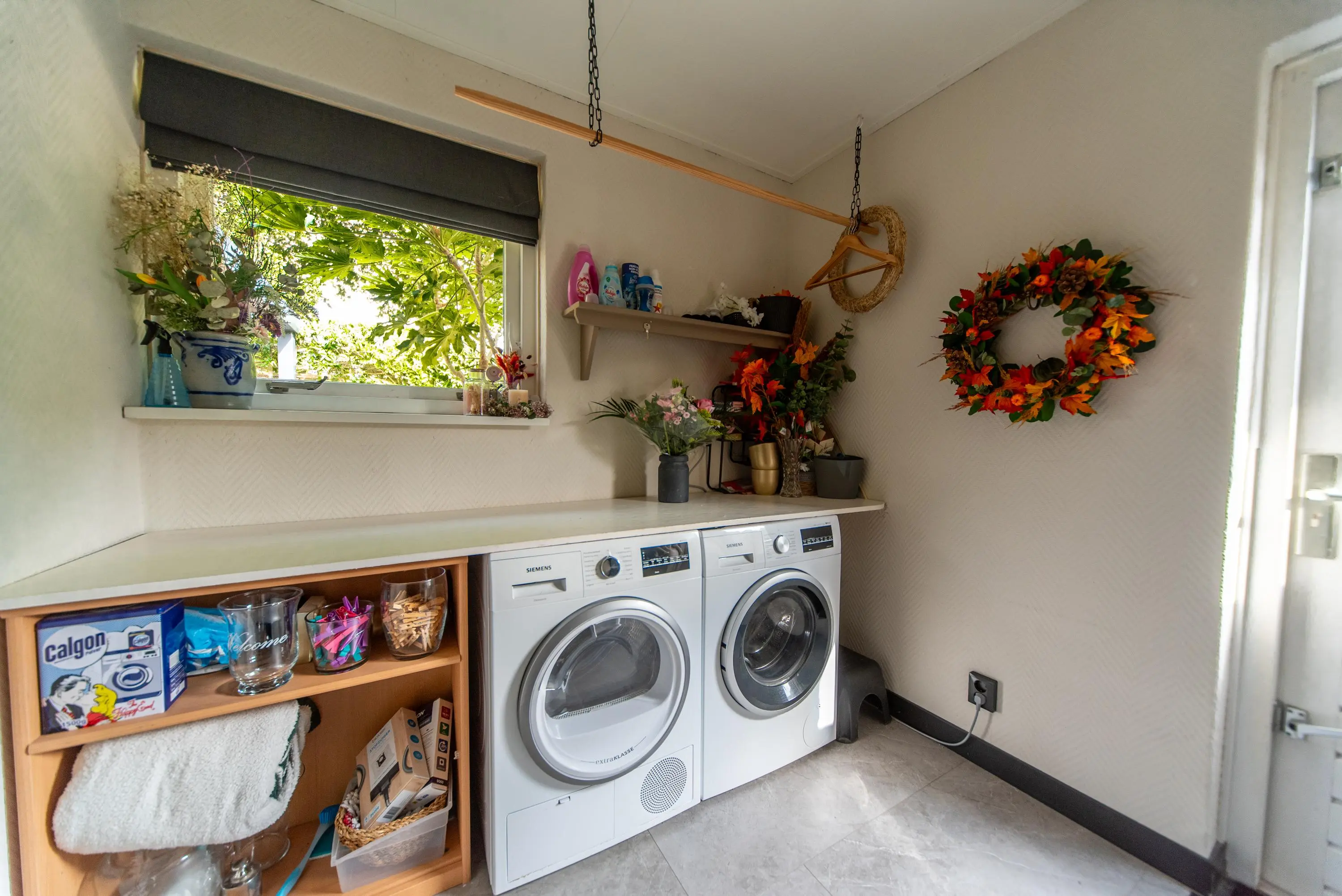 We kunnen de tuin betreden door de zojuist genoemde schuifpui, maar ook via de aan de keuken grenzende bijkeuken, waar momenteel de was- en drooggelegenheid is geplaatst onder een werkblad waar u fluitend de was op kunt vouwen.