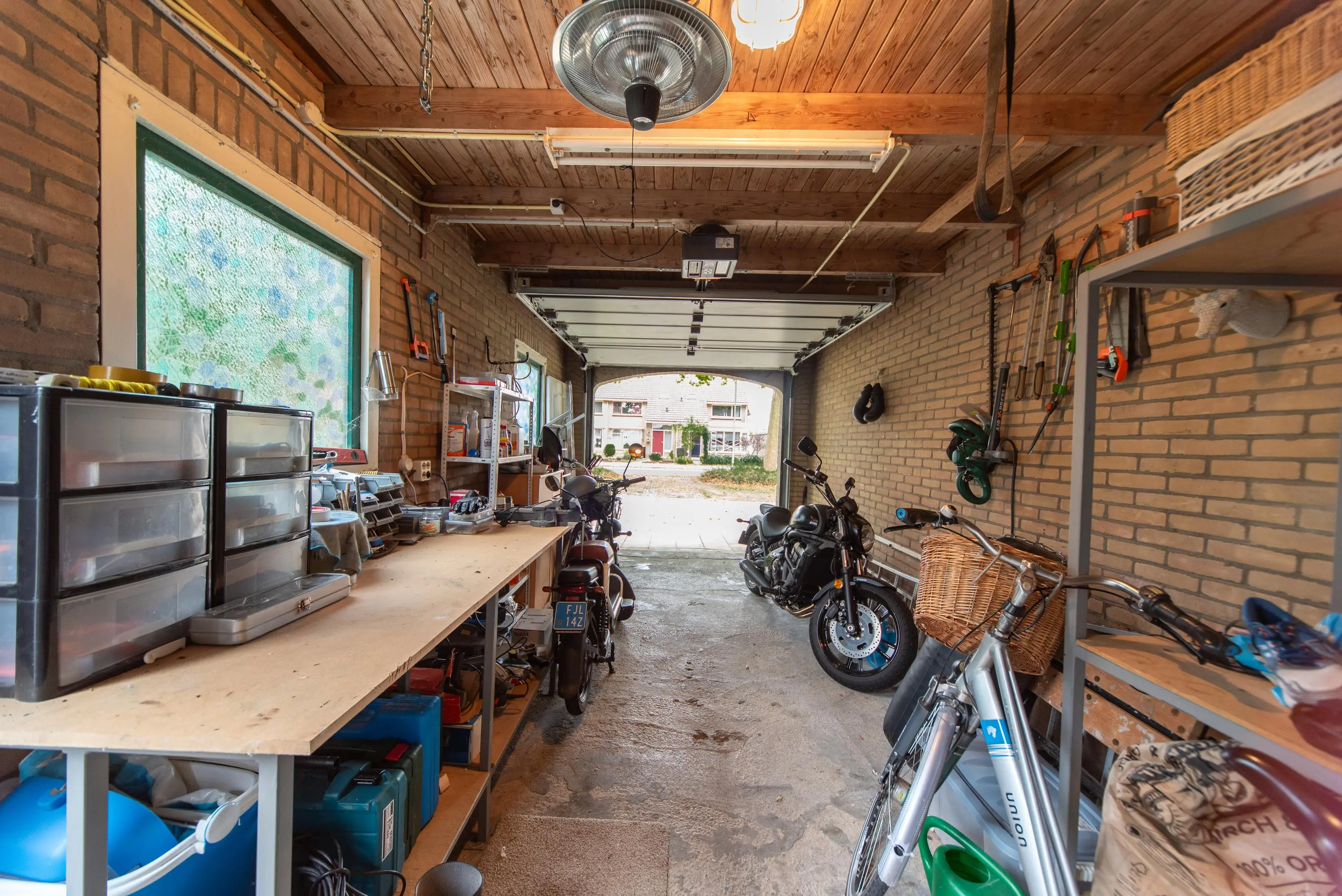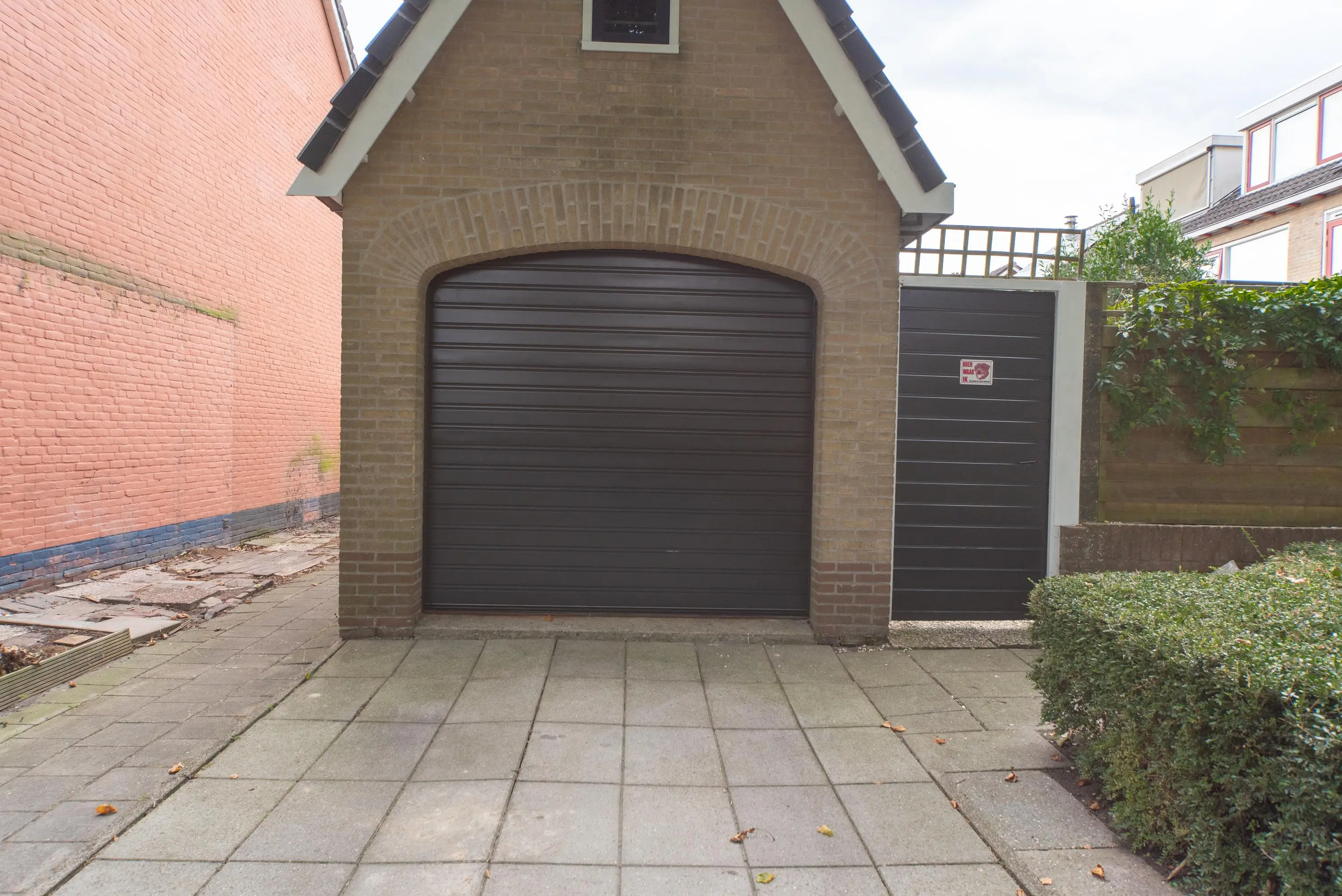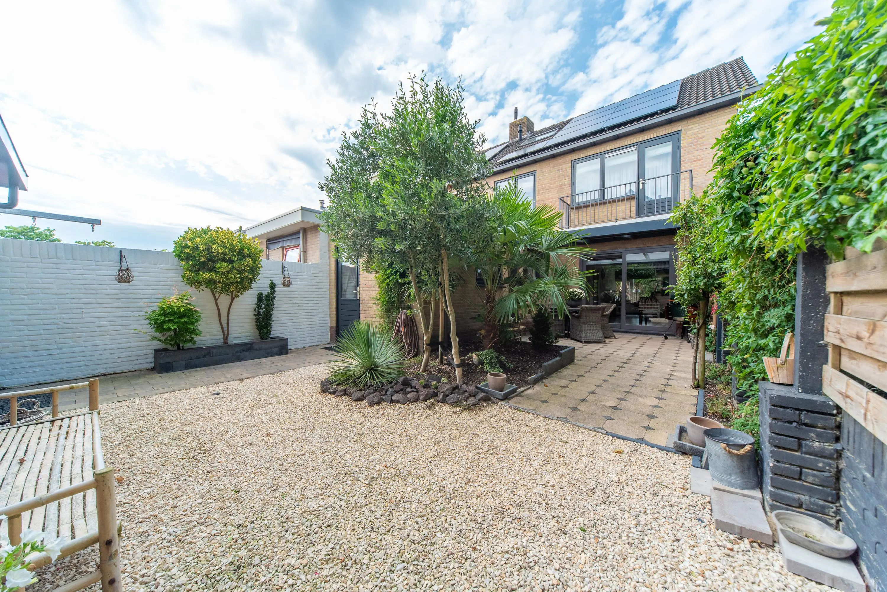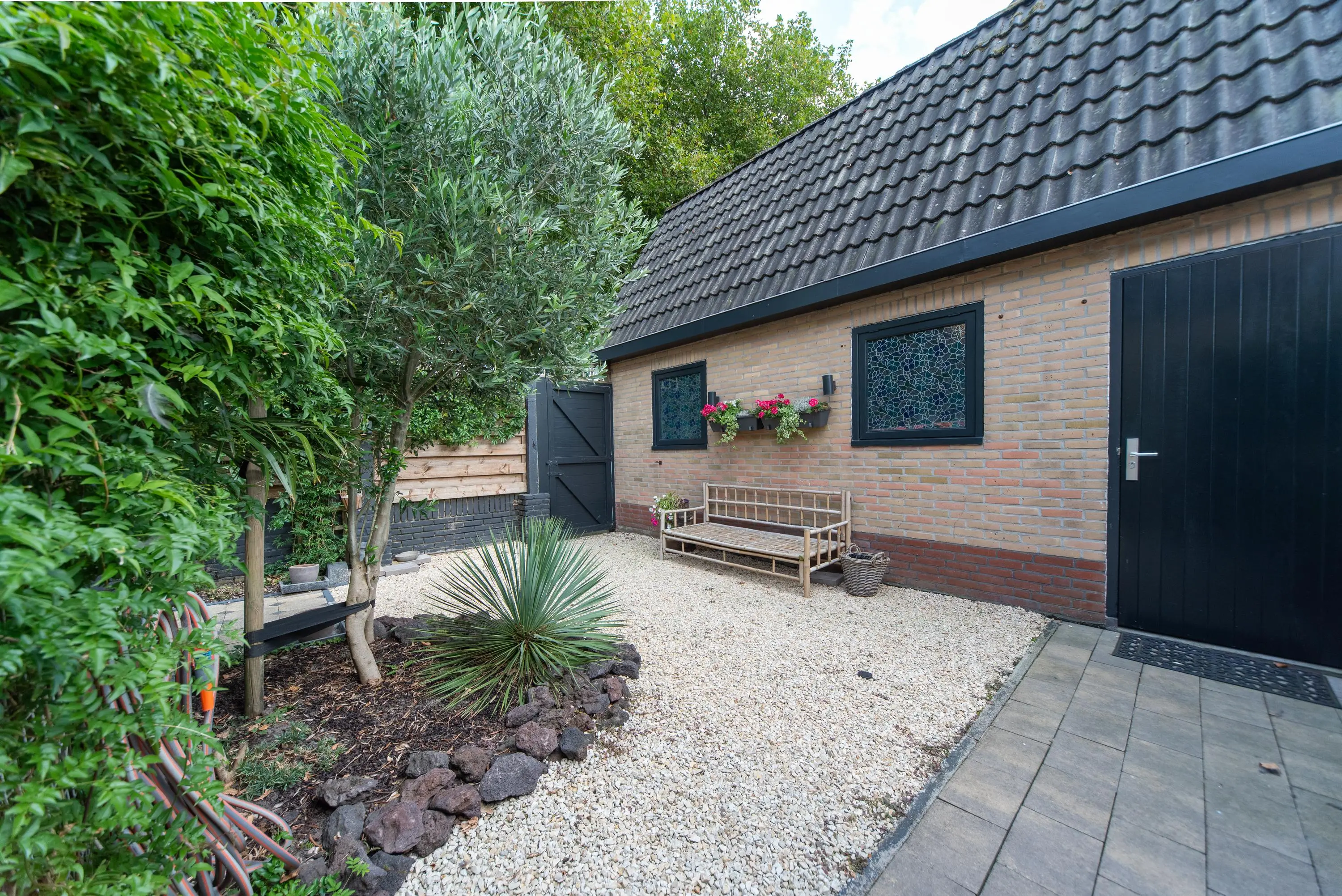 De op het zuiden gerichte tuin met achterom voelt als een oase van rust en kalmte door de gebruikte lichte kleuren, planten, fruit en palmbomen. We treffen hier ook de grote garage met vliering aan, waar u uw auto met gemak in kwijt kunt. Doordat de garage straatgericht is aan de oostzijde van de woning, kunt u uw auto ook op de inrit voor uw garage parkeren en blijft de garage vrij voor andere stalling/opbergmogelijkheden, of kunt u klusjes uitvoeren aan de werkbank die hierin achterblijft.