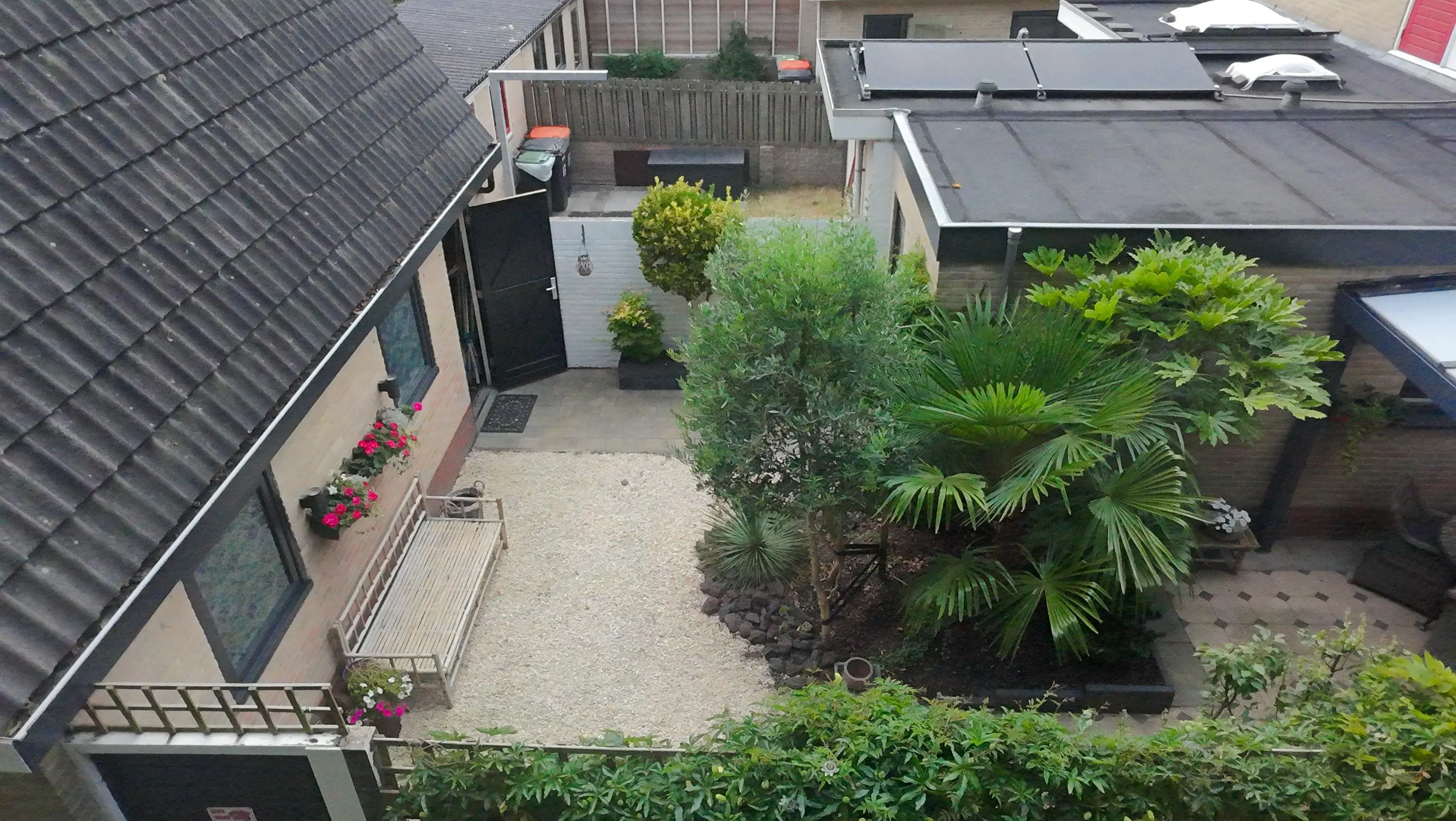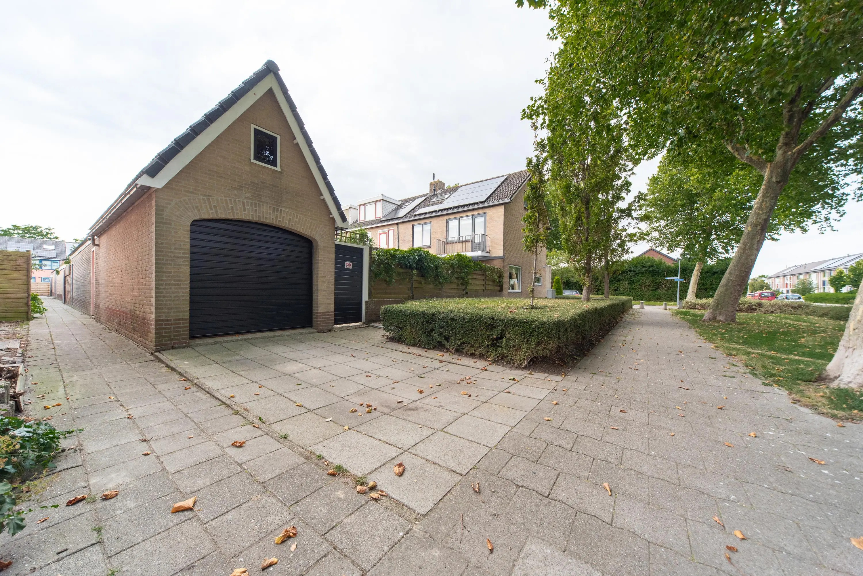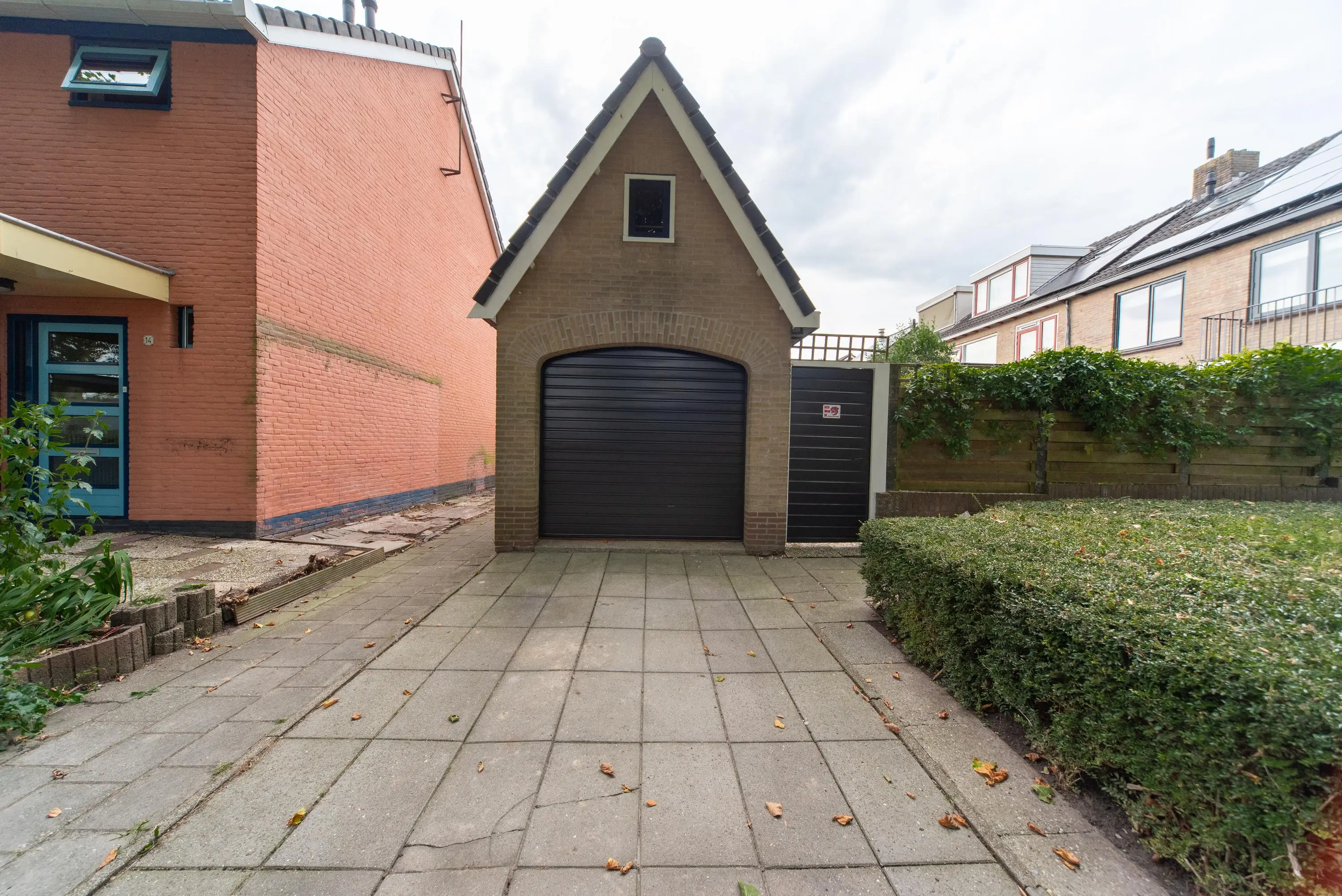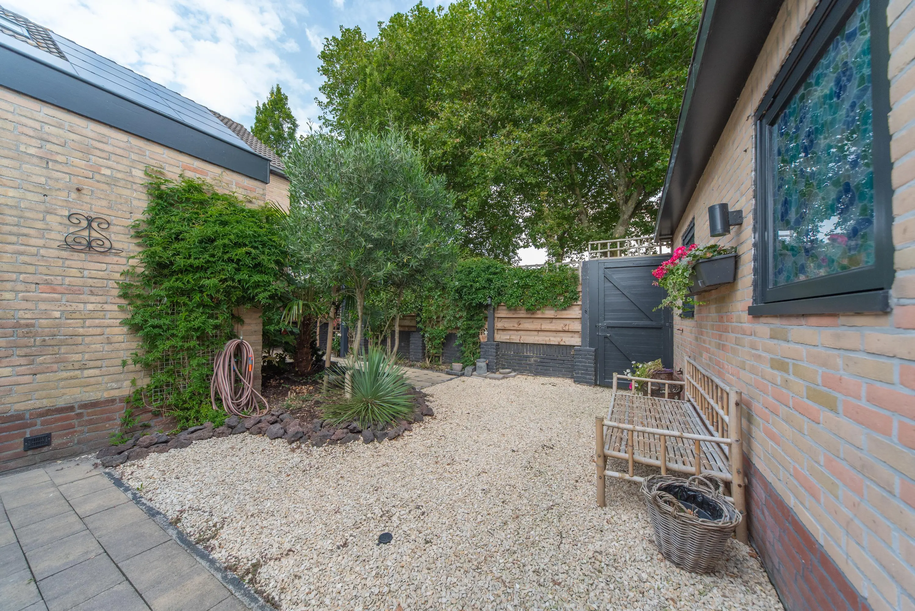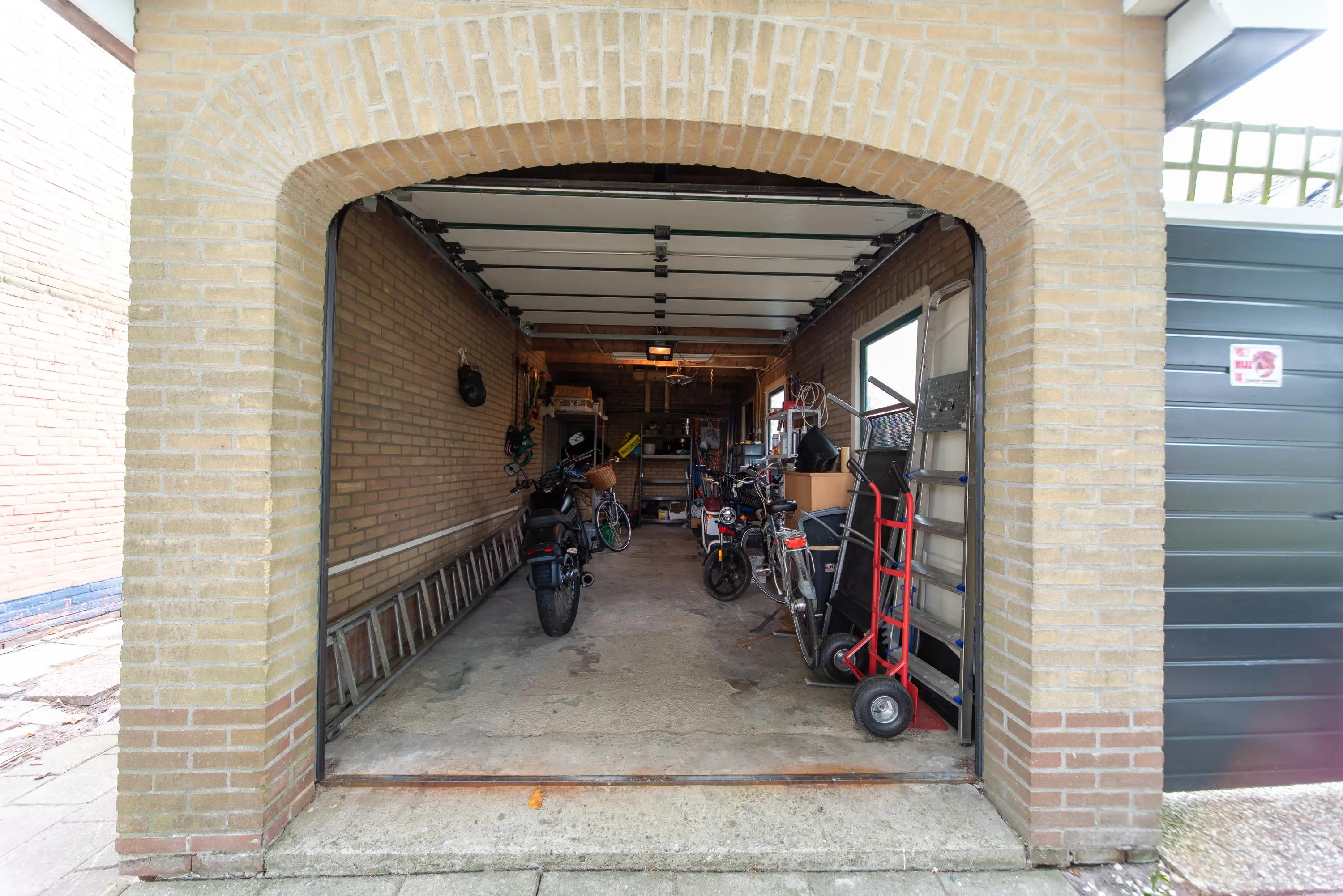 De op het zuiden gerichte tuin met achterom voelt als een oase van rust en kalmte door de gebruikte lichte kleuren, planten, fruit en palmbomen. We treffen hier ook de grote garage met vliering aan, waar u uw auto met gemak in kwijt kunt. Doordat de garage straatgericht is aan de oostzijde van de woning, kunt u uw auto ook op de inrit voor uw garage parkeren en blijft de garage vrij voor andere stalling/opbergmogelijkheden, of kunt u klusjes uitvoeren aan de werkbank die hierin achterblijft.