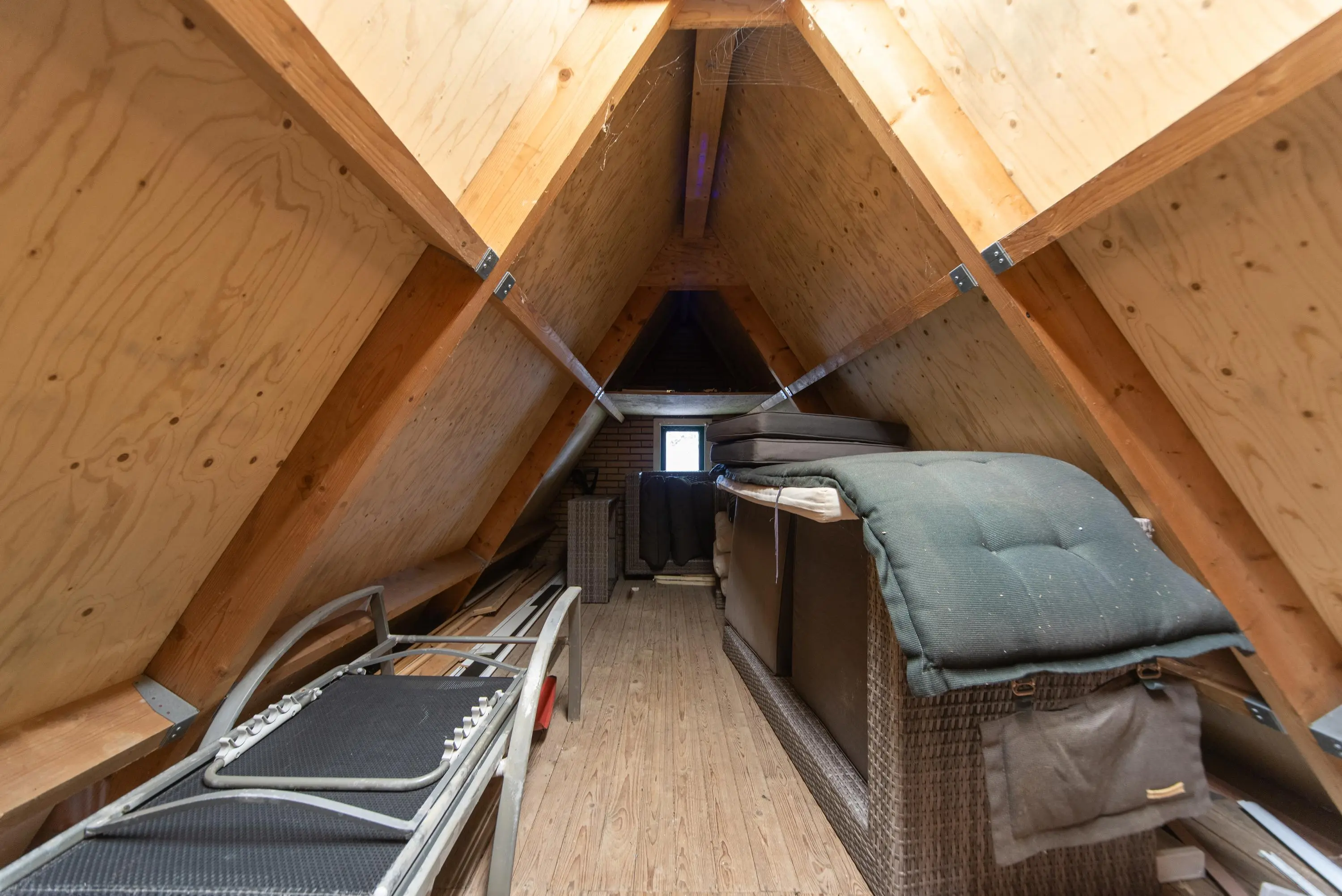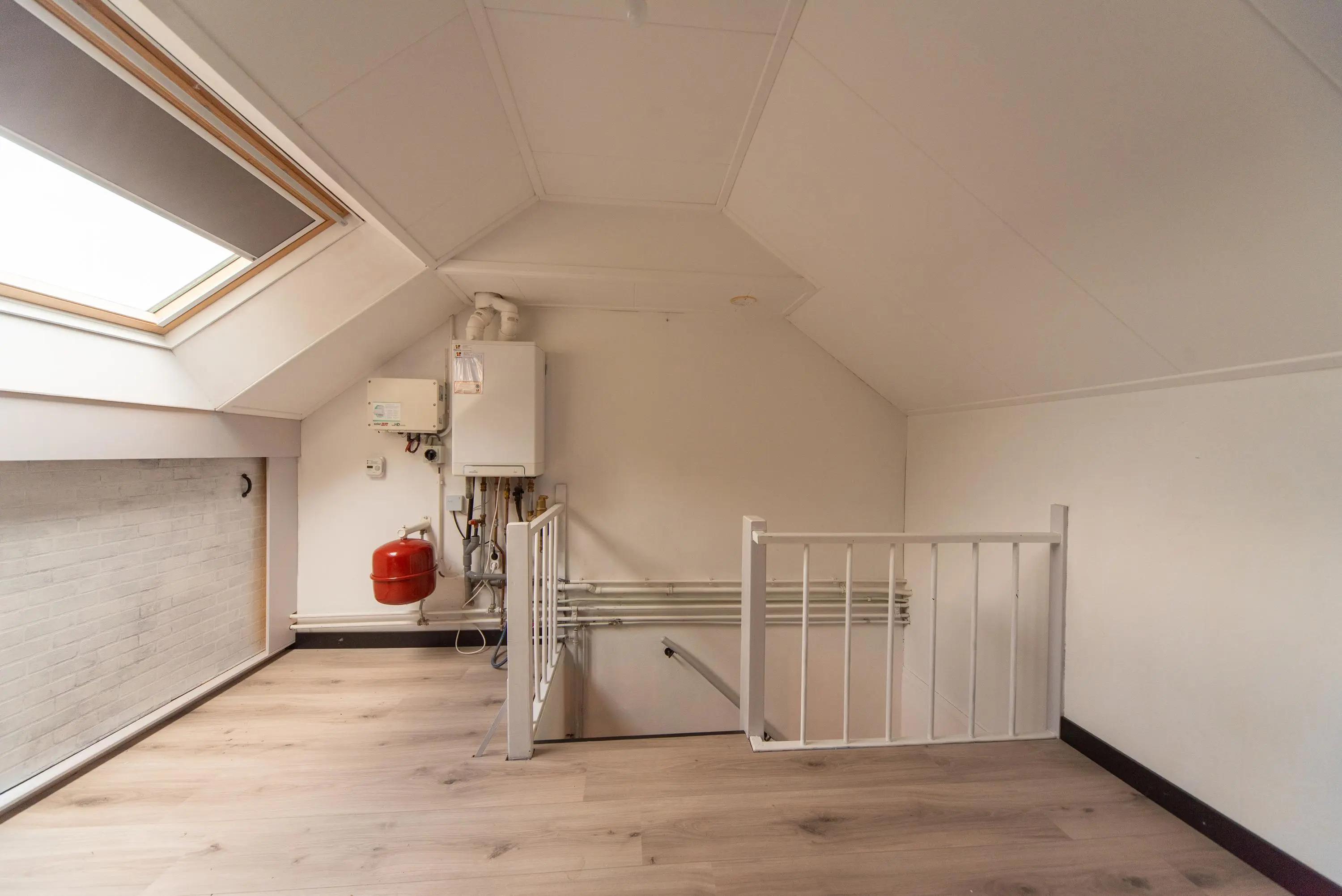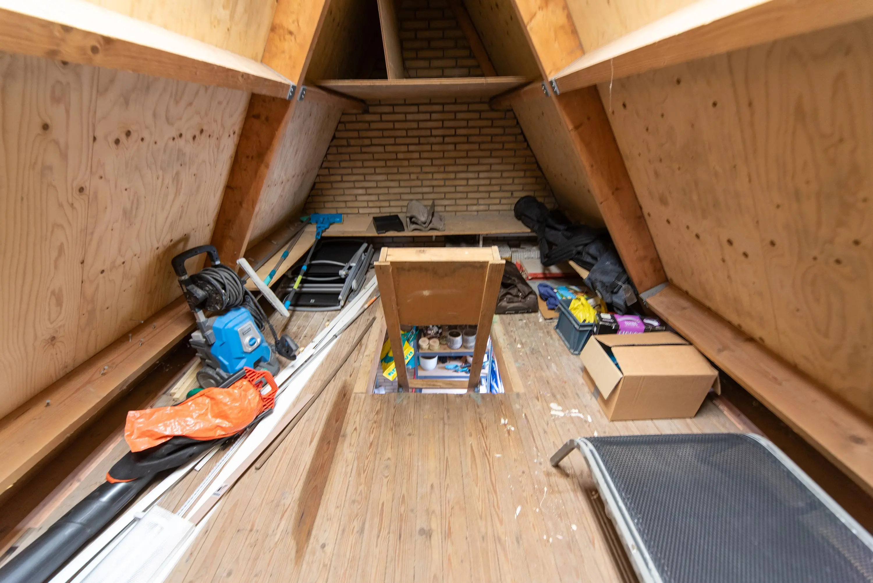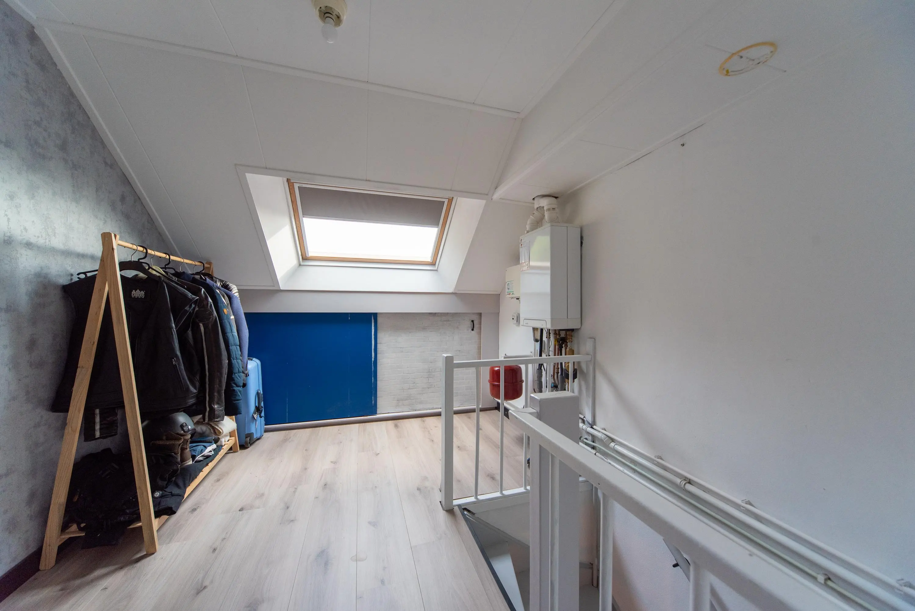 Als we de trap opgaan naar de 2e verdieping, komen we op de ruime voorzolder uit, waar u achter de knieschotten nog genoeg ruimte heeft om alle spulletjes die u weinig gebruikt uit het zicht op te ruimen.