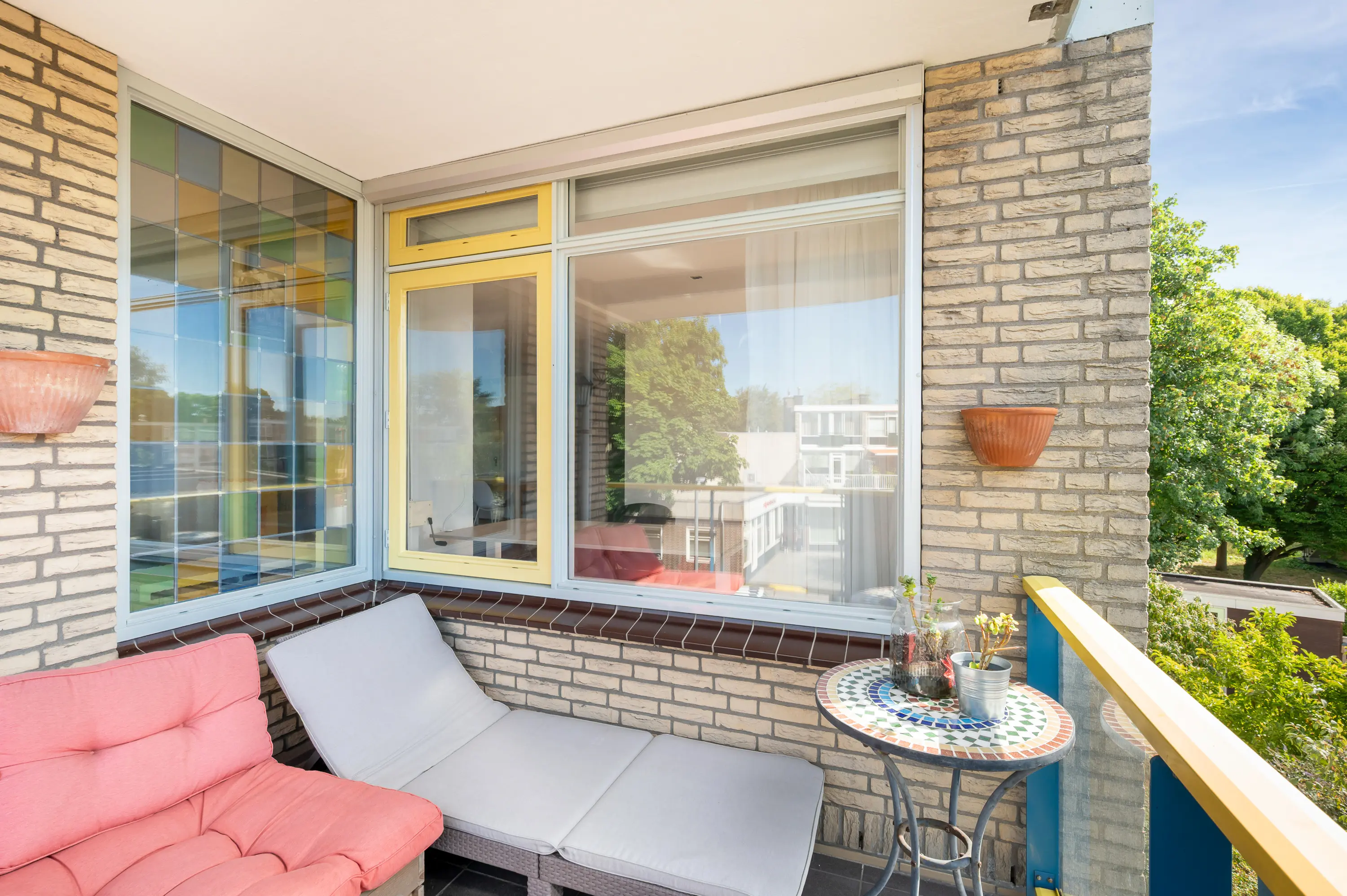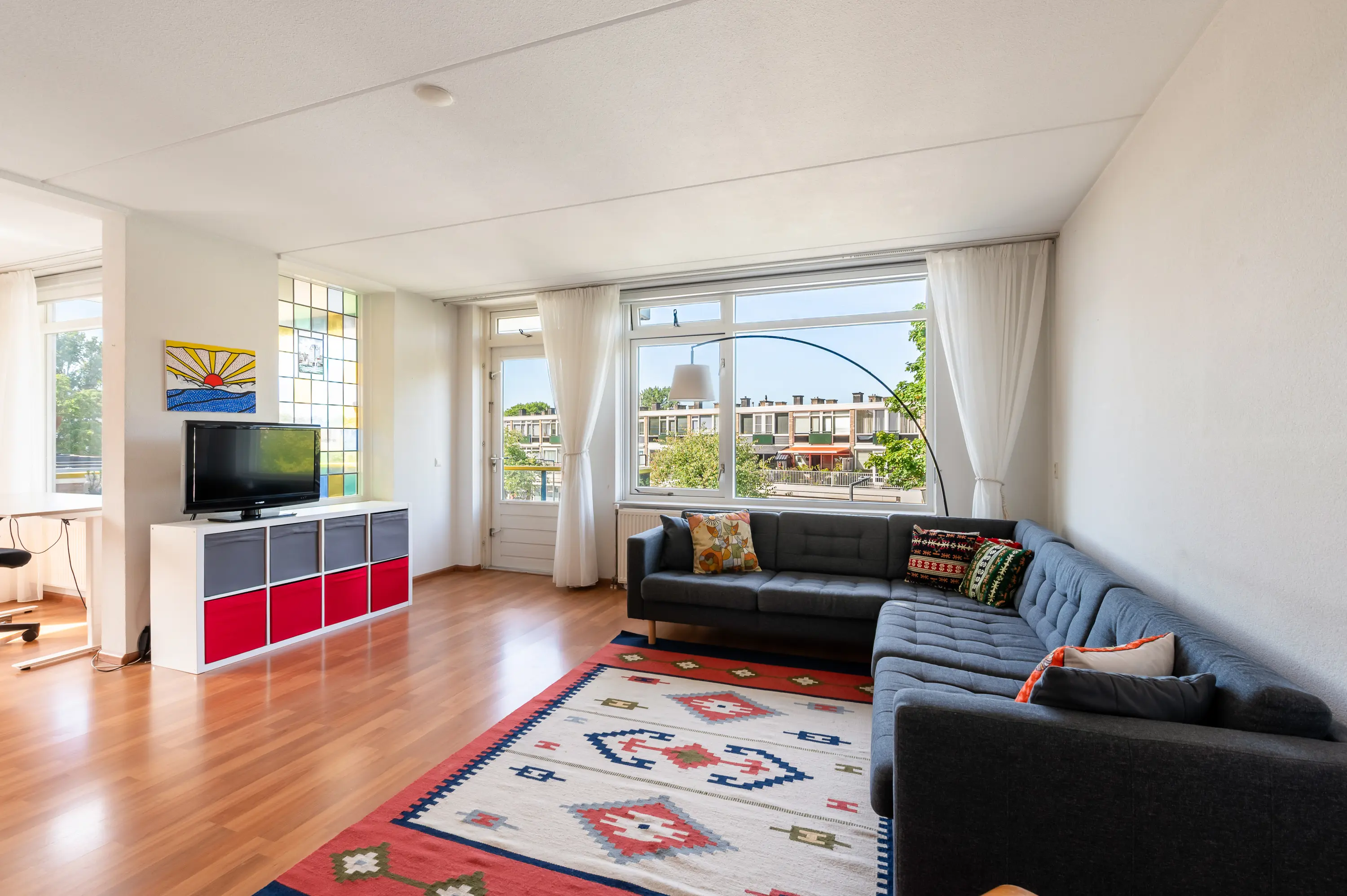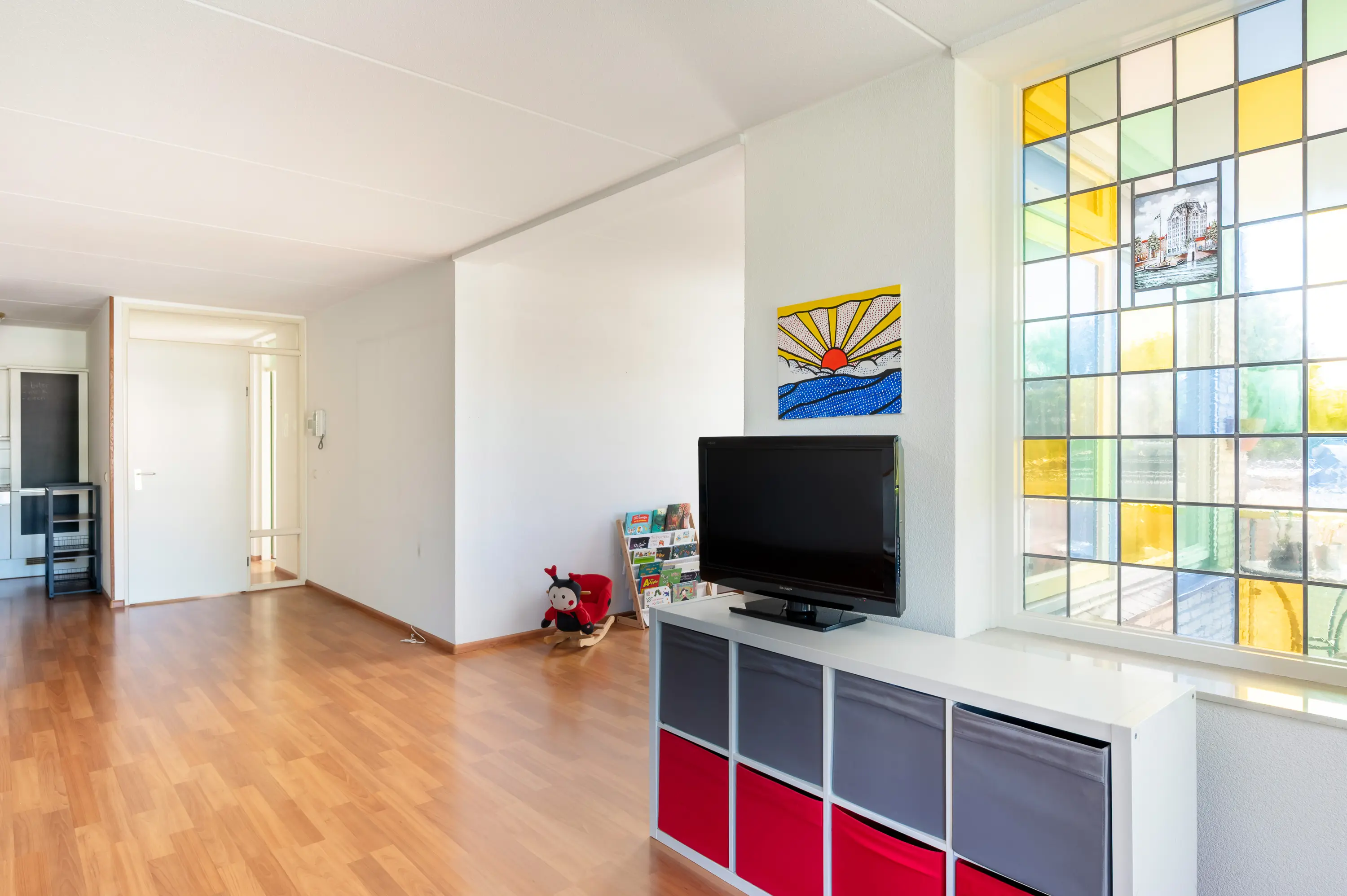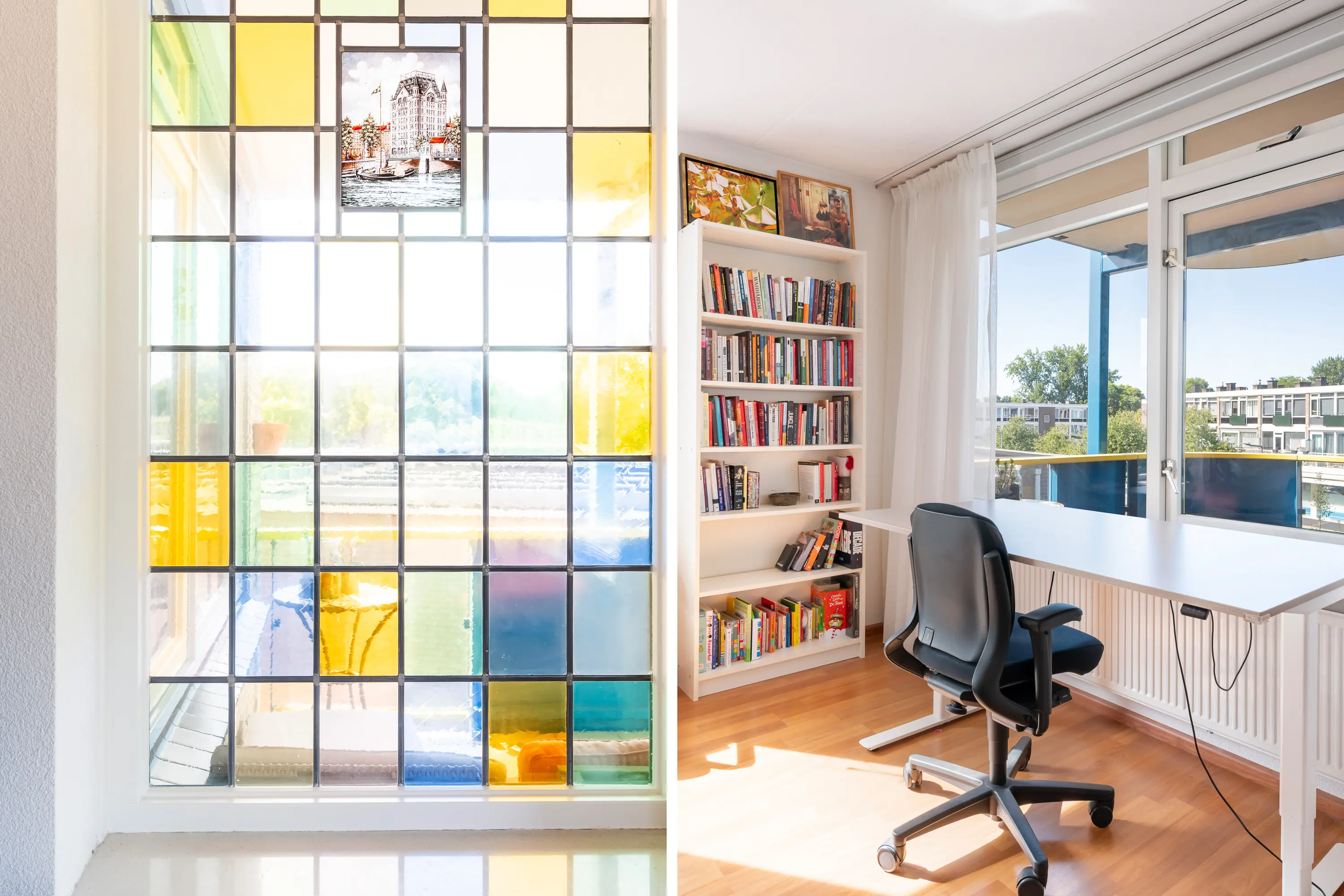 Je bereikt het appartement via de galerij, waar de voordeur naast een aparte cv-kast ligt. De entreehal biedt toegang tot alle vertrekken, waaronder de bijzonder ruime woonkamer. Deze doorzonkamer springt direct in het oog dankzij de prettige lichtinval, het kleurrijke glas-in-loodraam en de speelse indeling met ruimte voor zowel een royale zithoek als een grote eettafel. Via de woonkamer stap je zo het zonnige balkon op – een fijne plek om te ontspannen tot in de avondzon.