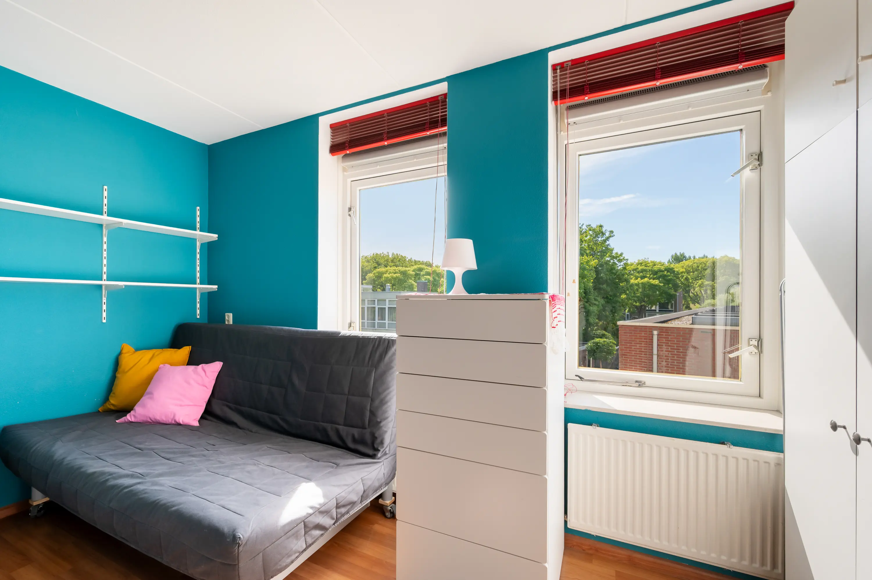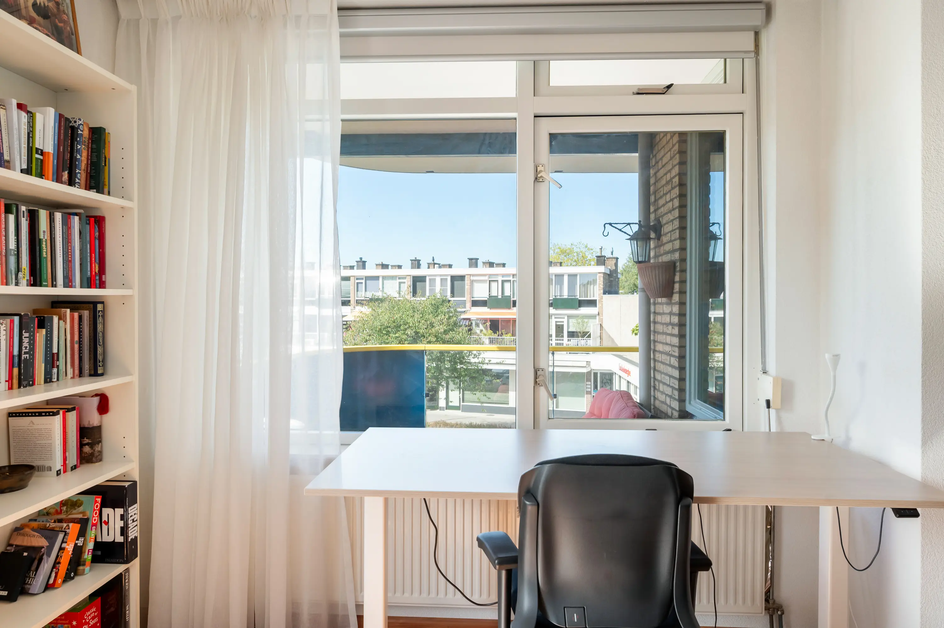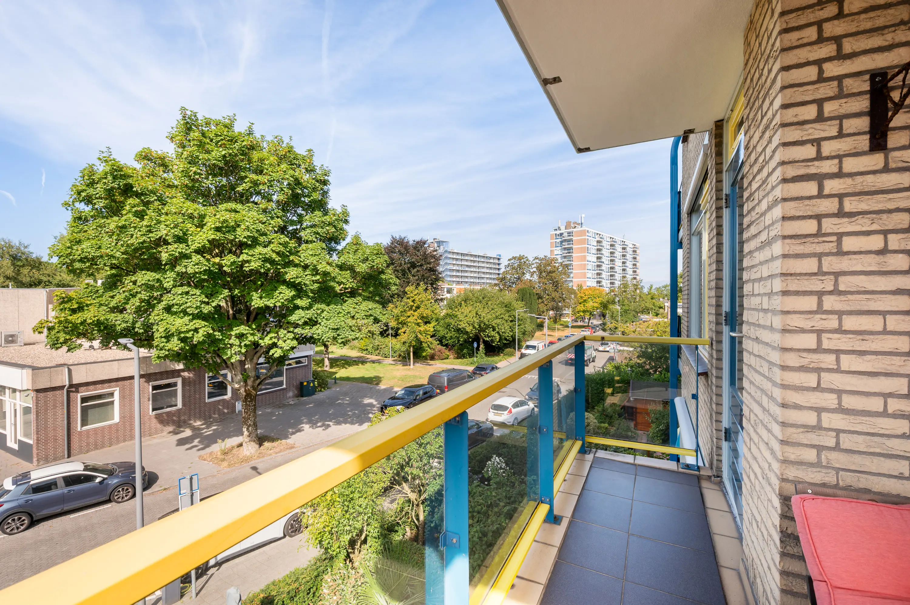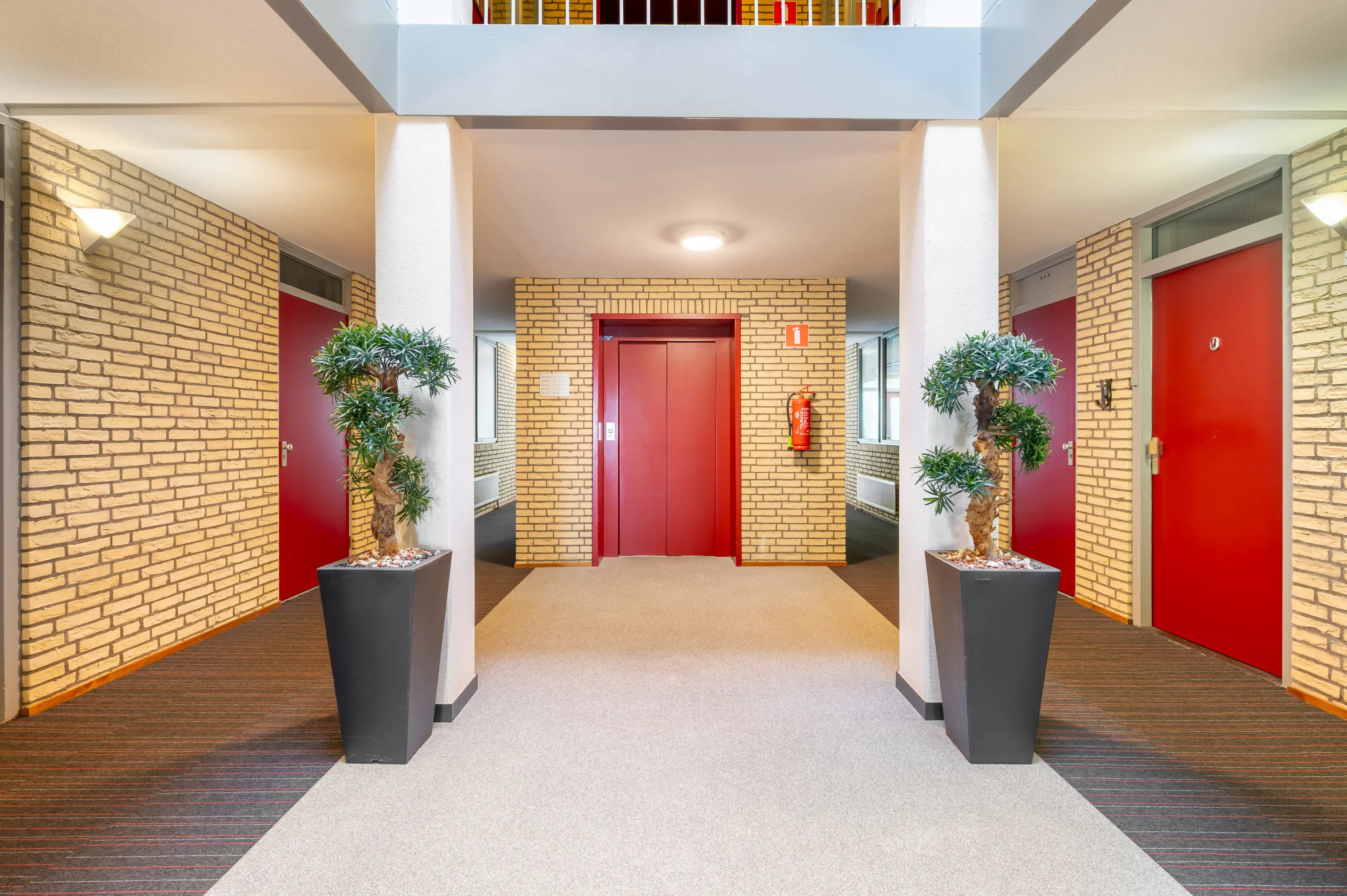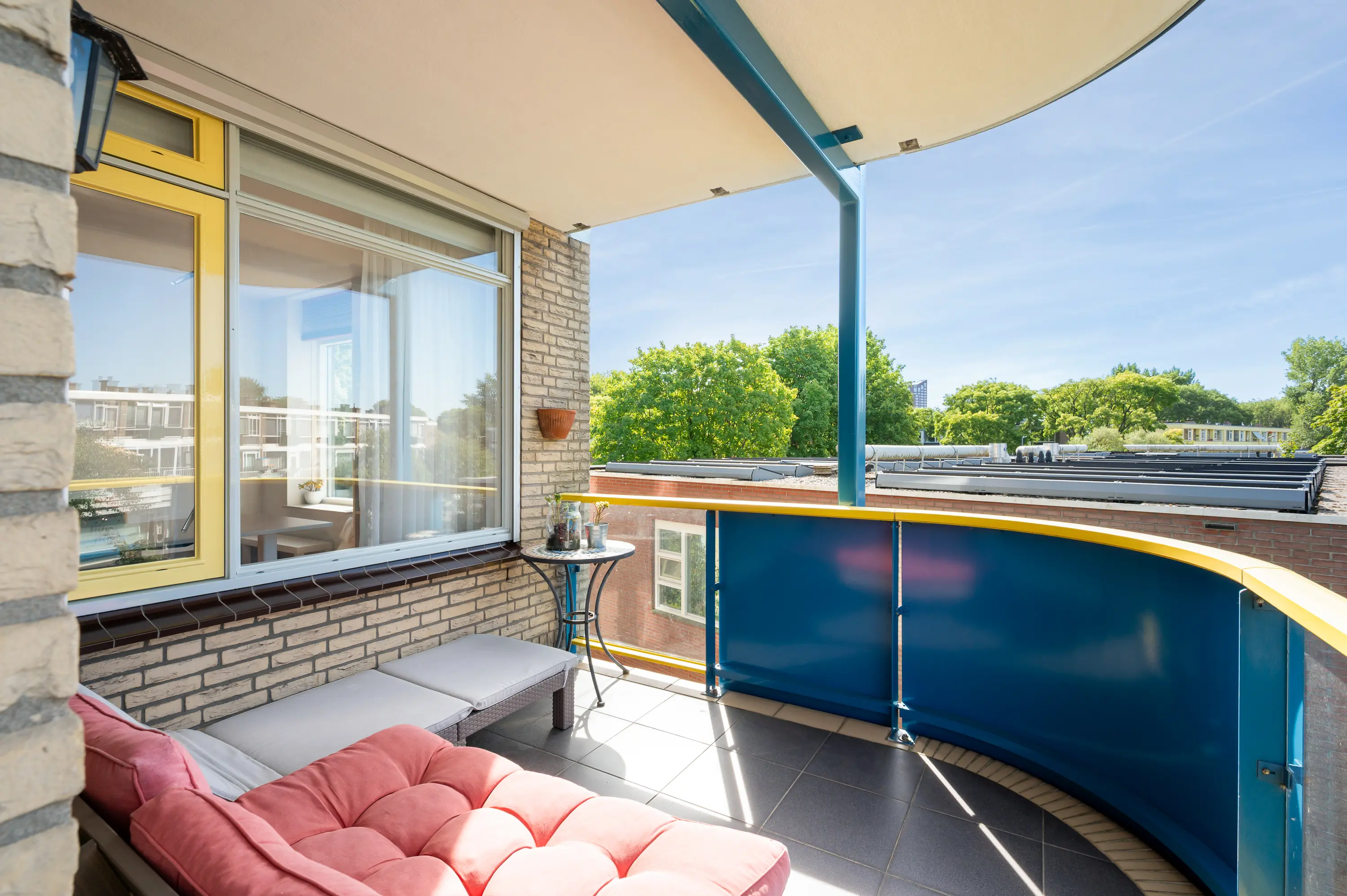 Je bereikt het appartement via de galerij, waar de voordeur naast een aparte cv-kast ligt. De entreehal biedt toegang tot alle vertrekken, waaronder de bijzonder ruime woonkamer. Deze doorzonkamer springt direct in het oog dankzij de prettige lichtinval, het kleurrijke glas-in-loodraam en de speelse indeling met ruimte voor zowel een royale zithoek als een grote eettafel. Via de woonkamer stap je zo het zonnige balkon op – een fijne plek om te ontspannen tot in de avondzon.