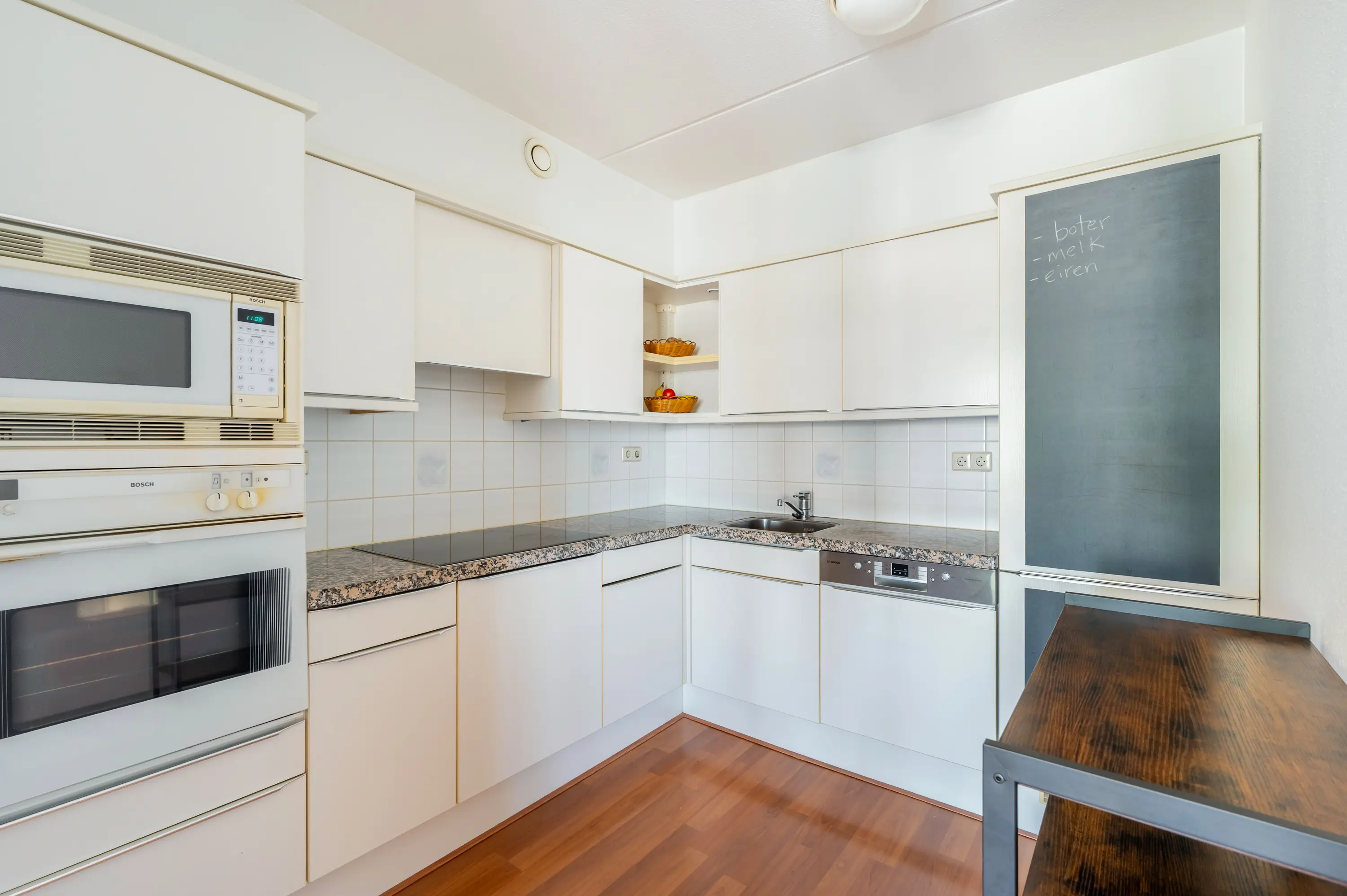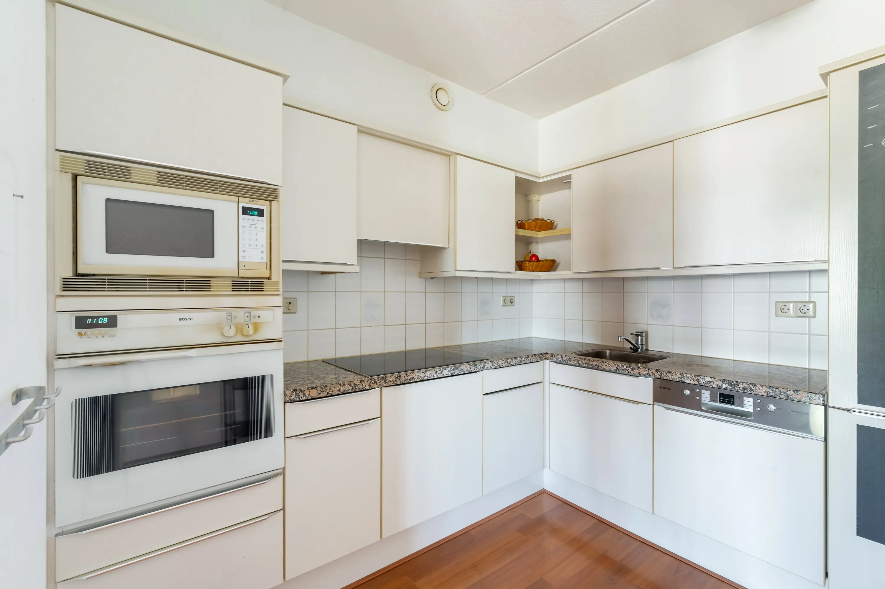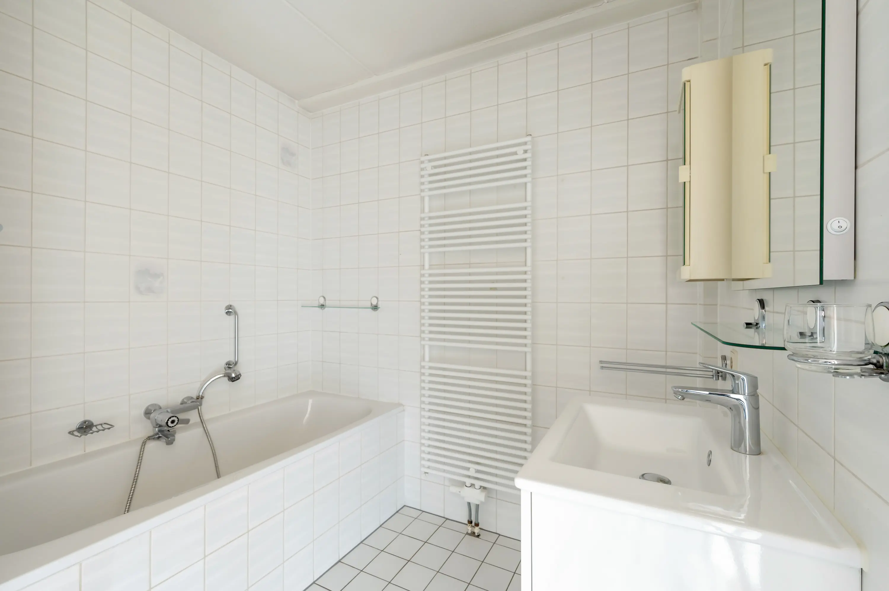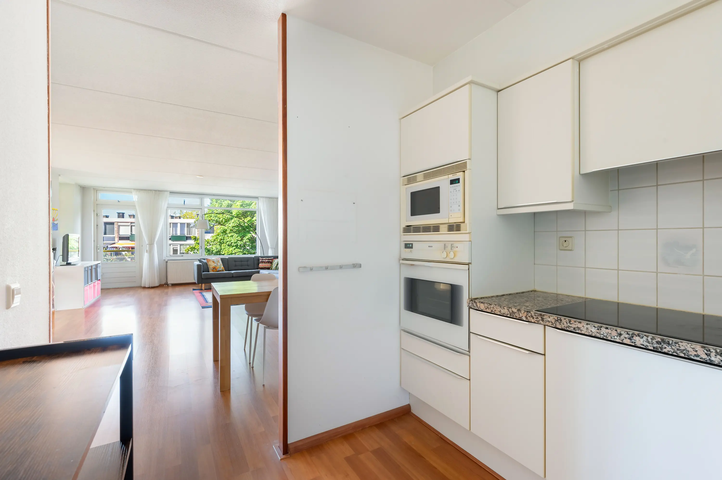 De halfopen keuken is praktisch opgezet, met meer dan genoeg kastruimte en diverse inbouwapparatuur. Aan de achterzijde liggen twee lichte en vrijwel identieke slaapkamers, elk ruim genoeg voor een bed, kast en bureau. Ideaal als master bedroom, logeerkamer of werkruimte. De badkamer is compleet uitgerust met ligbad, aparte douche, wastafelmeubel en wasmachineaansluiting. Het separate toilet met fonteintje vind je in de hal.