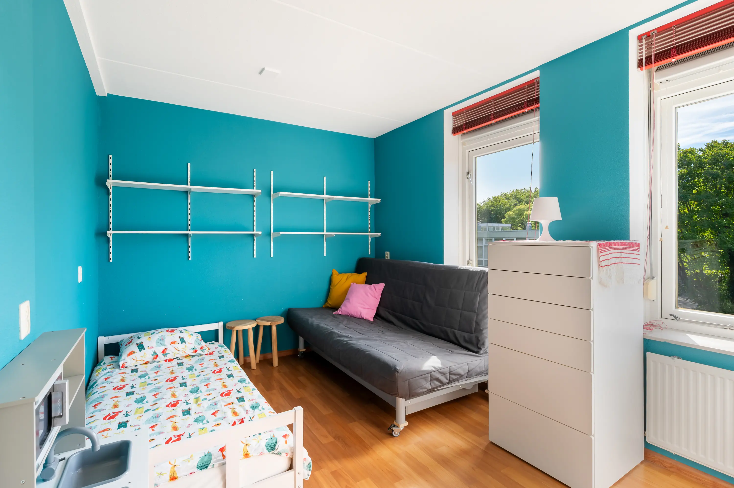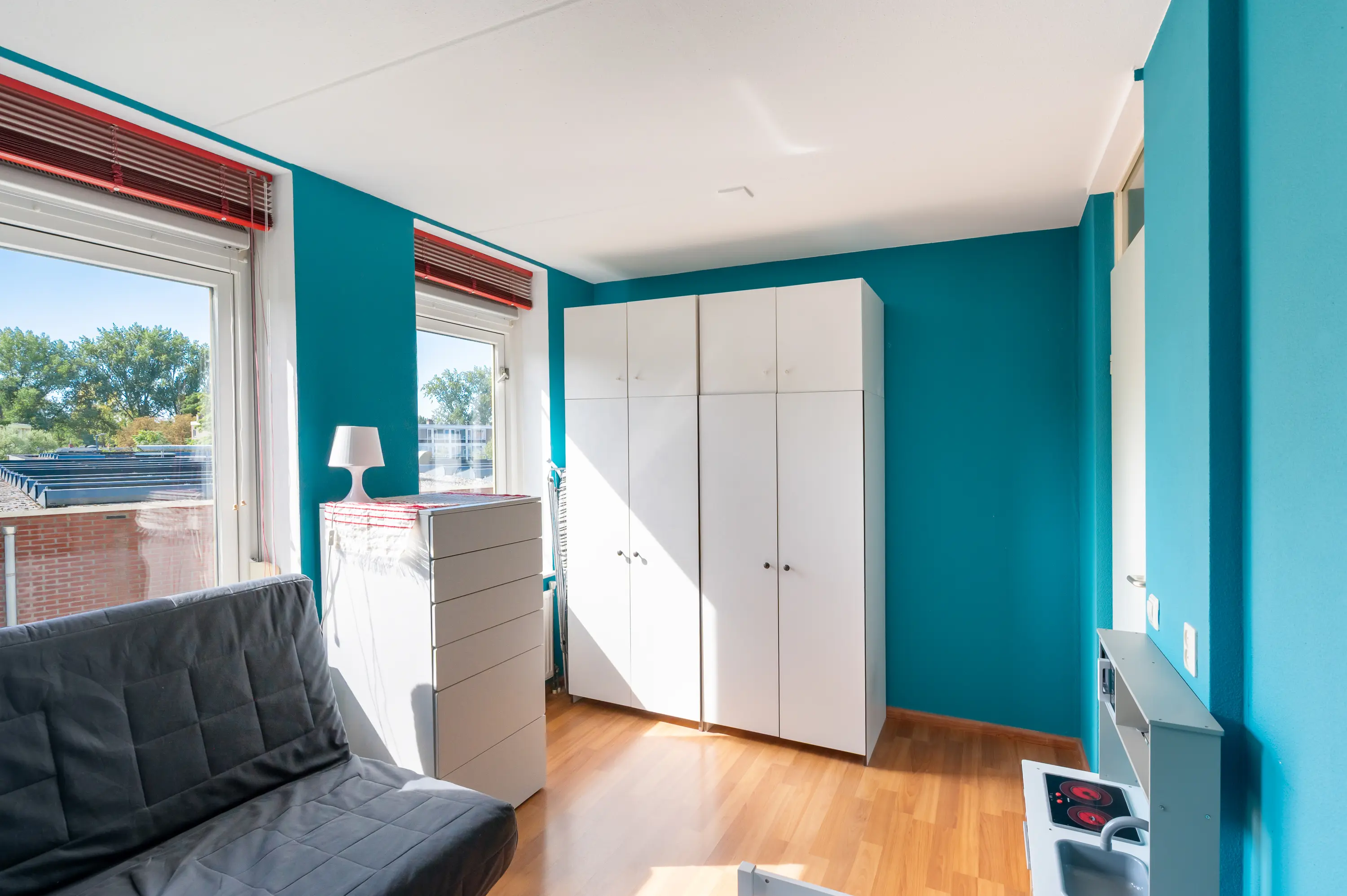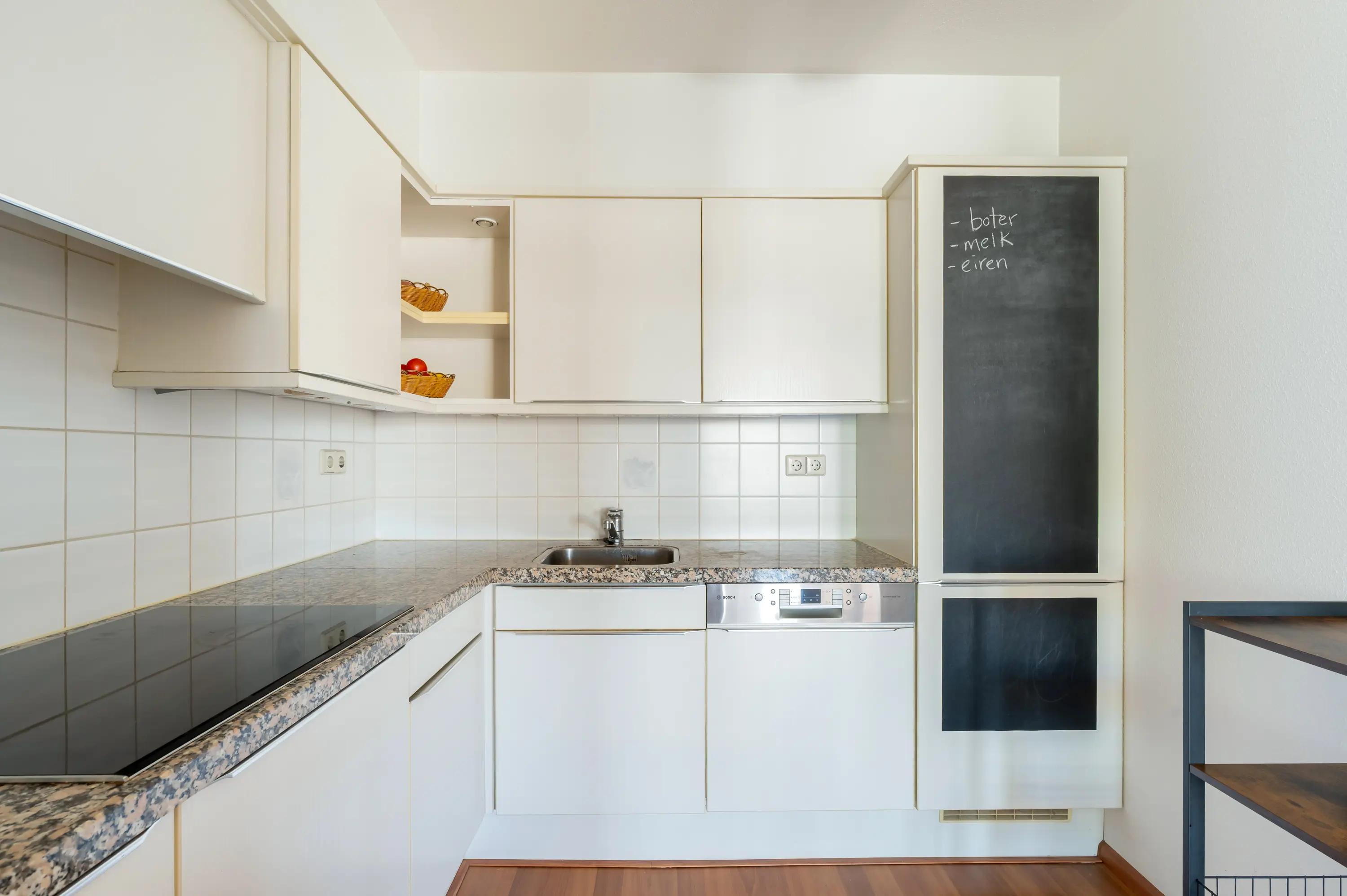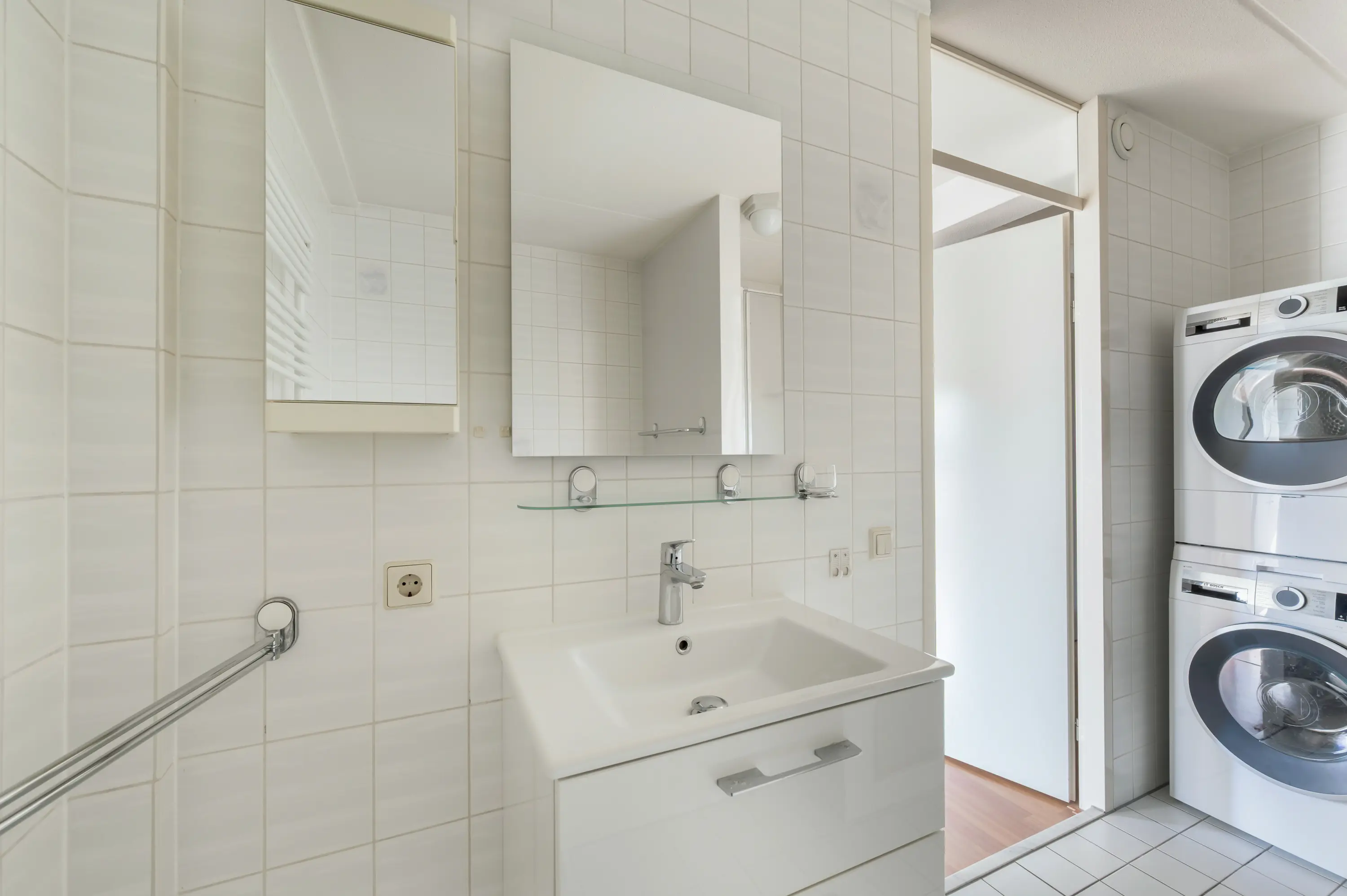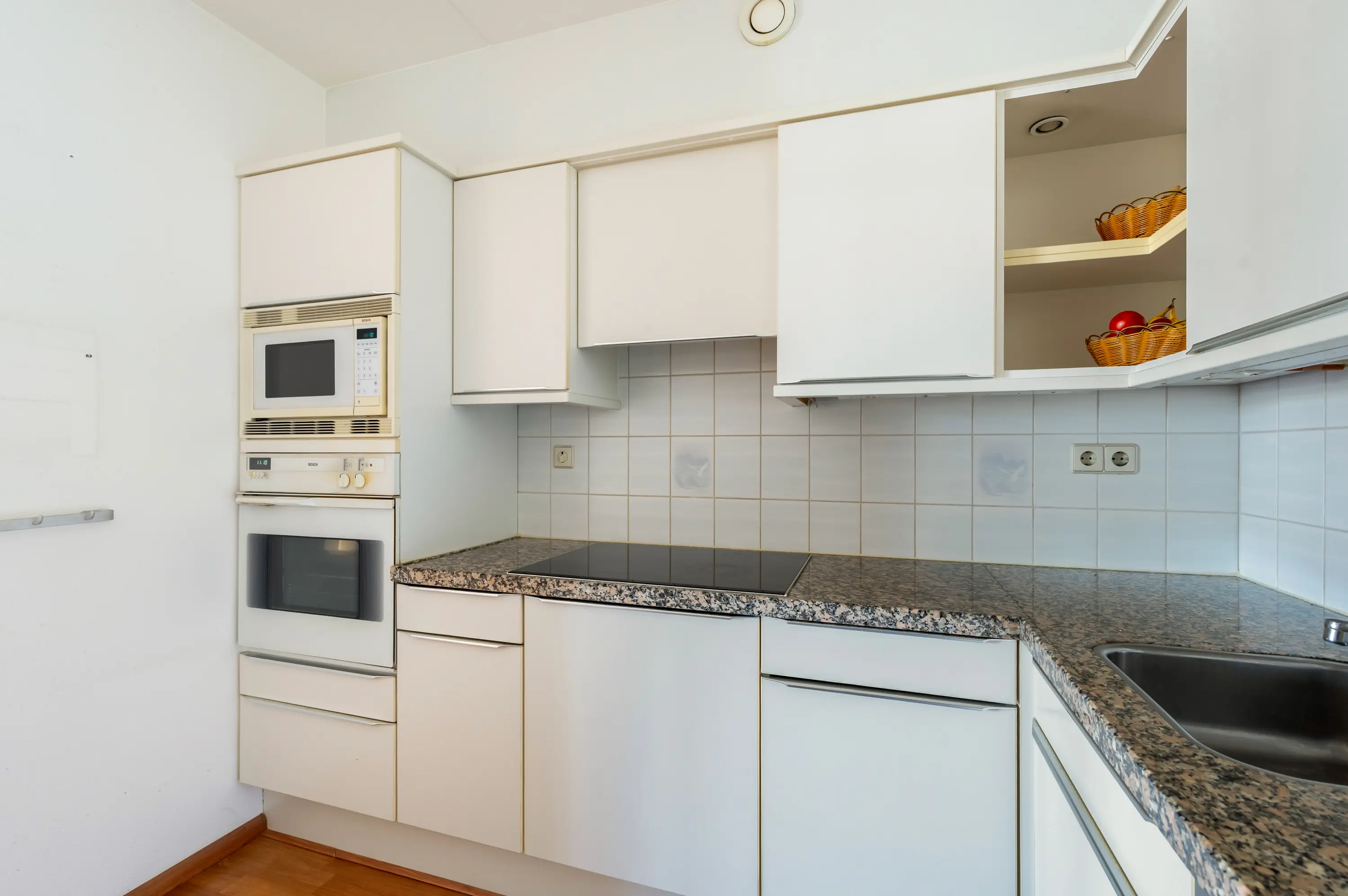 De halfopen keuken is praktisch opgezet, met meer dan genoeg kastruimte en diverse inbouwapparatuur. Aan de achterzijde liggen twee lichte en vrijwel identieke slaapkamers, elk ruim genoeg voor een bed, kast en bureau. Ideaal als master bedroom, logeerkamer of werkruimte. De badkamer is compleet uitgerust met ligbad, aparte douche, wastafelmeubel en wasmachineaansluiting. Het separate toilet met fonteintje vind je in de hal.