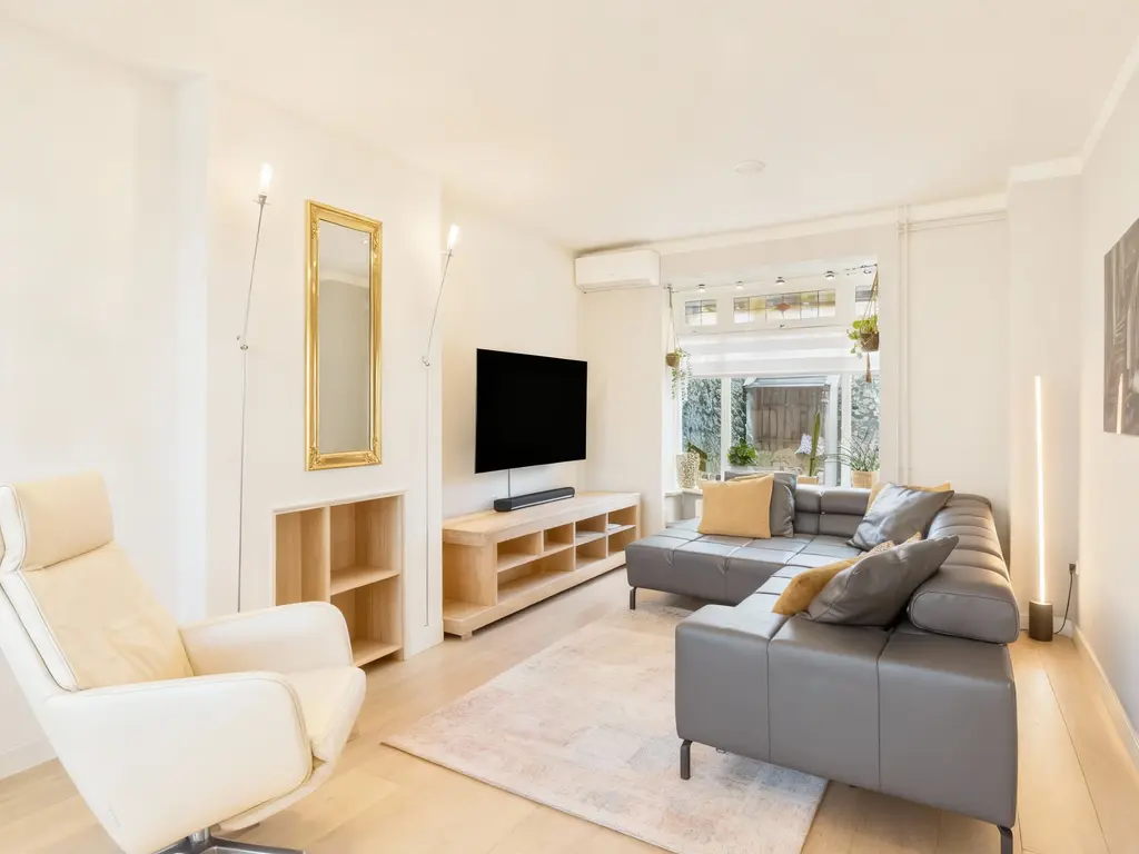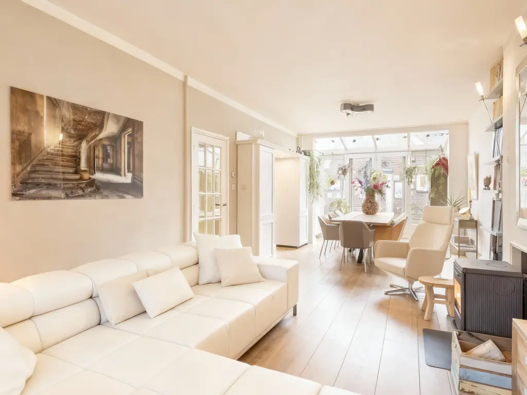 De hoofdwoning heeft een lichte woonkamer met een authentieke erker en glas-in-loodramen. Aan de achterzijde is de woning uitgebouwd met een glazen dak en houten kozijnen, wat zorgt voor veel licht en een natuurlijke verbinding met de tuin. De woonkamer is voorzien van een houtkachel en airconditioning. De moderne keuken is strak afgewerkt en uitgerust met inbouwapparatuur.