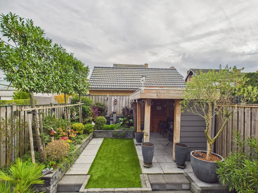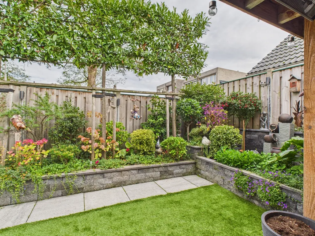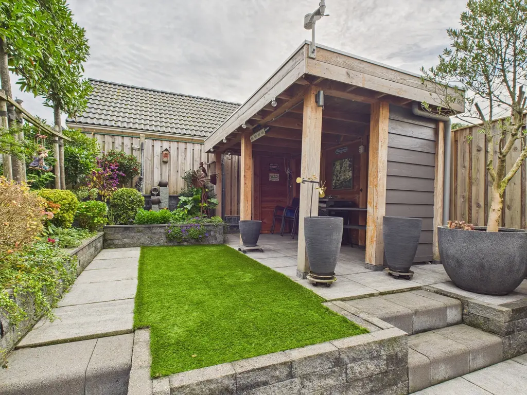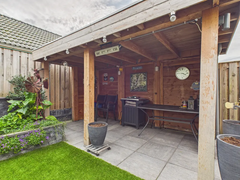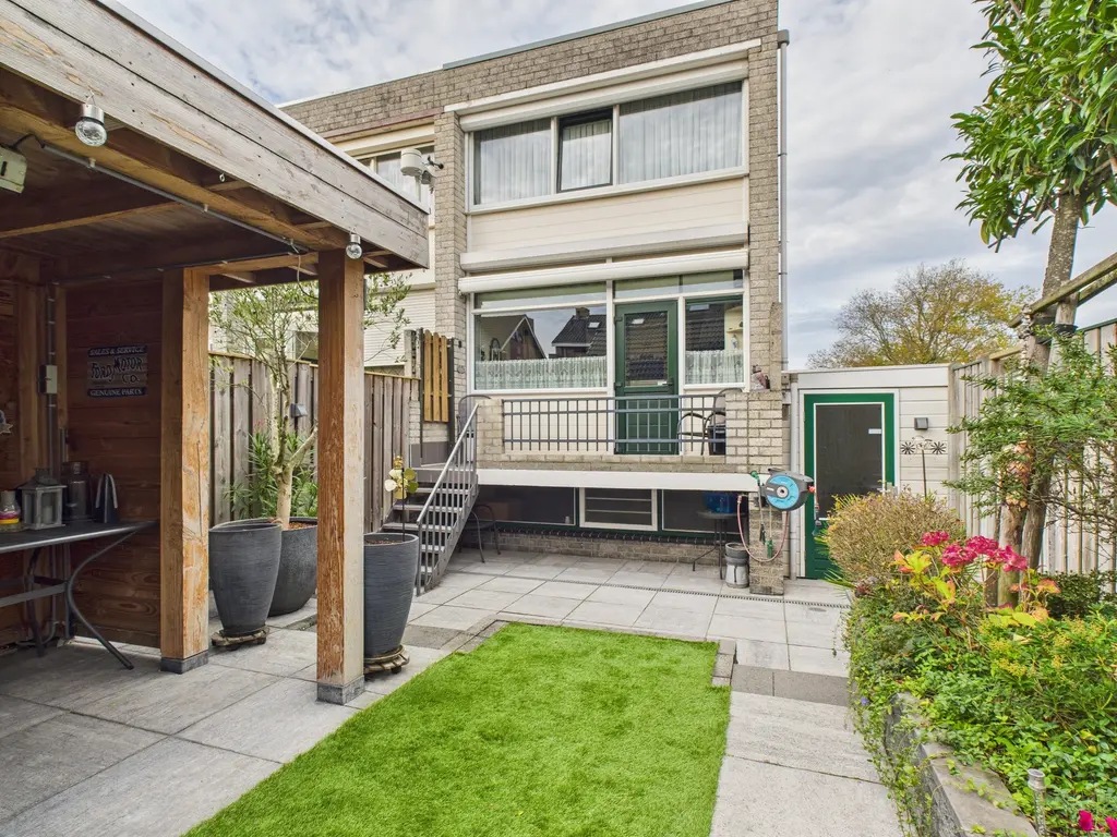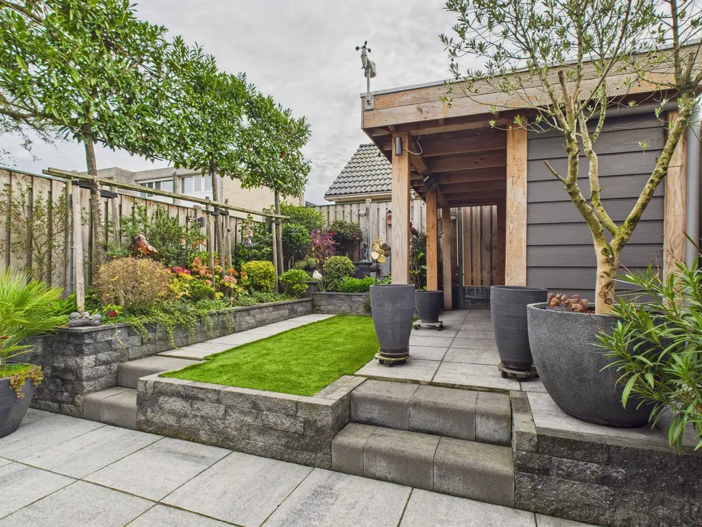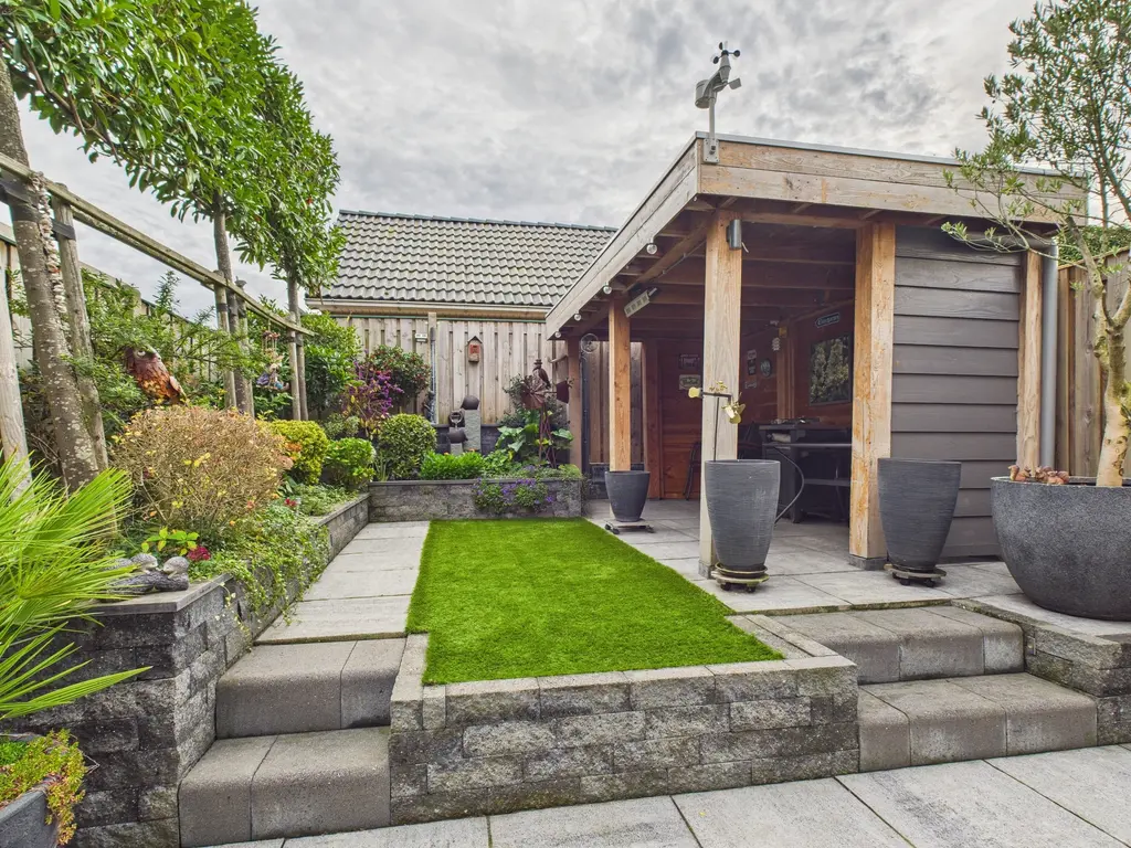 De achtertuin is onderhoudsvriendelijk ingericht met strak straatwerk, kunstgras en enkele borders met beplanting. Dankzij de ligging is hier altijd wel een fijn plekje in de zon te vinden. Liever wat hoger zitten? Het balkon biedt een heerlijke uitwijkmogelijkheid. Ook is er een prachtige overkapping om de schaduw op te kunnen zoeken of soms wat meer uit de wind te kunnen zitten. De tuin is ofwel via de achterpoort te bereiken of via een trap vanaf het balkon van de eerste verdieping.