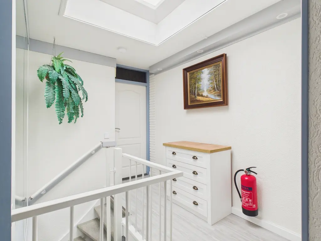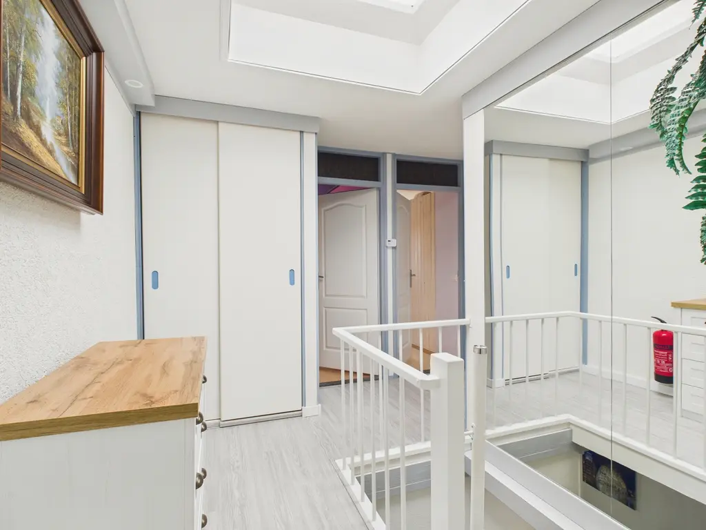 Op de overloop bevindt zich een lichtkoepel en twee handige inbouwkasten, waarvan één met de opstelplaats van de Cv-ketel. Er bevinden zich twee slaapkamers aan de voorzijde, beide met een nette laminaatvloer. De ruime slaapkamer aan de achterzijde biedt volop ruimte voor een 2-persoonsbed en kast. De badkamer is compleet uitgerust met een inloopdouche, toilet, wastafelmeubel en designradiator. Een lichtkoepel én een raam zorgen voor aangenaam daglicht.