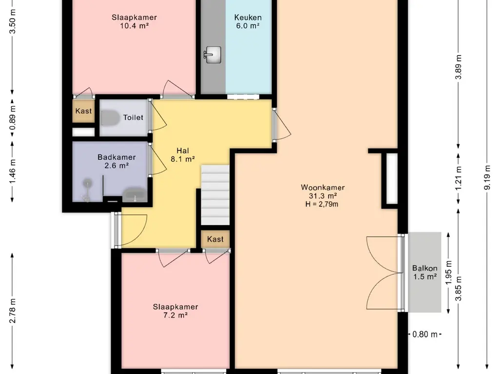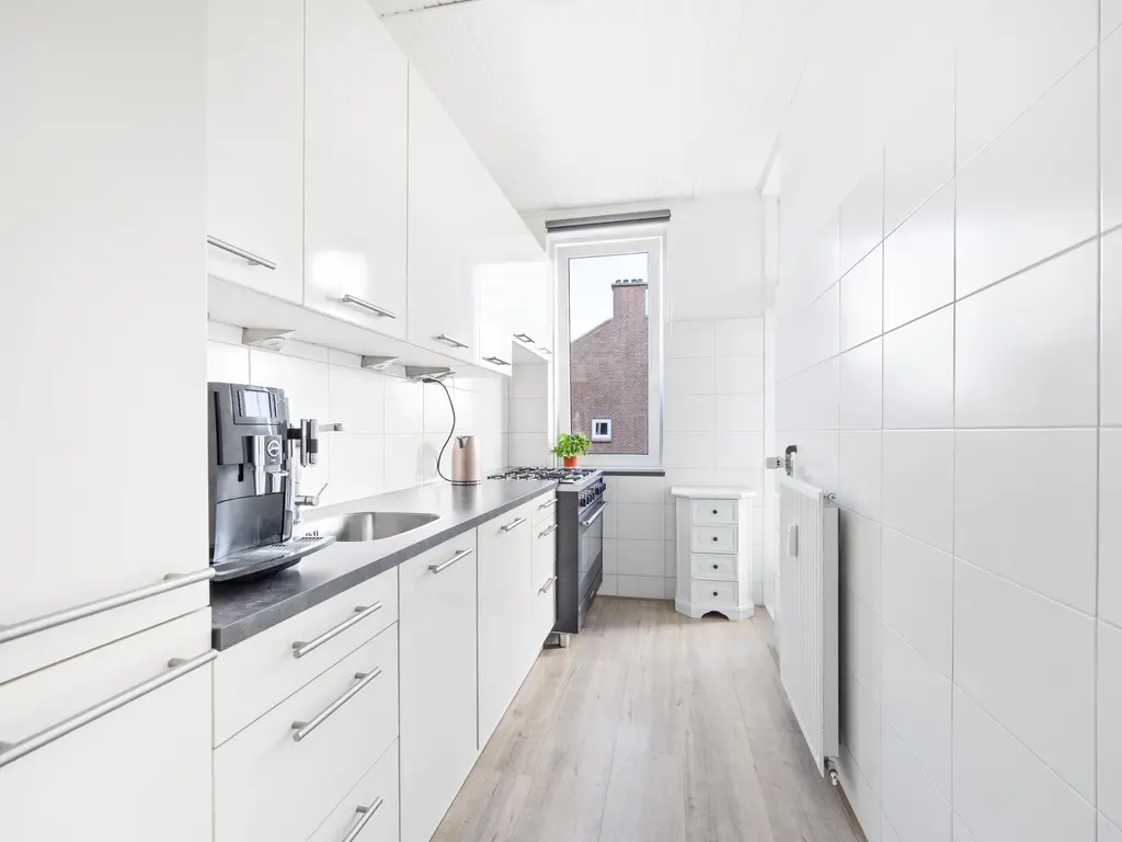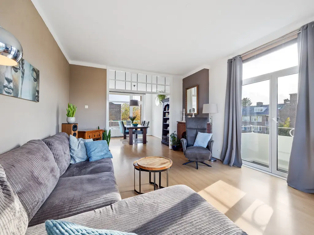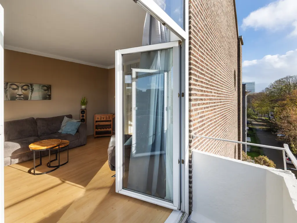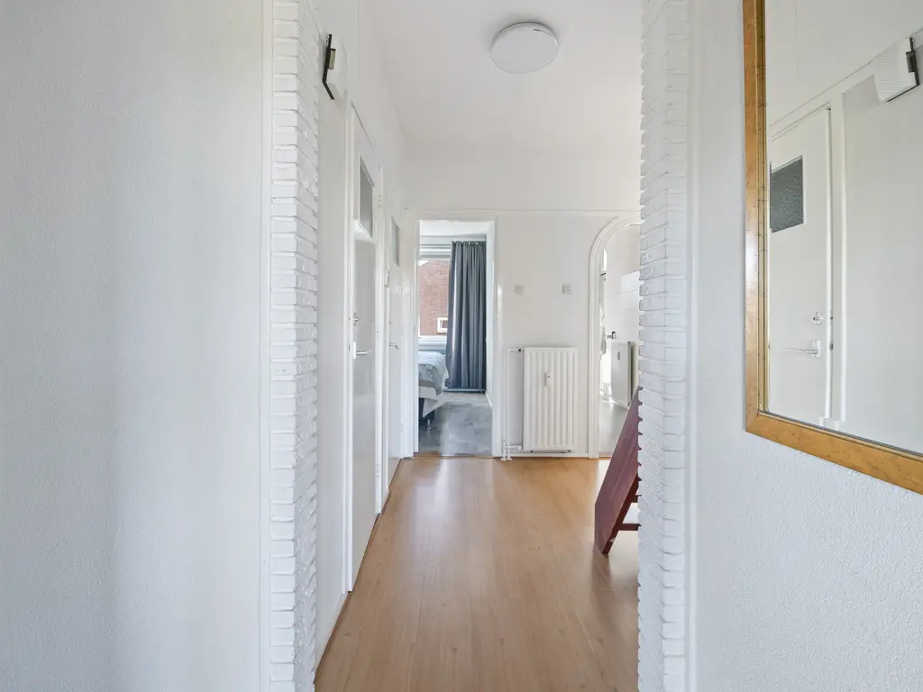 De ruime L-vormige hal (6m²) geeft toegang tot de verschillende vertrekken, waaronder een toilet en de tussengelegen badkamer, uitgerust met een douchecabine, wastafel met spiegel, wand meubel en radiator. De woon-/eetkamer is door de voormalige ‘en suite’ indeling met een oppervlakte van 31m² royaal. Plafondhoogte bedraagt 2.79 meter. In de zijgevel bevindt zich een 'patrijsraam’. Het balkon (met balkonkast!) aan de achterzijde ligt op het zuidoosten, het balkon aan de zijgevel op het zuidwesten. Mede door de vele raampartijen en hoogte baadt deze ruimte in het licht. De gesloten keuken (6m²) beschikt over een zes pits gasfornuis met elektrische oven, een inbouw koel-/vriescombi en vaatmachine. Ook vanuit de keuken wordt toegang verkregen tot het balkon. De twee slaapkamers, beide voorzien van kastruimte, hebben een afmeting van resp. 10.4m² en 7m².