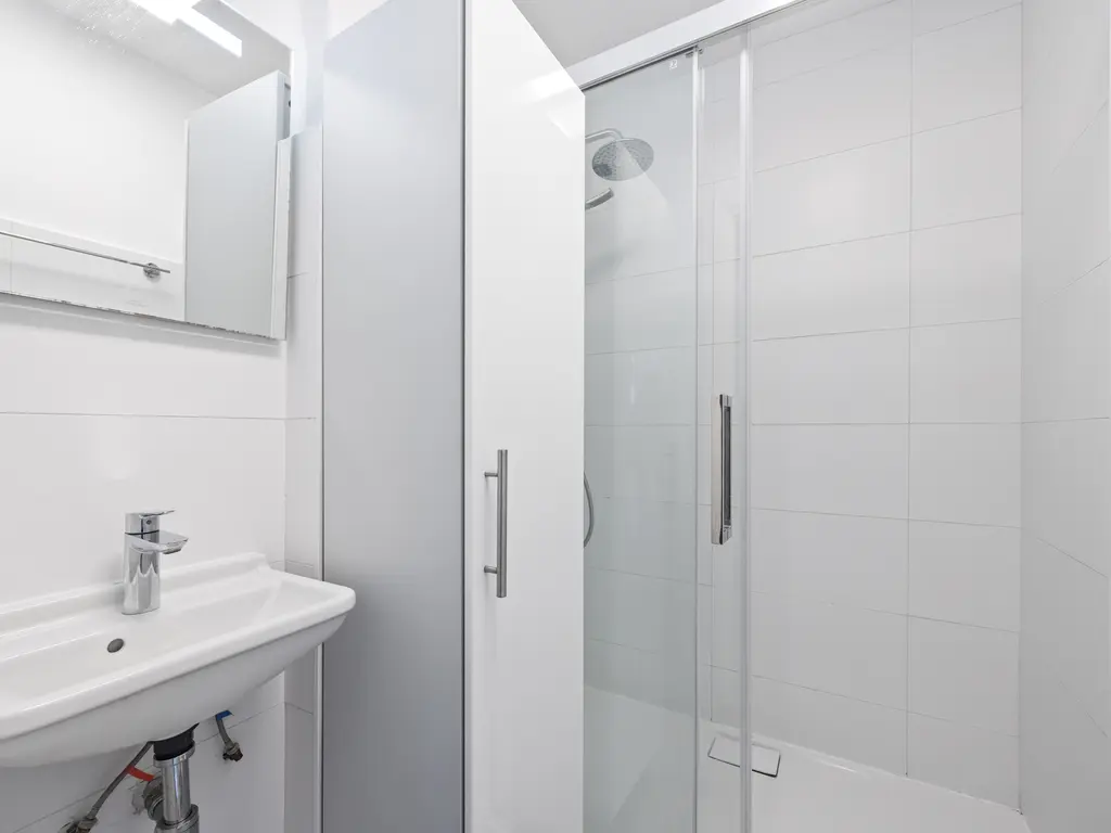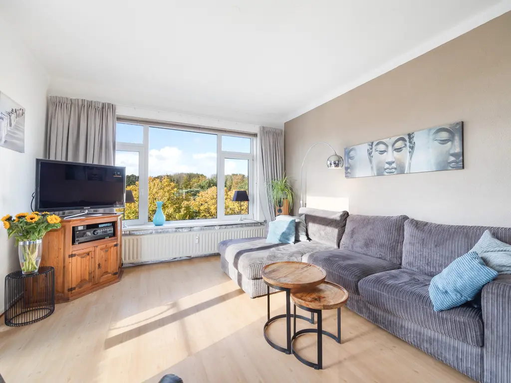 The spacious L-shaped hallway (6m²) provides access to the various rooms, including a toilet and the adjacent bathroom, equipped with a shower, washbasin with mirror, wall unit, and radiator. The living/dining room, thanks to its former en-suite layout, is generously sized at 31m². The ceiling height is 2.79 meters. A porthole window is located in the side wall. The balcony (with balcony cupboard!) at the rear faces southeast, while the balcony on the side wall faces southwest. Thanks to the numerous windows and the height, this space is bathed in light. The closed kitchen (6m²) features a six-burner gas stove with an electric oven, a built-in fridge/freezer, and a dishwasher. The kitchen also provides access to the balcony. The two bedrooms, both with wardrobe space, measure 10.4m² and 7m² respectively.