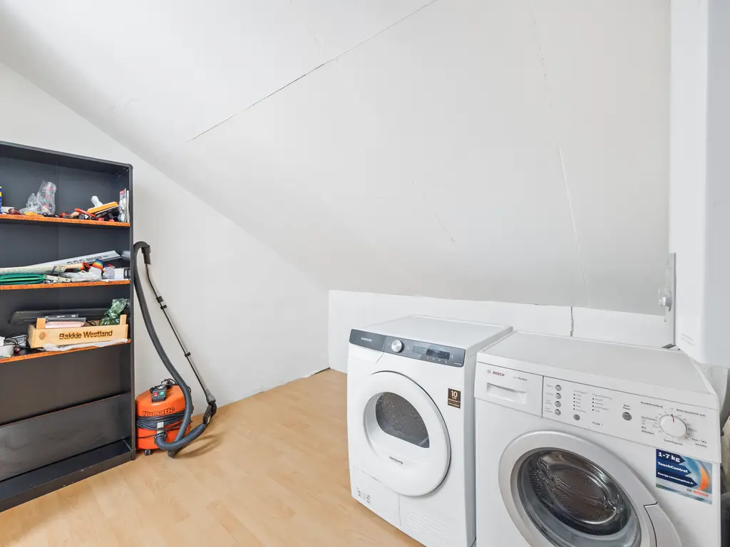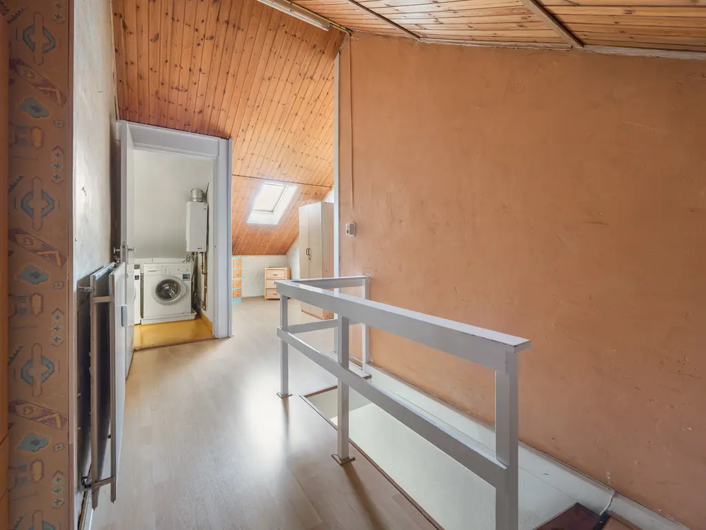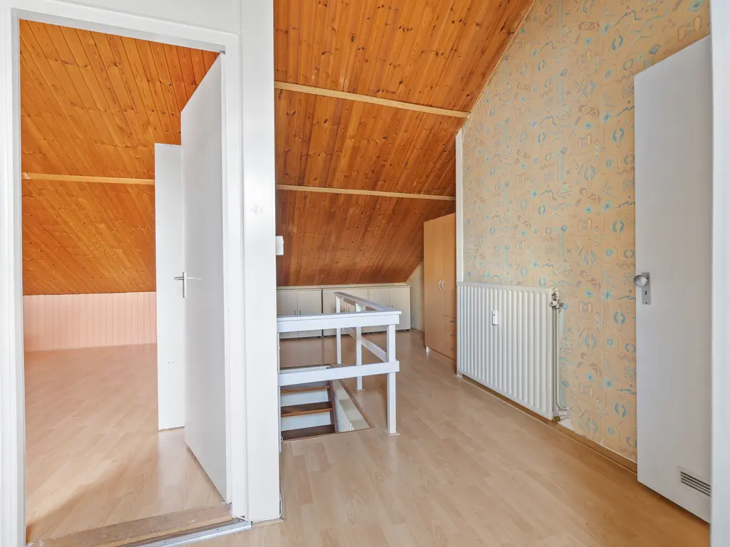 Een houten open trap in de hal komt uit op de zolderetage die desgewenst ‘vrij’ is in te delen. Momenteel bevinden zich hier twee ruime kamers, van resp.19.5m² en 13m². De ‘kleinste’ van deze twee vertrekken is momenteel in gebruik als wasruimte. Hier bevindt zich ook de installatie voor het warme water. Daglicht op deze verdieping wordt verkregen door twee dakramen. Deze verdieping leent zich overigens prima voor het plaatsen van meerdere dakkapellen.
