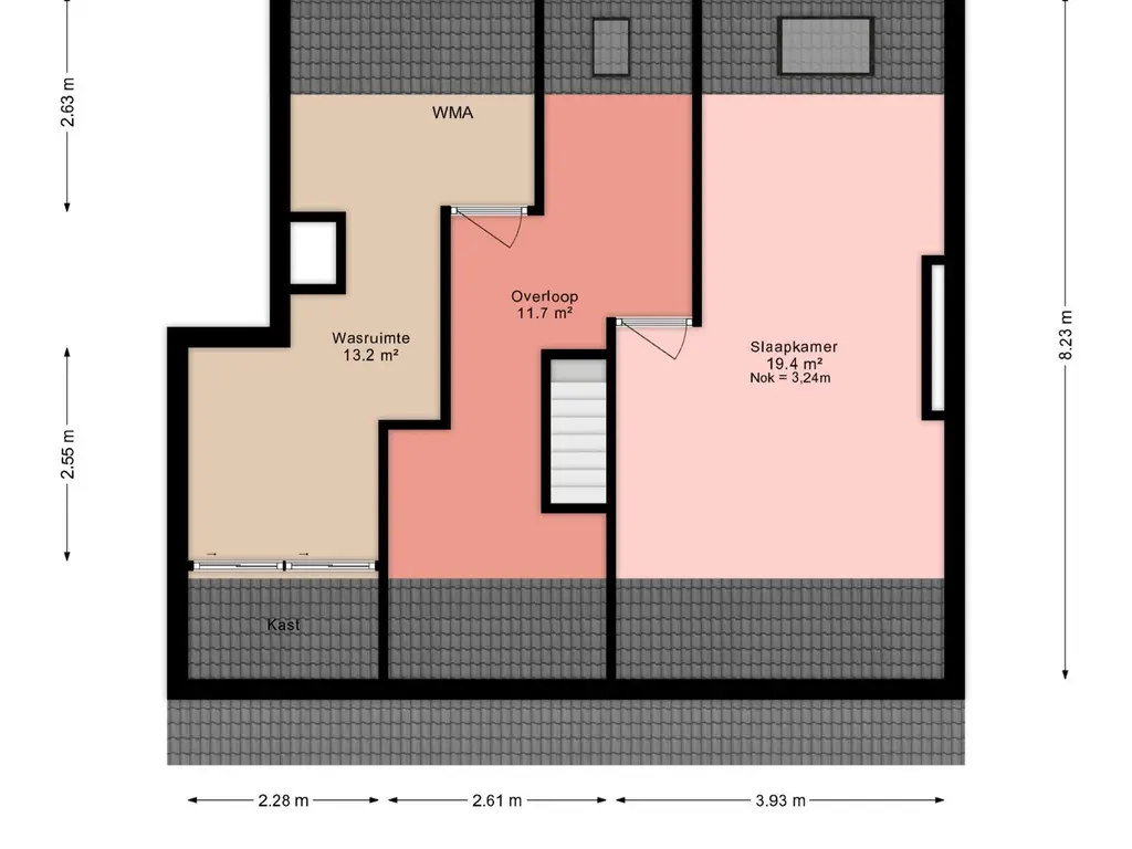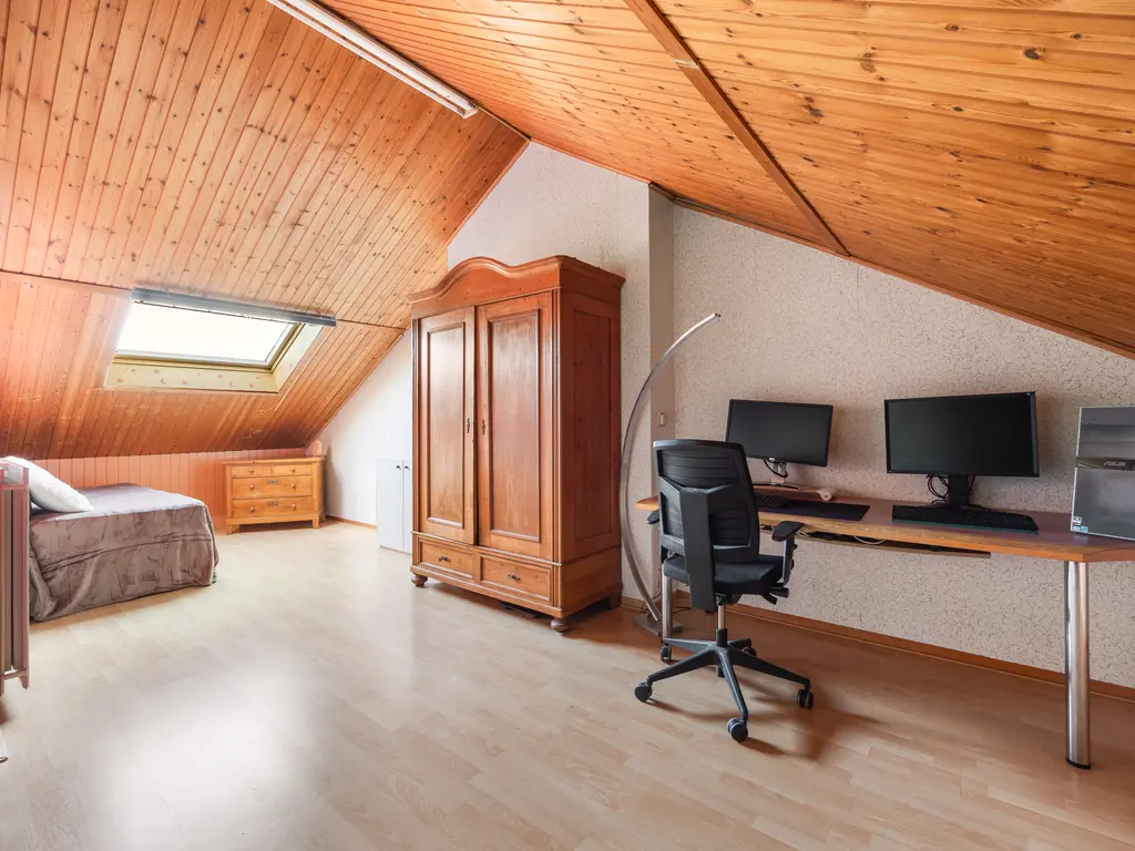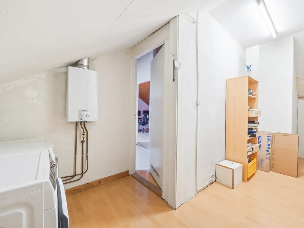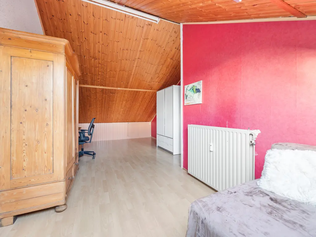 A wooden open staircase in the hallway leads to the attic floor, which can be freely configured. Currently, there are two spacious rooms here, measuring 19.5m² and 13m² respectively. The smaller of these two rooms is currently used as a laundry room. This is also where the hot water system is located. Natural light on this floor is provided by two skylights. This floor is also ideal for the installation of multiple dormer windows.