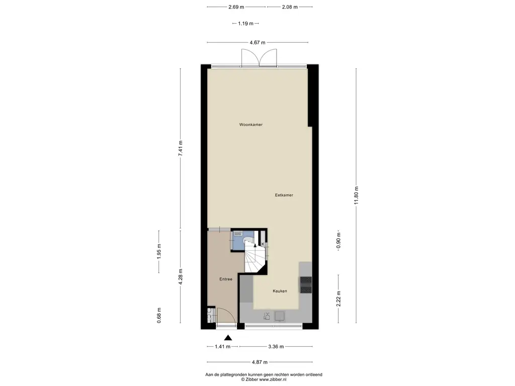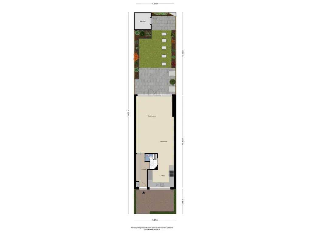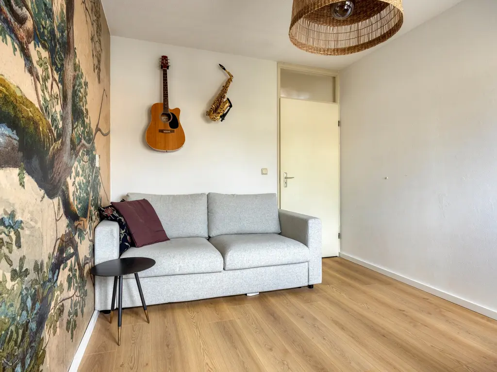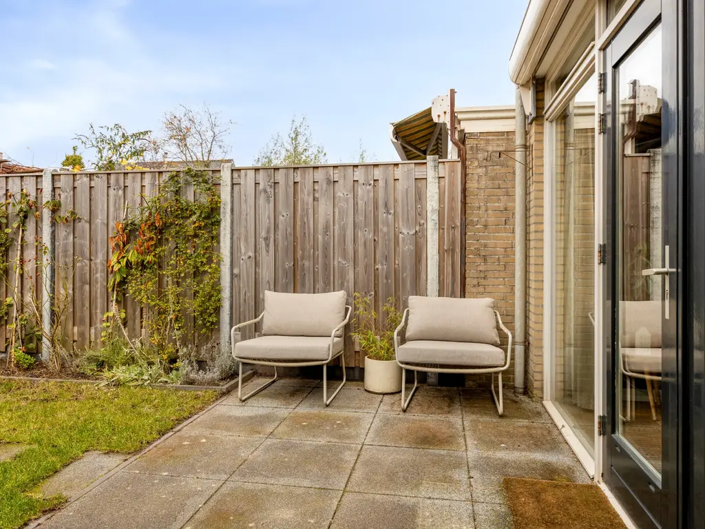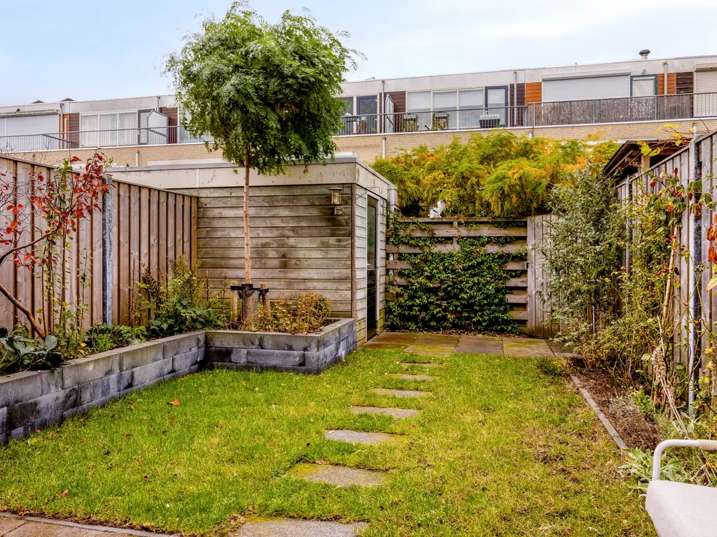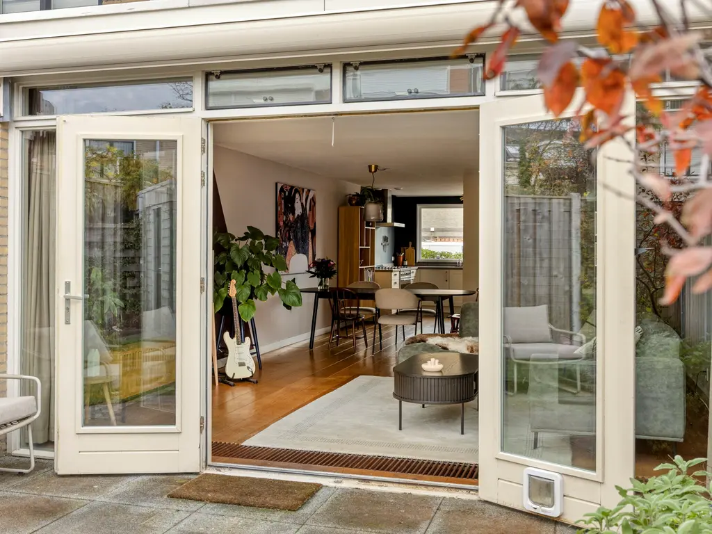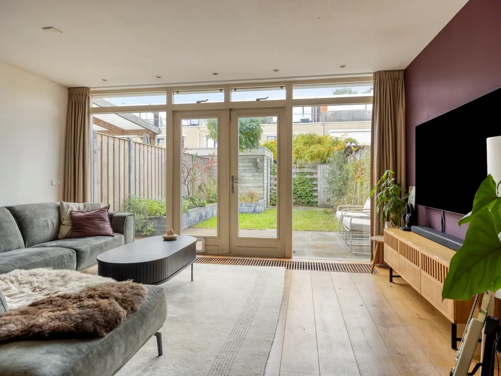 Entree met hal, meterkast, modern toilet met fonteintje en trapopgang naar de eerste verdieping. De royale, aan de achterzijde uitgebouwde woonkamer is heerlijk licht en biedt via openslaande deuren toegang tot de zonnige achtertuin op het westen. De tuin beschikt over een zonnescherm, berging en achterom – ideaal voor fietsen of tuinspullen.
